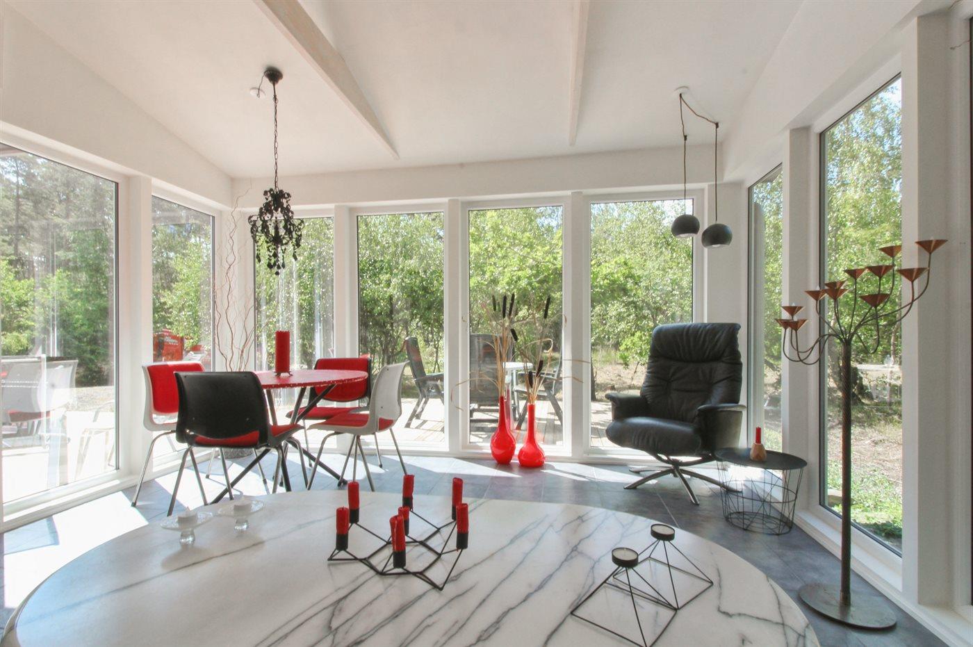 Virkelig flot feriehus i sten med en flot træbeklædt tilbygning. Store terrasser omgiver en stor del af huset og overdækket terrasse med fin møblering - spisebordsarrangement og loungesæt, så man kan nyde hele dagen ude i solskinnet. Huset er istandsat løbende og med nyt badeværelse (2025), og med udbygningen af den fine udestuedel, der er opvarmet i 2023. Master bedroom er særdeles rummeligt. Alt fremstår virkelig velplejet og indbydende.