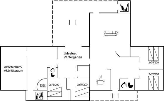 Huset er godt indrettet med bl.a. aktivitetsrum og en hyggelig opholdsstue. At spise sammen i den store familie, ofte flere generationer, kan være en virkelig rar fornøjelse og det, at se TV sammen er tit noget, der hører ferietiden til, da alle jo har travlt med hver sit. I dette hus er der plads til både store og små, til leg, hygge, spil og udendørsaktiviteter på den store terrasse eller græsgrunden, der hører til huset. Der er god plads i P-arealet til flere biler.
