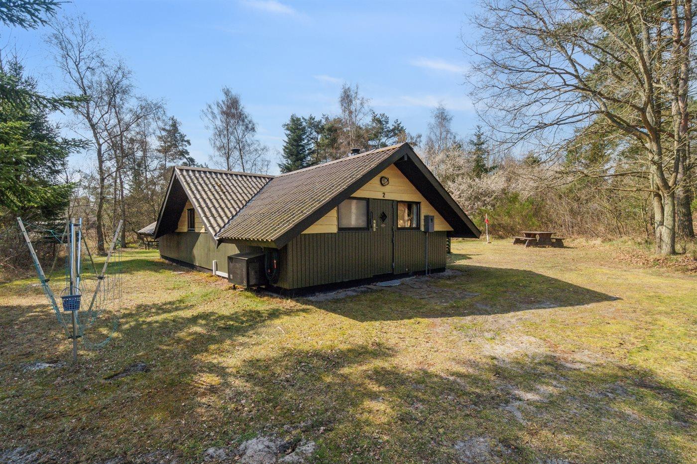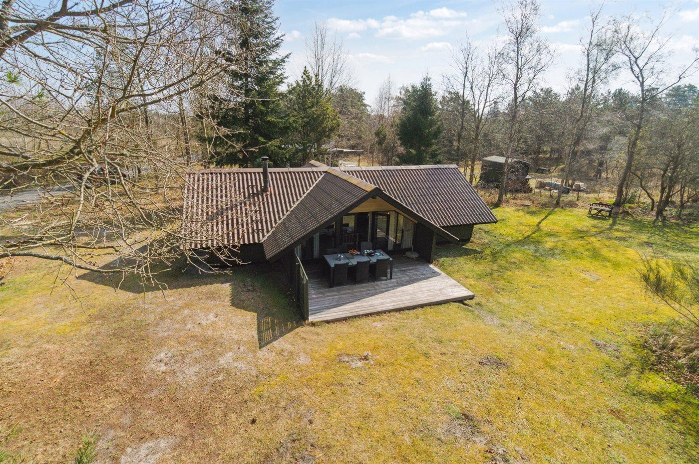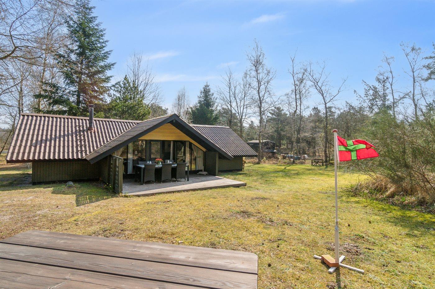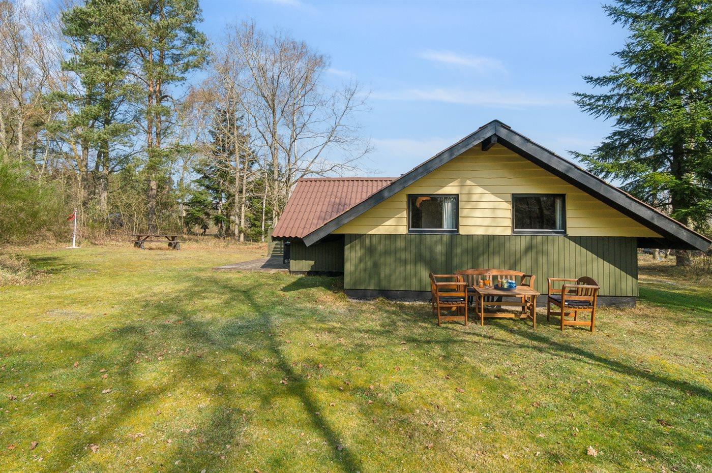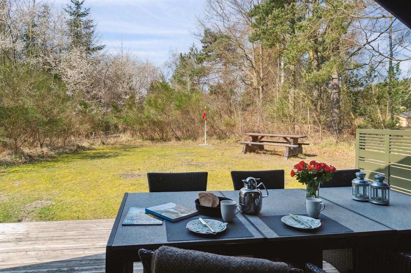 Huset ligger på en større åben grund med græsbevoksning. Delvis overdækket terrasse kan fange solen om eftermiddagen, så freden, roen og naturen kan nydes i fulde drag.