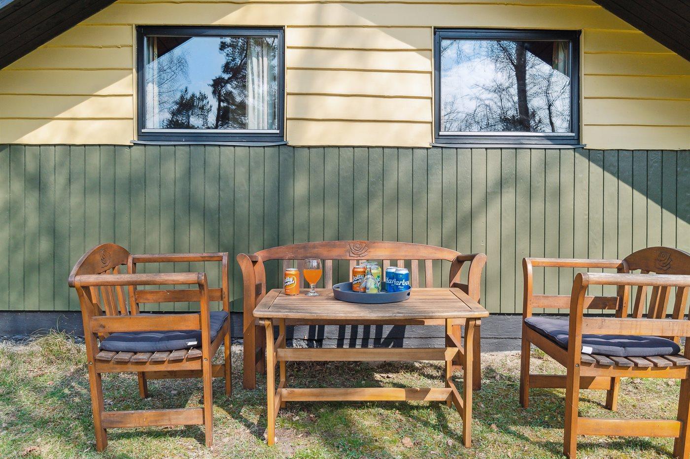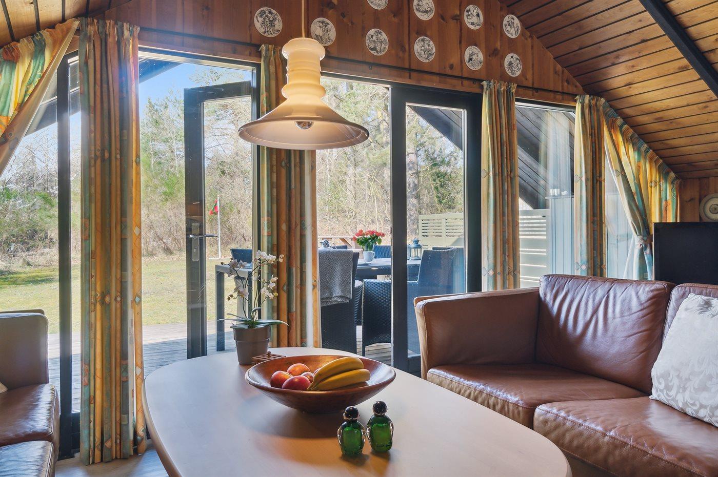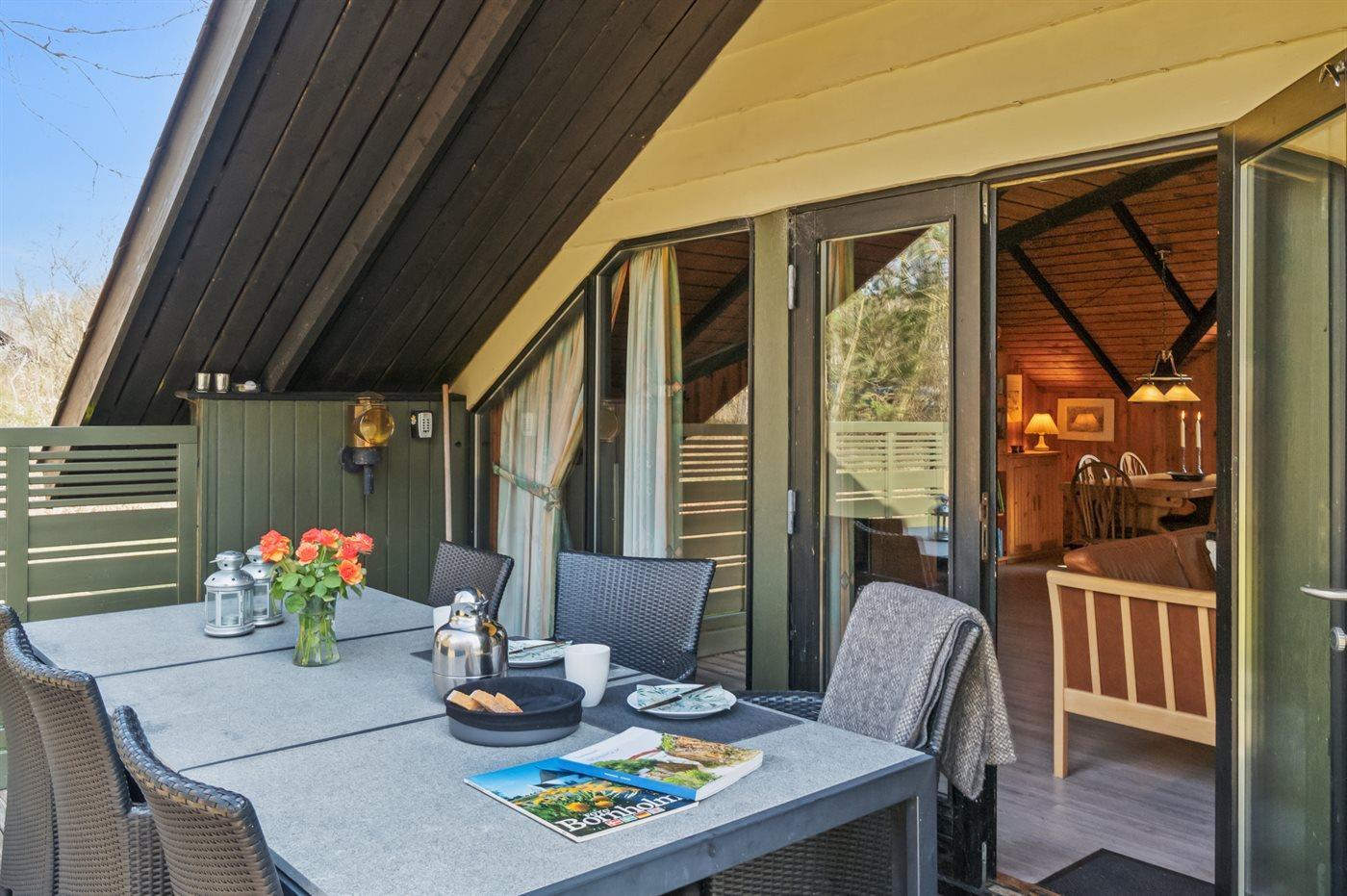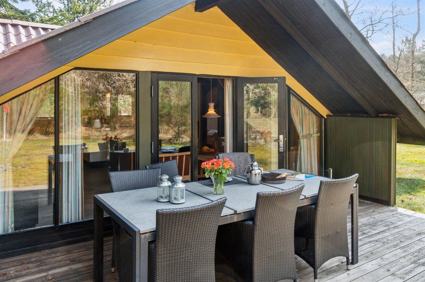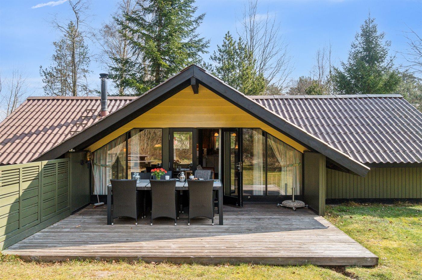 Huset ligger på en større åben grund med græsbevoksning. Delvis overdækket terrasse kan fange solen om eftermiddagen, så freden, roen og naturen kan nydes i fulde drag.