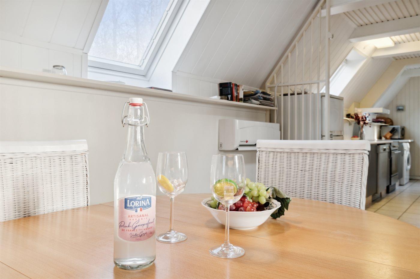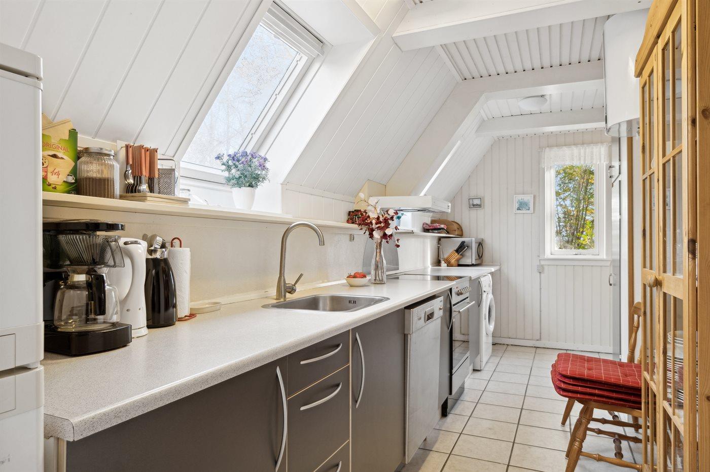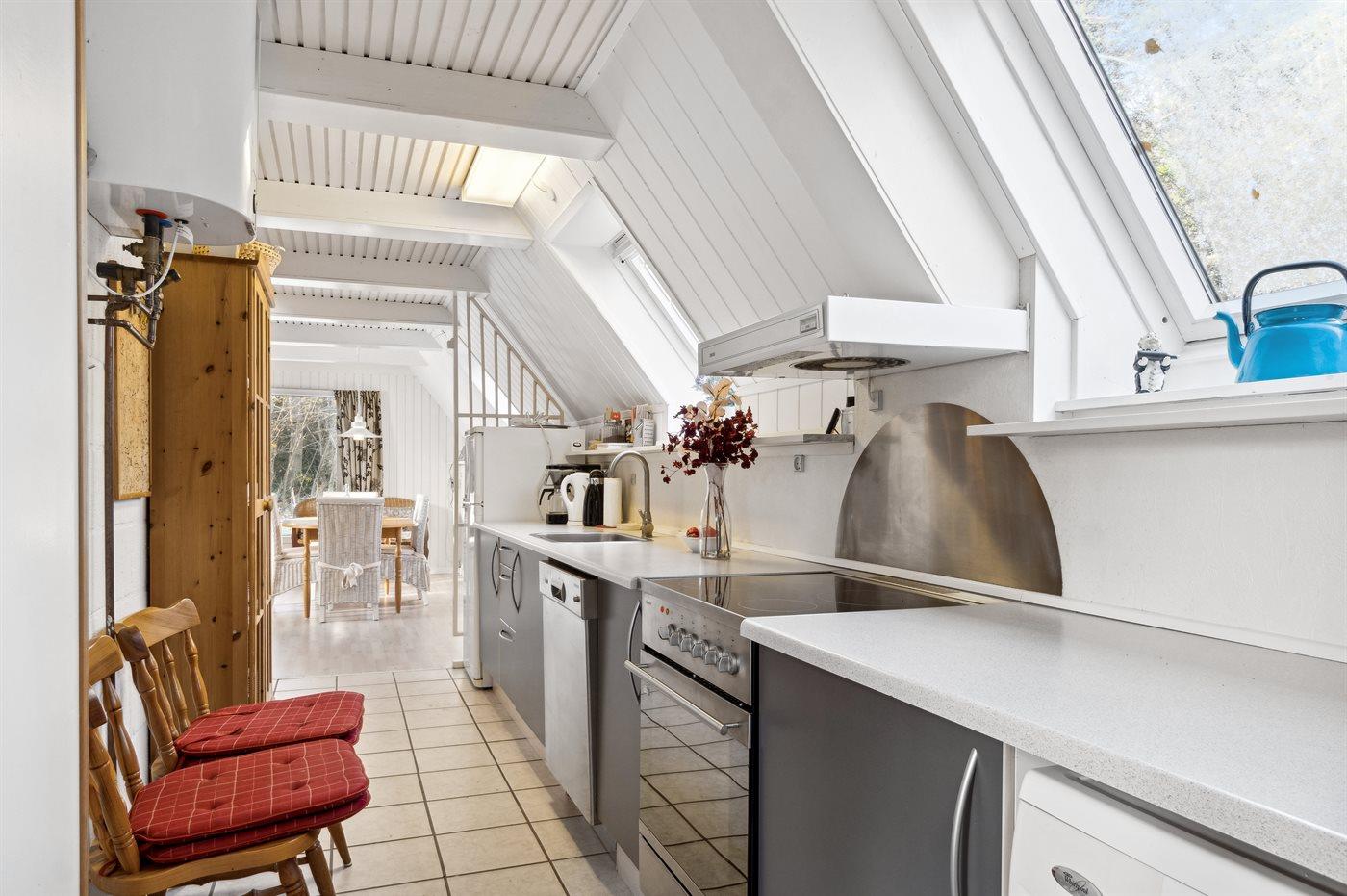 Køkkenet er udstyret med 1 køleskab. Der er 4 keramiske kogeplader, varmluftovn, mikrobølgeovn samt opvaskemaskine.