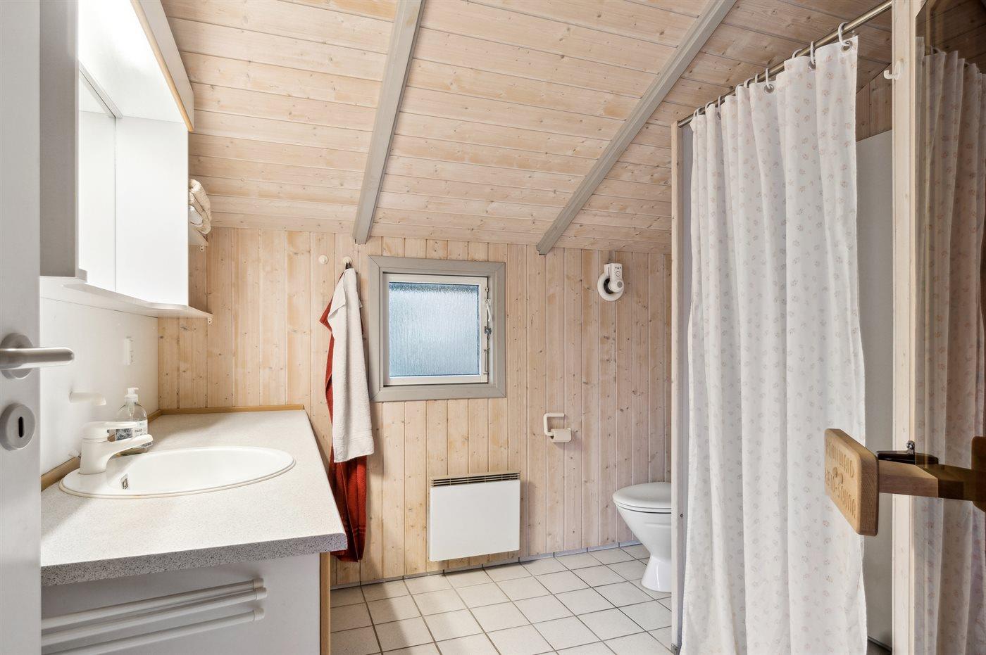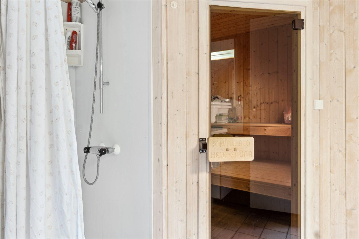 Der er 1 badeværelse med bruser og 1 toilet.. Der er gulvvarme på 1 badeværelse. I saunaen er der mulighed for afslapning.