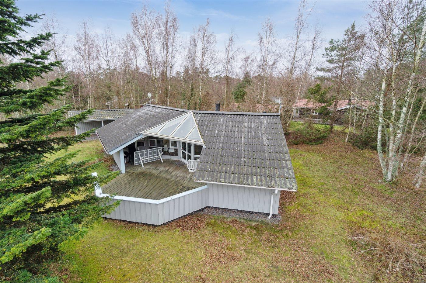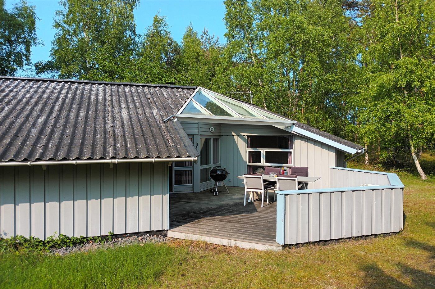 Feriehuset er omgivet af en grund med plæne omkranset af træbevoksning, så man ugeneret kan nyde den delvis overdækkede træterrasse, der er lettere afskærmet. I bryggers/entré er der både vaskemaskine og tørretumbler, og man træder derefter ind i et velfungerende køkken, der er indrettet, så man kan udføre sine sysler, mens familien kan nyde opholdet i den store stue, hvorfra der er direkte udgang til terrassen.