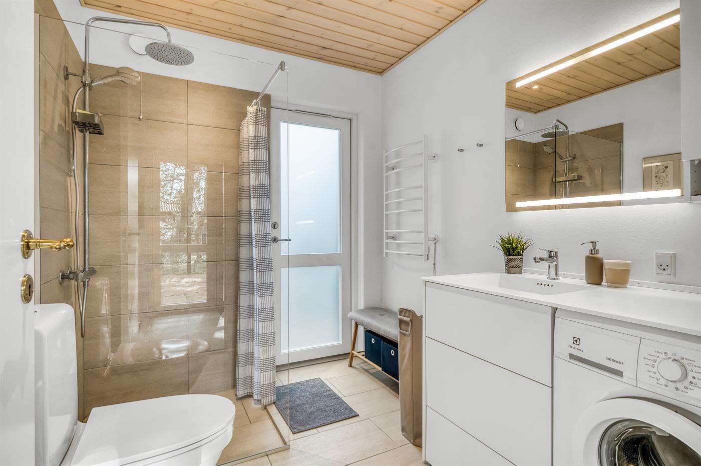 Sommerhuset har et badeværelse med bruseniche samt et ekstra gæstetoilet. Til opvarmning og komfort er huset udstyret med både brændeovn og energibesparende varmepumpe. Der er også vaskemaskine.