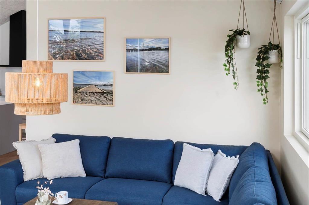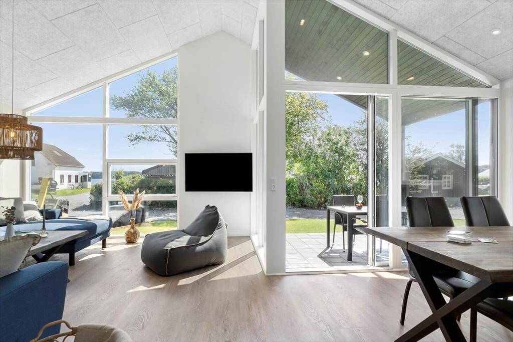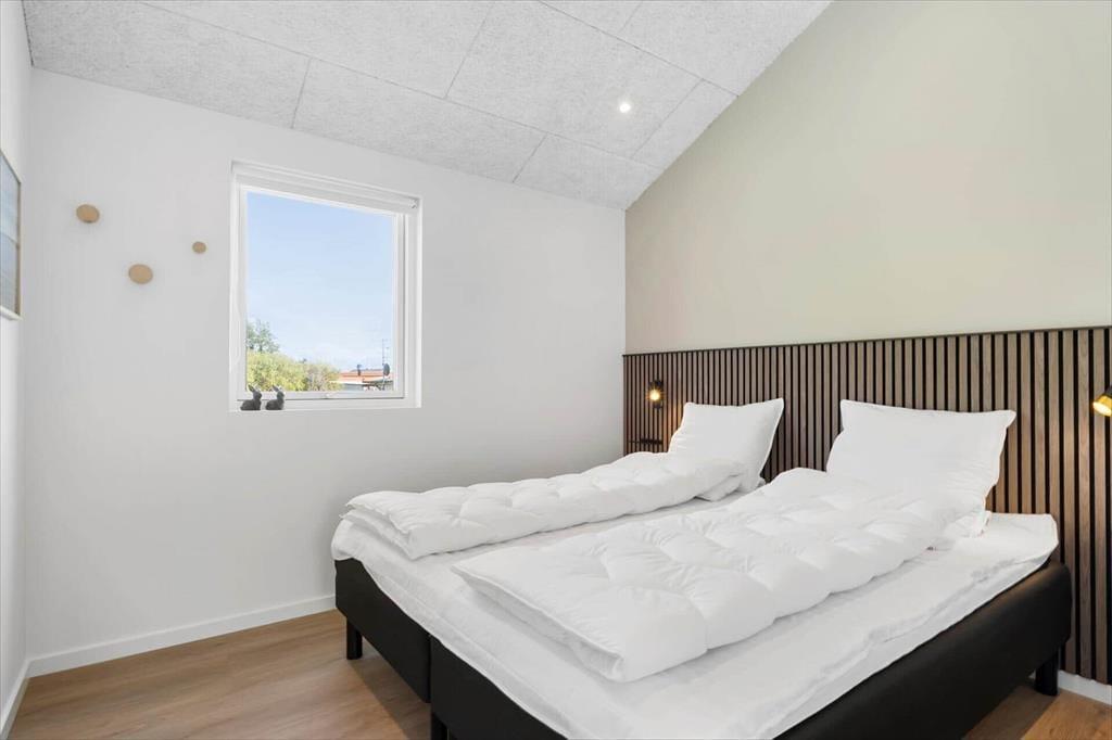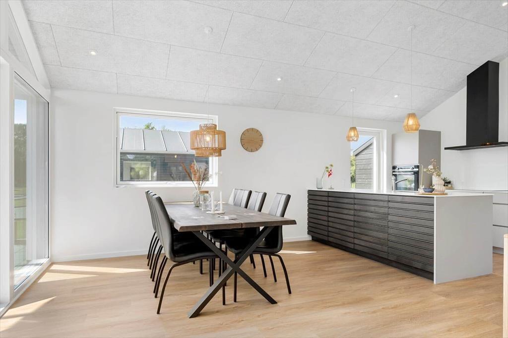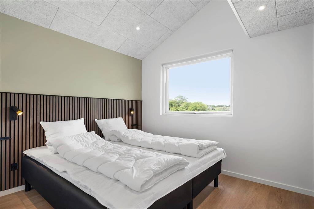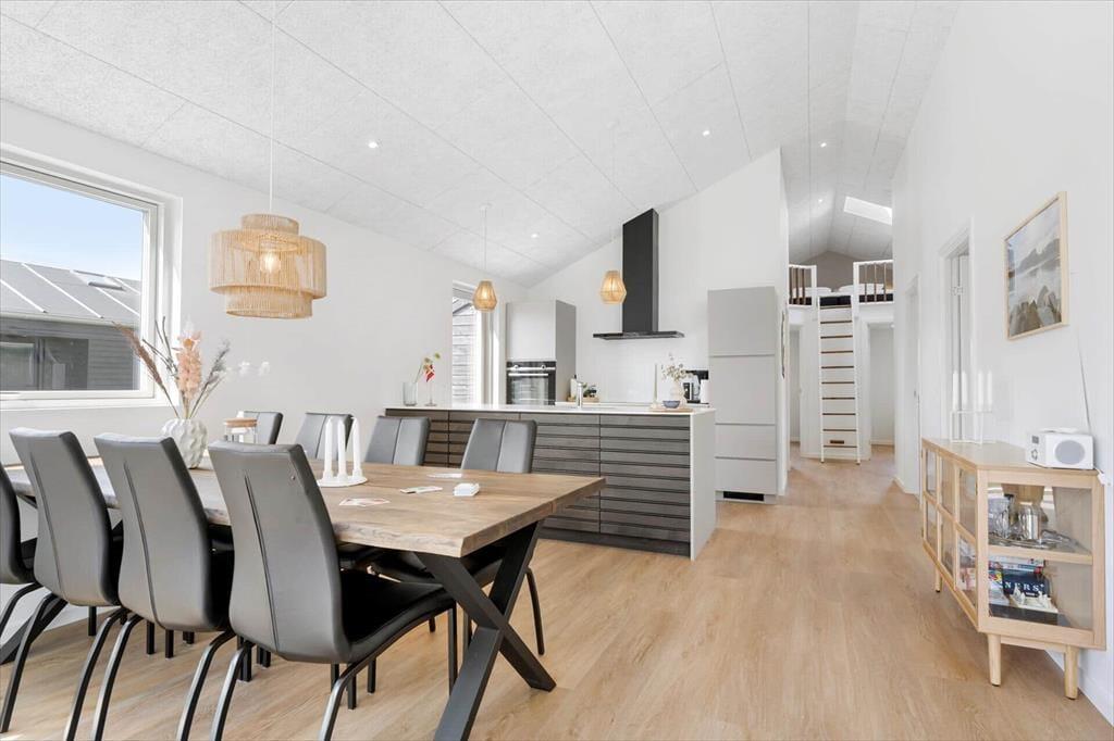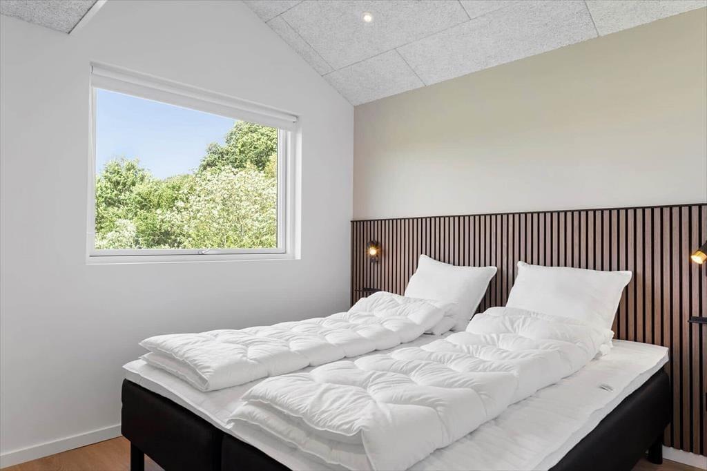 Det 110 m2 store sommerhus passer ideelt til tilbagelænet afslapning og socialt samvær, for det føles skønt at opholde sig i stilfulde, komfortable og funktionelt gennemtænkte rammer. Oplevelsen højnes selvfølgelig også af de smukke naturomgivelser. Planløsningen byder på tre rummelige soveværelser med komfortable dobbeltsenge og en stor hems, hvor der er plads til to personer. Det åbne køkken og stuen har loft til kip, hvilket skaber en rummelig og lys atmosfære. Køkkenet, badeværelset og bryggerset er holdt i samme varme nuancer med detaljer i mørk eg, der smukt bryder det lyse interiør. Huset har to badeværelser, hvoraf det største er udstyret med en lækker bruseniche, spabad og sauna, hvilket giver ferielivet en ekstra dimension af luksus og velvære.