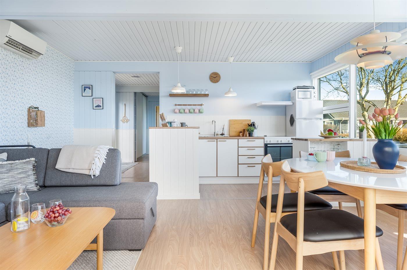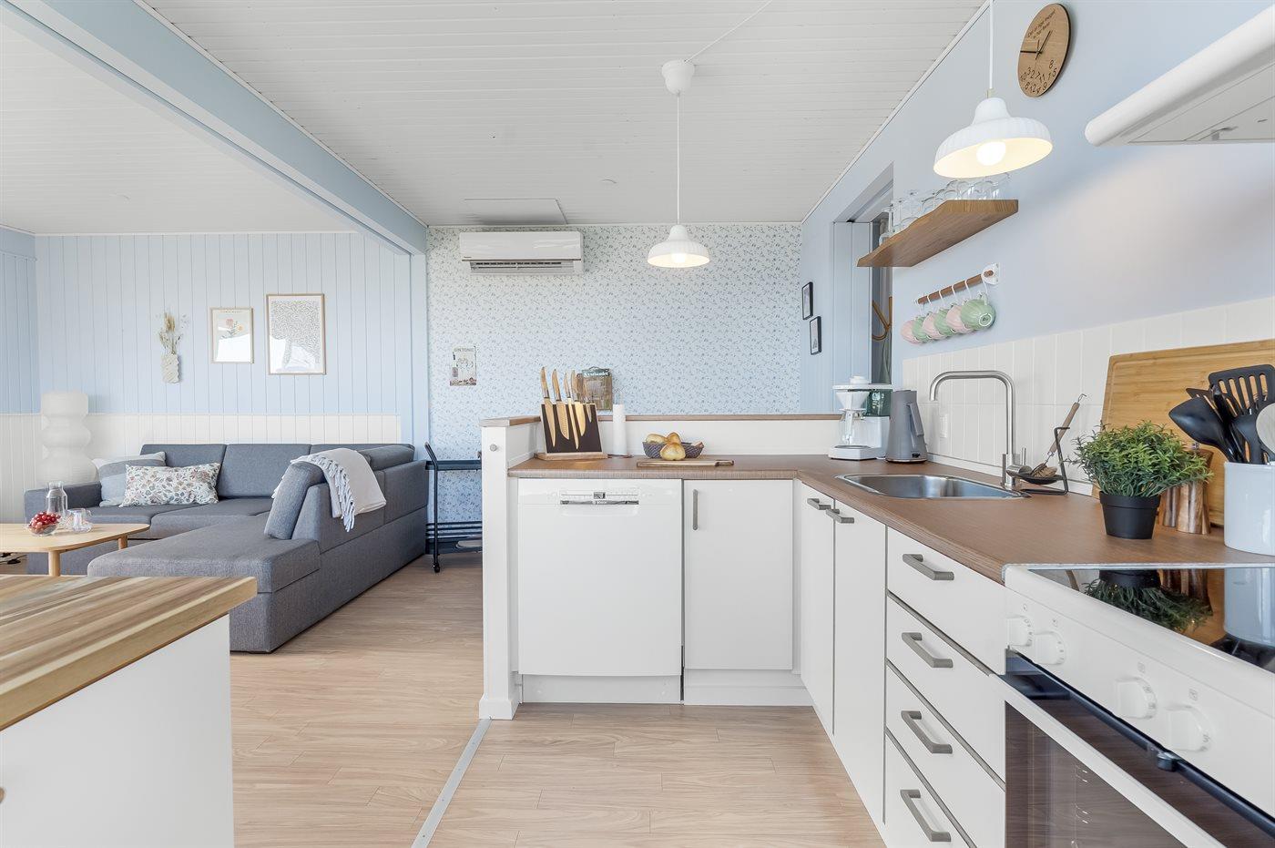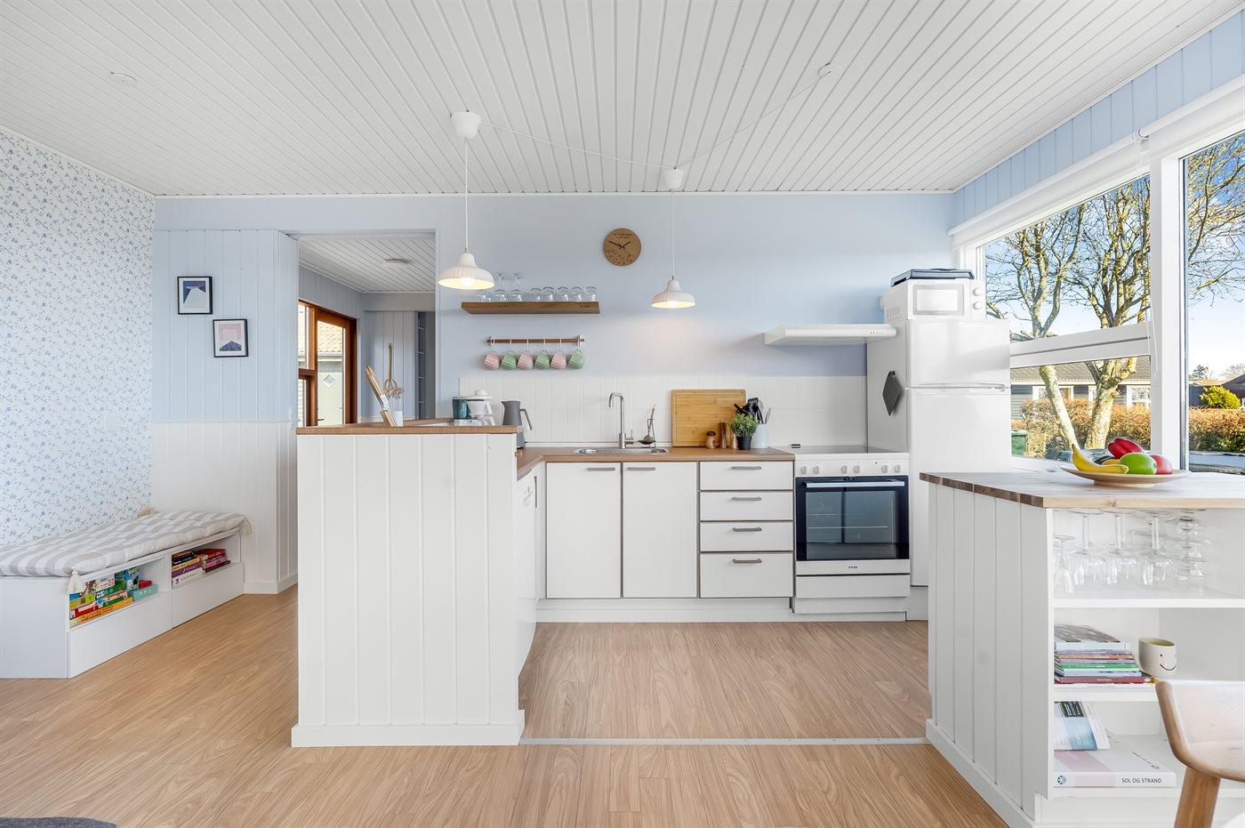 Køkkenet er udstyret med 1 køleskab. Der er 4 keramiske kogeplader, varmluftovn, mikrobølgeovn samt opvaskemaskine.