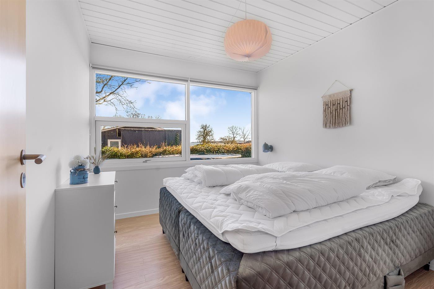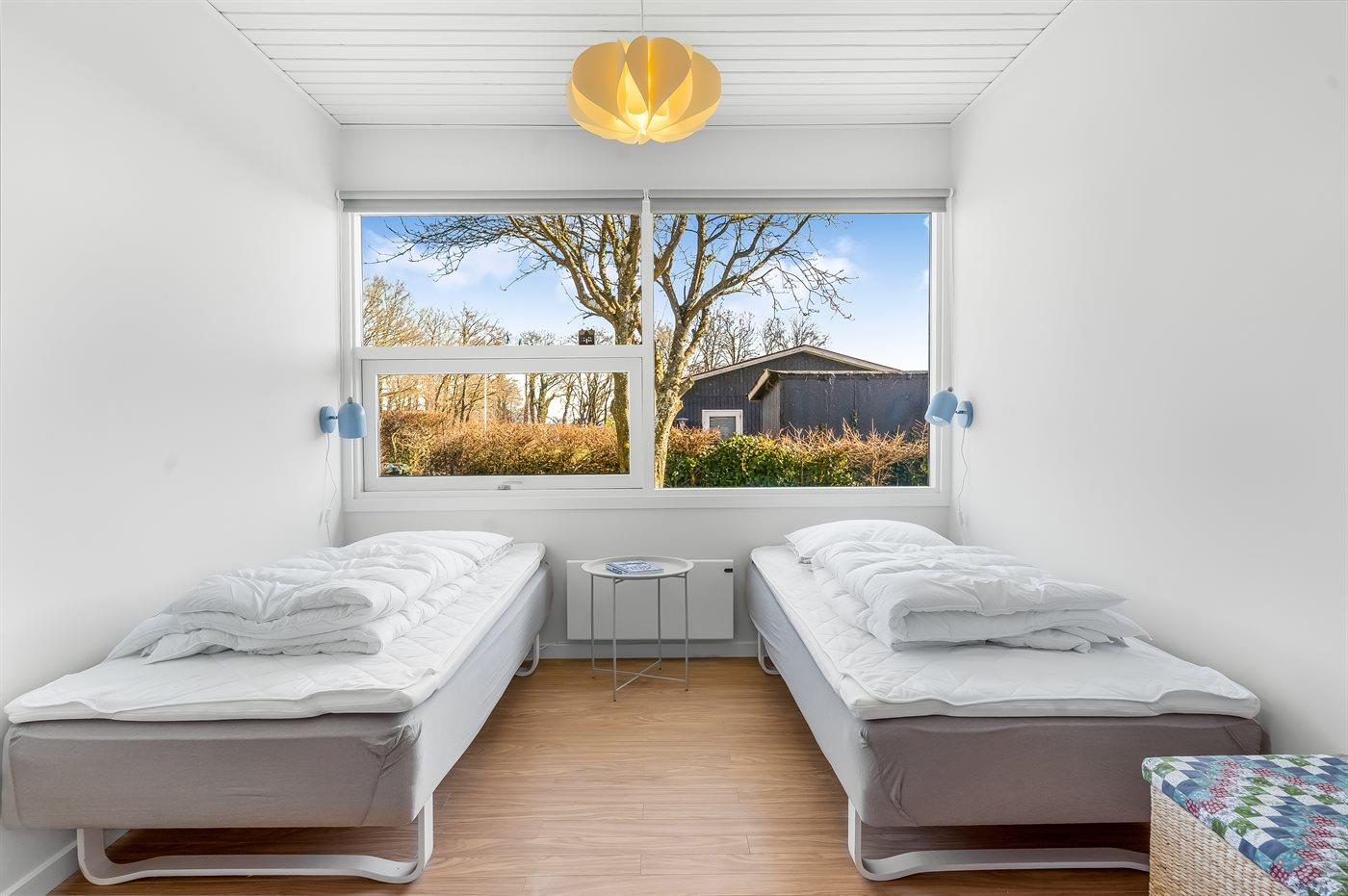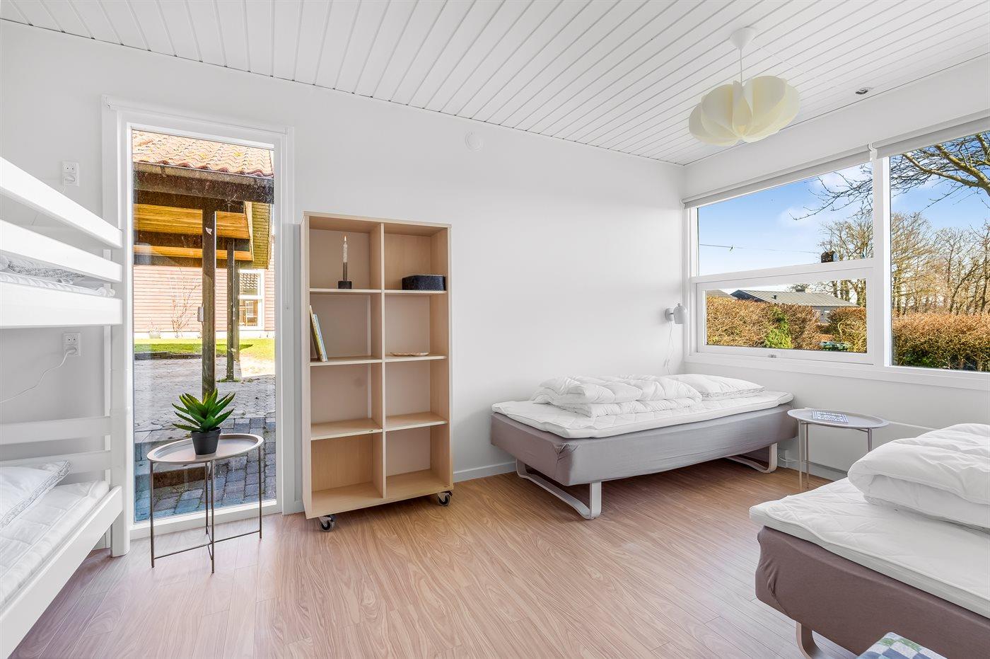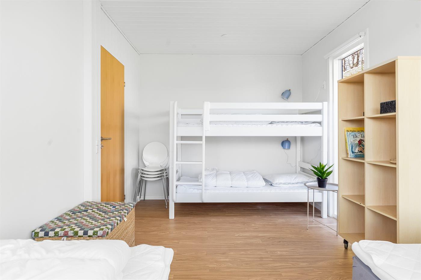 Der er i alt 2 soveværelser. Sovepladserne fordeler sig på: 4 sovepladser i dobbeltsenge. 2 sovepladser i køjeseng. Derudover er der 1 stk. barneseng.