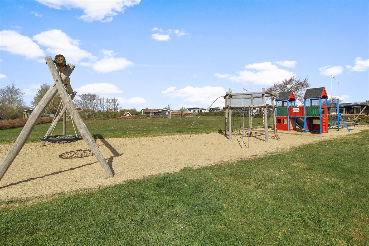 Ferieboligen er beliggende på en 500 m² stor naturgrund. Der er 150 m til havet. Nærmeste forretning er beliggende i en afstand af 1500 m. Til ferieboligen hører 20 m² terrasseareal. Desuden er der 16 m² overdækket terrasse. Trampolin. Der er carport til rådighed. Parkering ved ferieboligen.