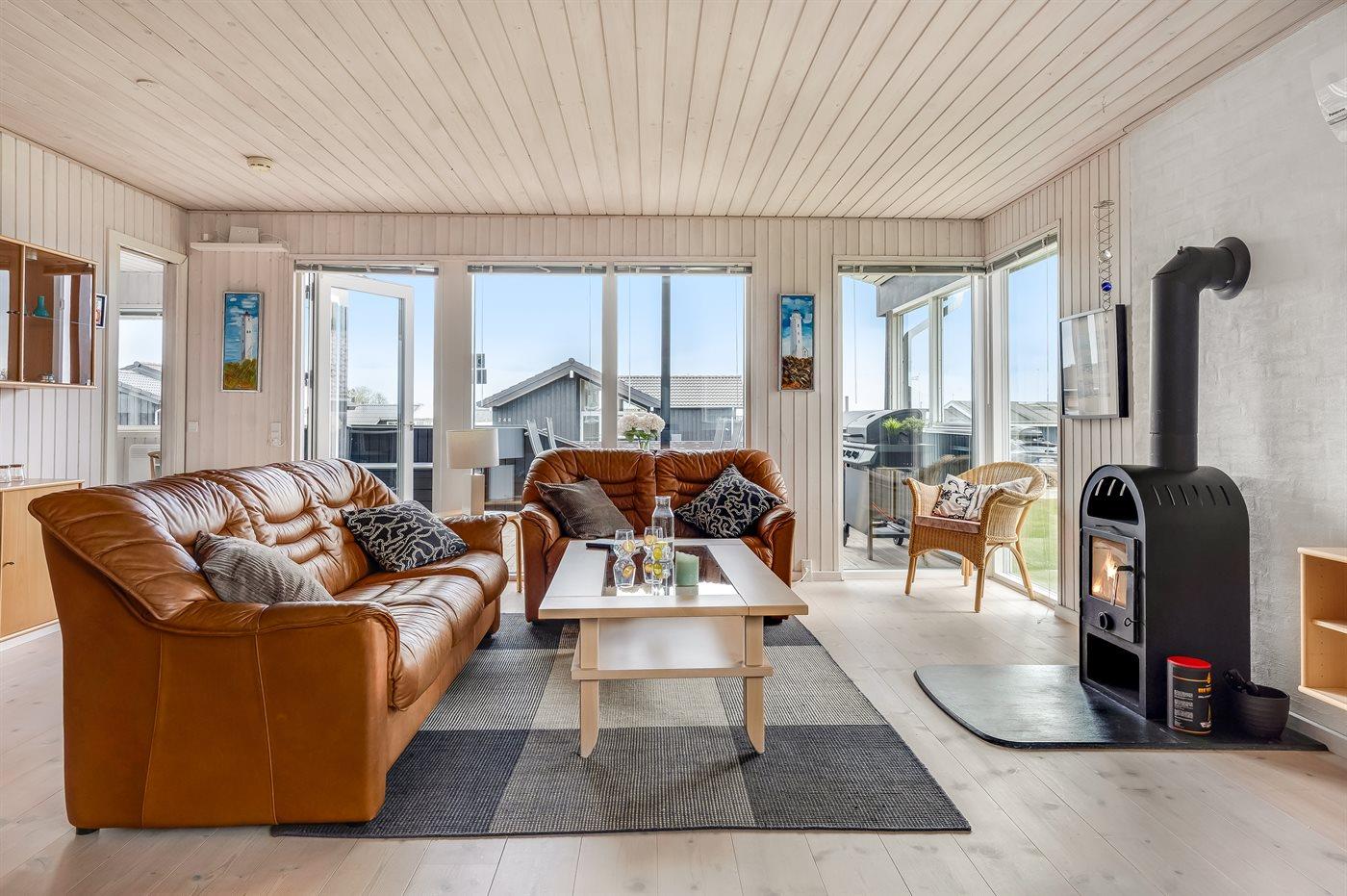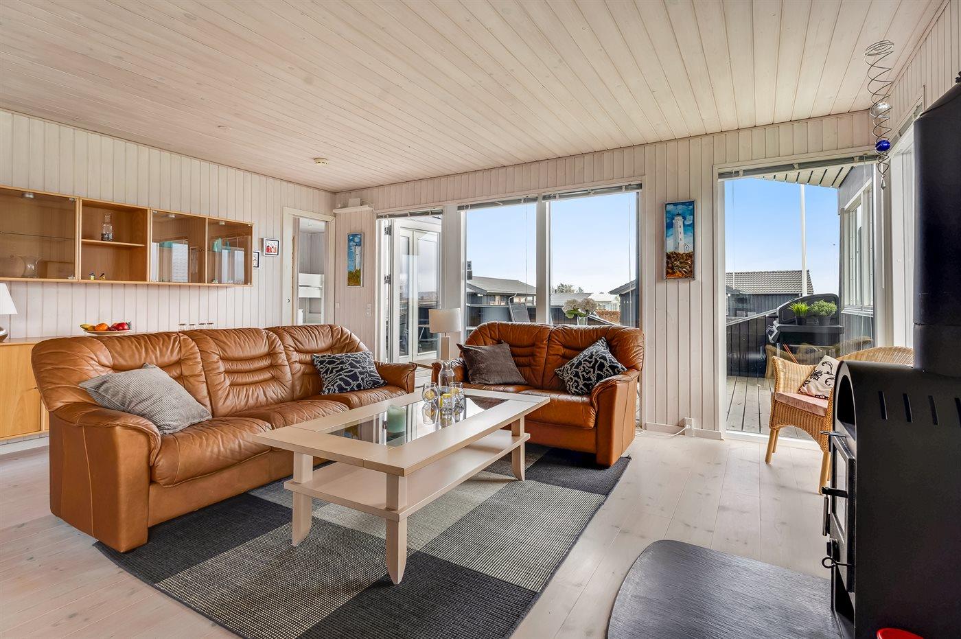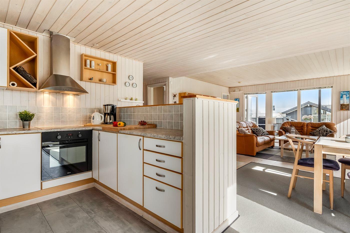 Huset har et stort, åbent køkken-alrum i forbindelse med opholdsstuen, hvorfra I kan nyde udsigten. Den samme udsigt kan også opleves fra de dejlige terrasseområder, som delvist er overdækkede. Her er der gode muligheder for at finde en læfyldt krog og nyde stilheden.