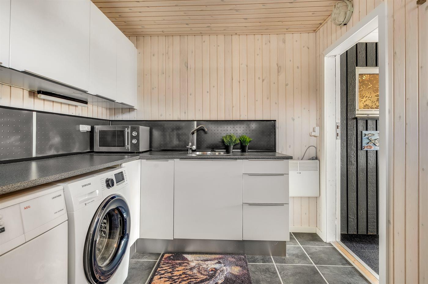 Køkkenet er udstyret med 1 køleskab. Der er 4 keramiske kogeplader, varmluftovn, mikrobølgeovn samt opvaskemaskine.