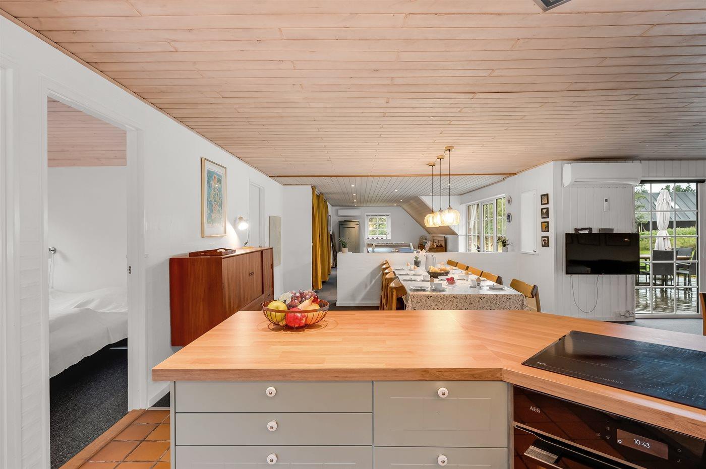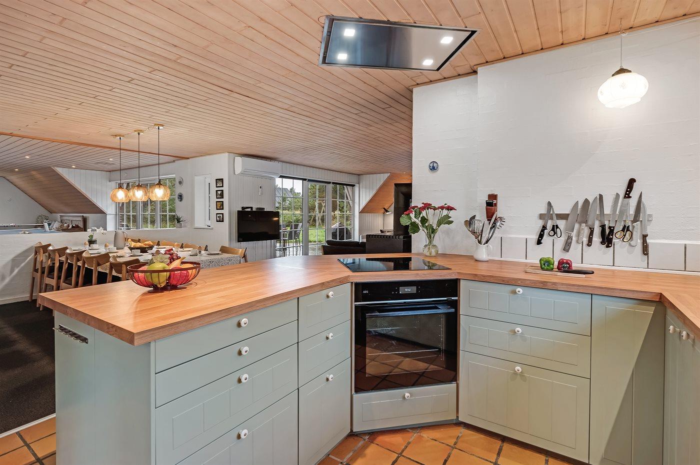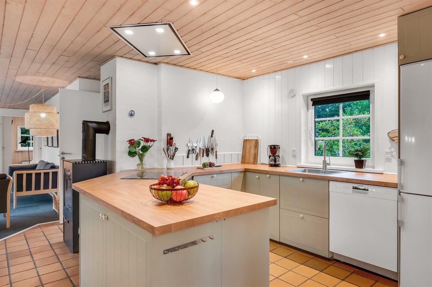 Køkkenet er udstyret med 1 køleskab. Der er 4 keramiske kogeplader, varmluftovn, mikrobølgeovn samt opvaskemaskine.