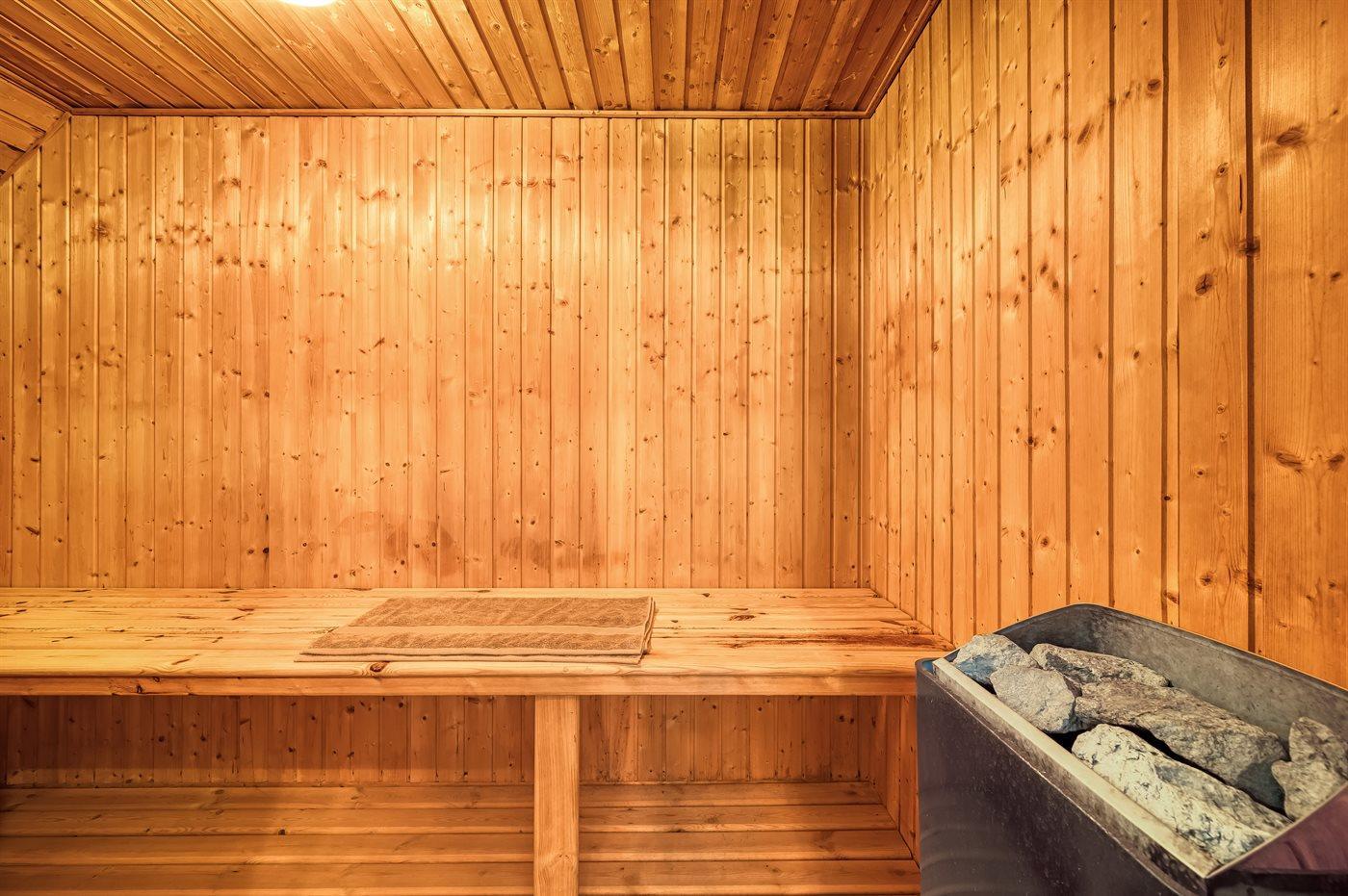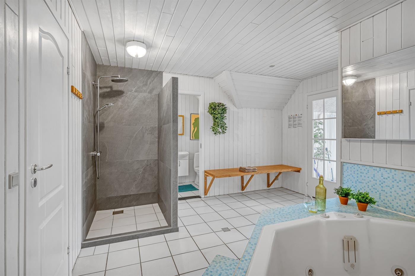 Der er 2 badeværelser med bruseniche og 2 toiletter. Der er gulvvarme på 2 badeværelser. I saunaen er der mulighed for afslapning.