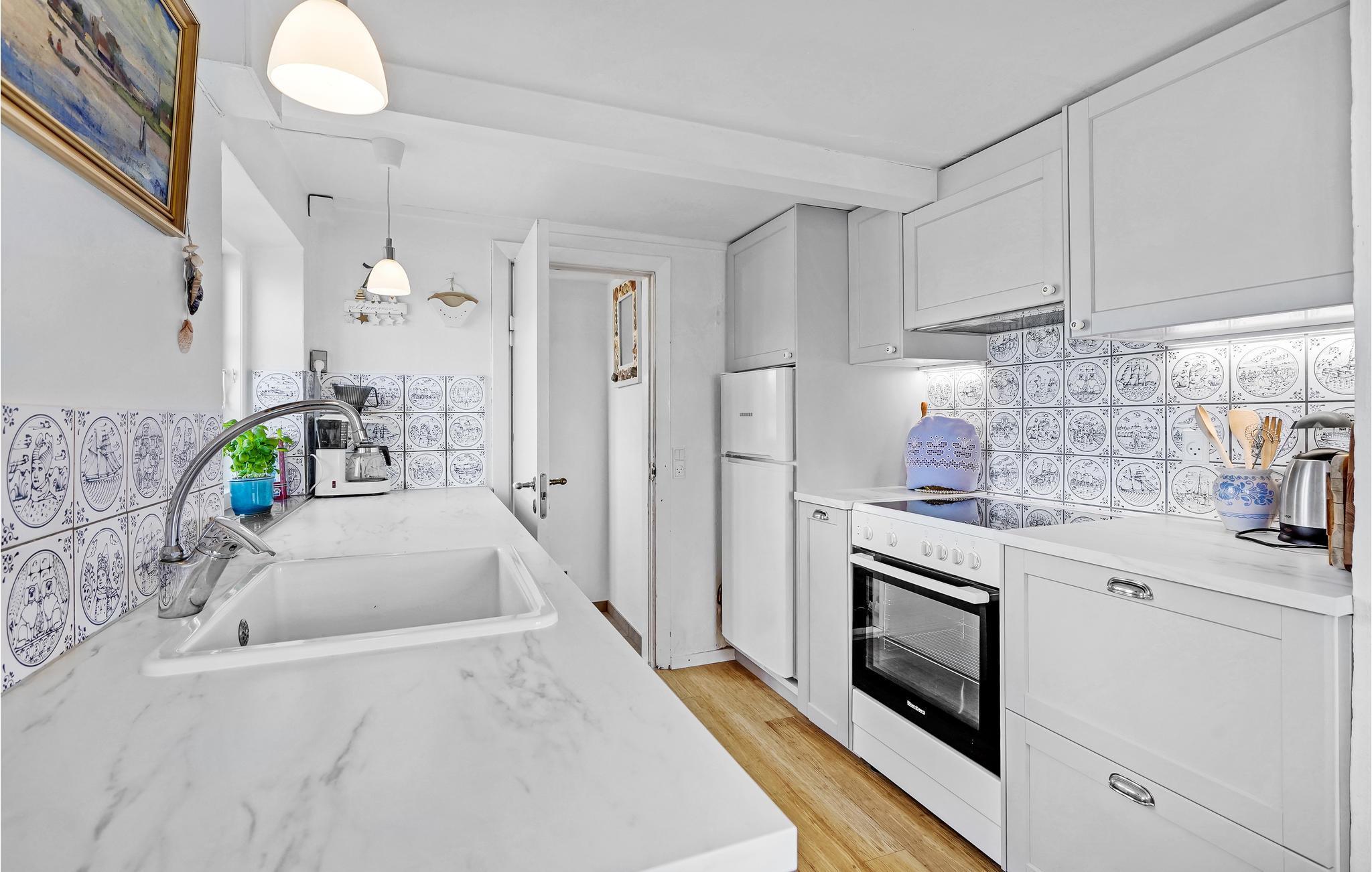 Huset er velmøbleret med komfortable og solide møbler samt en brændeovn neden for trappen. Der er plads til i alt fire personer, som kan fordele sig i de to soveværelser, og så er der et pulterkammer. Stuen ligger i åben forbindelse med det funktionelle køkken, hvor der er ovn/komfur, køleskab og opvaskemaskine. Her kan I sammensætte lækre retter til hyggelige middage. Gangen og badeværelset har gulvvarme. Der er gode terrasser med havemøbler uden for huset.
