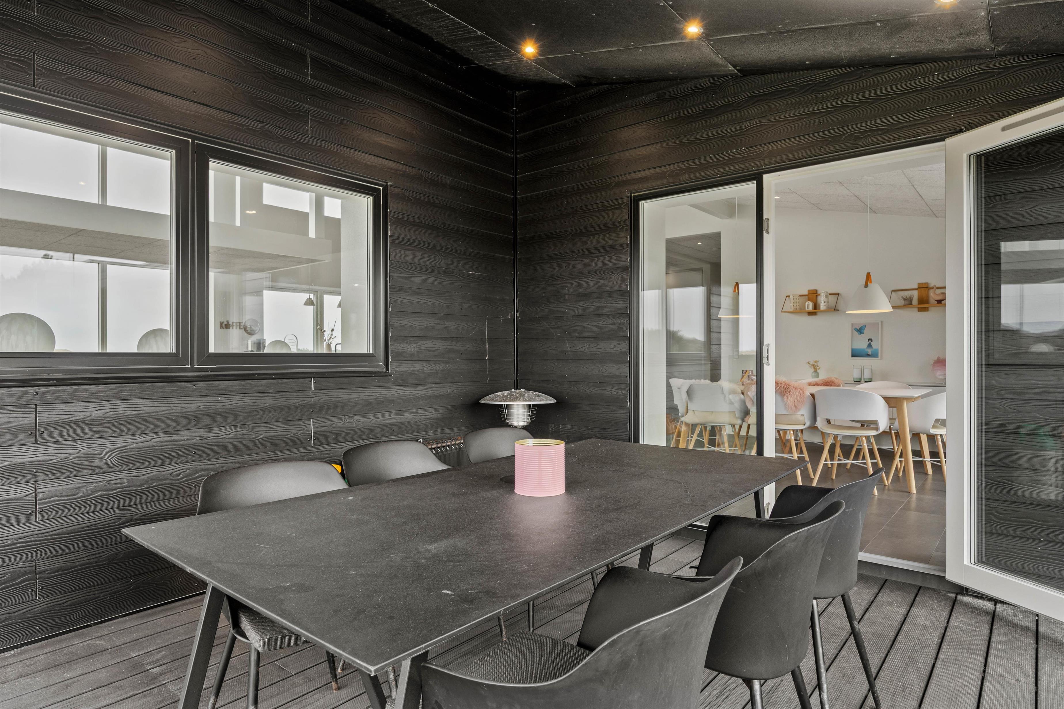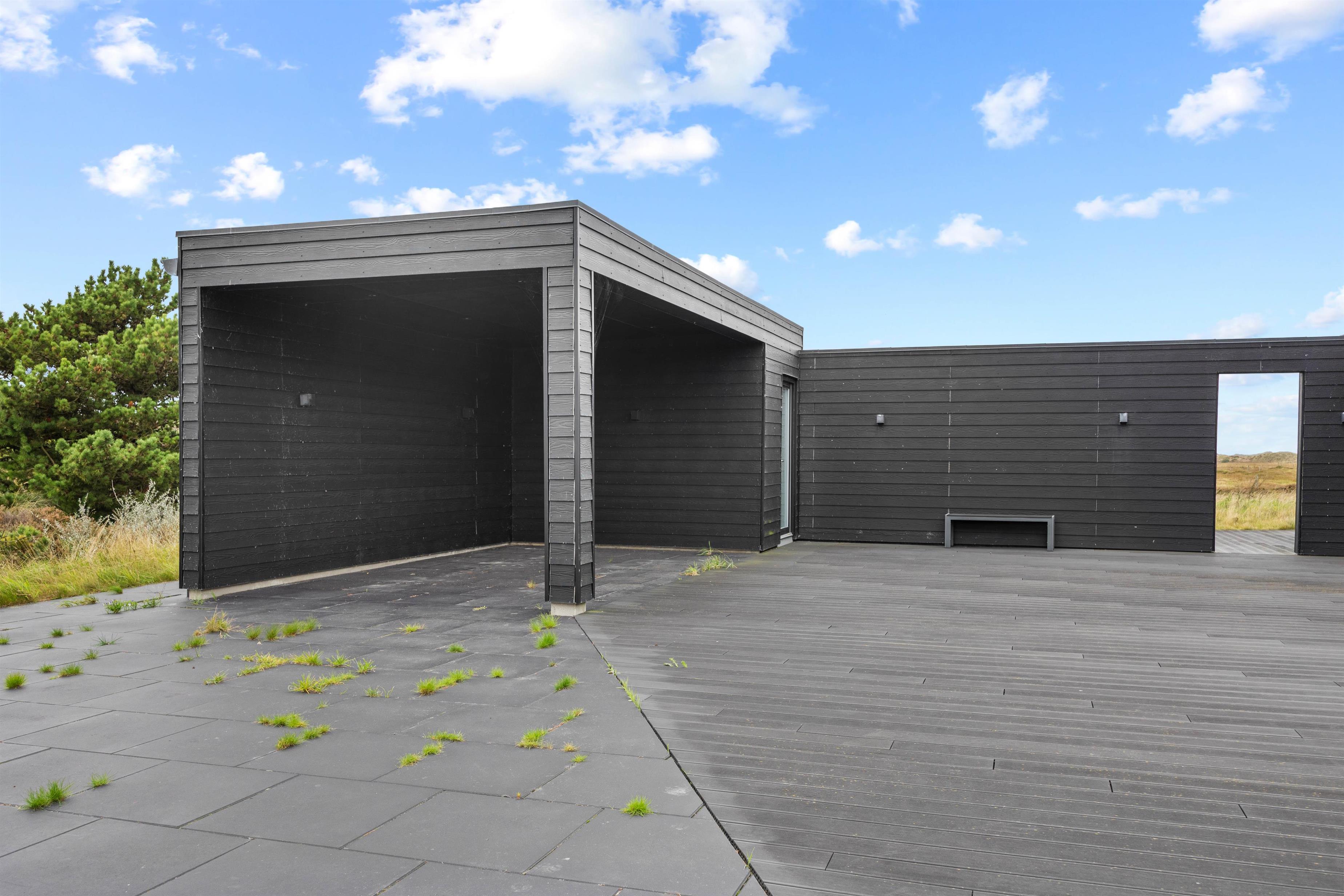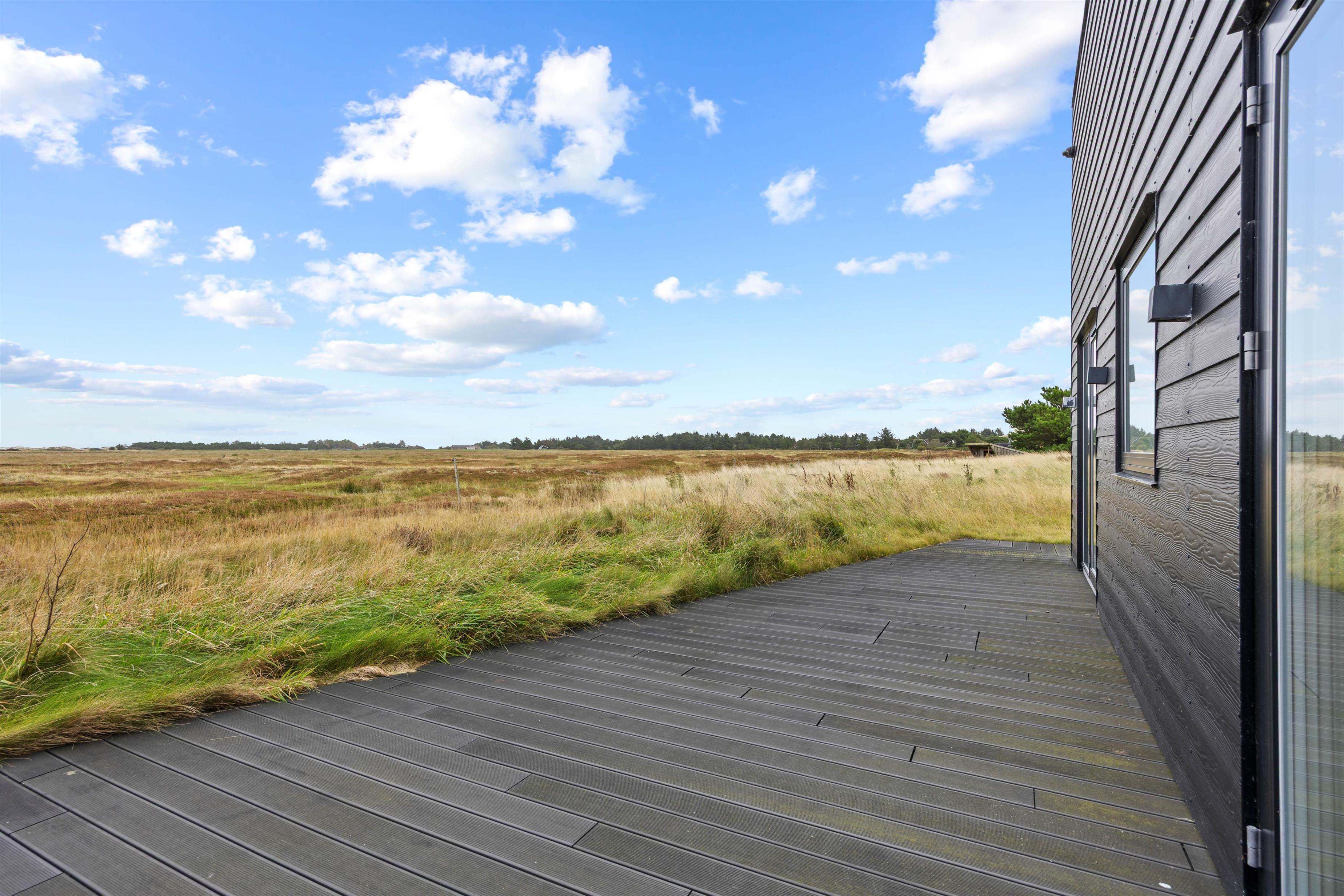 Foran feriehuset finder I et stort udendørsområde, der er delvist afskærmet, og hvor I kan tilbringe mange hyggelige timer. Fra stuen har I adgang til den overdækkede terrasse, hvor I kan holde hyggelige grillaftener, mens I nyder udsigten over den enestående natur. I har gasgrill til rådighed, så der altid er mulighed for en impulsiv grillaften imens skyggerne bliver lange.