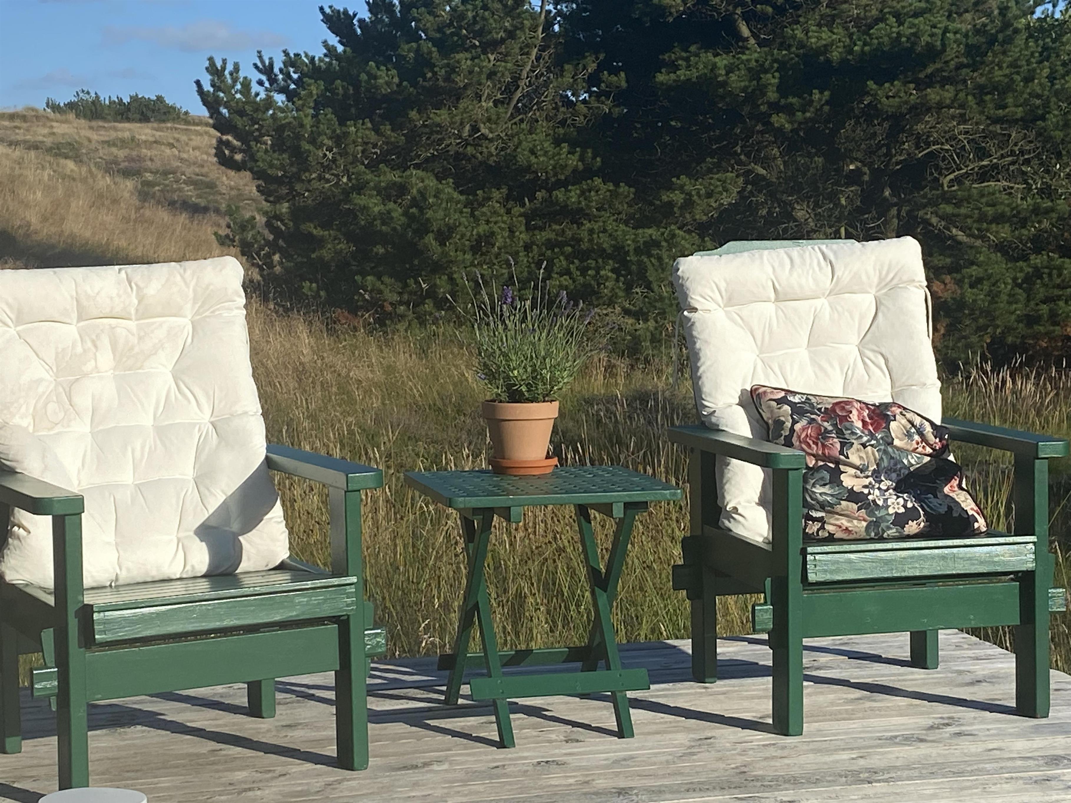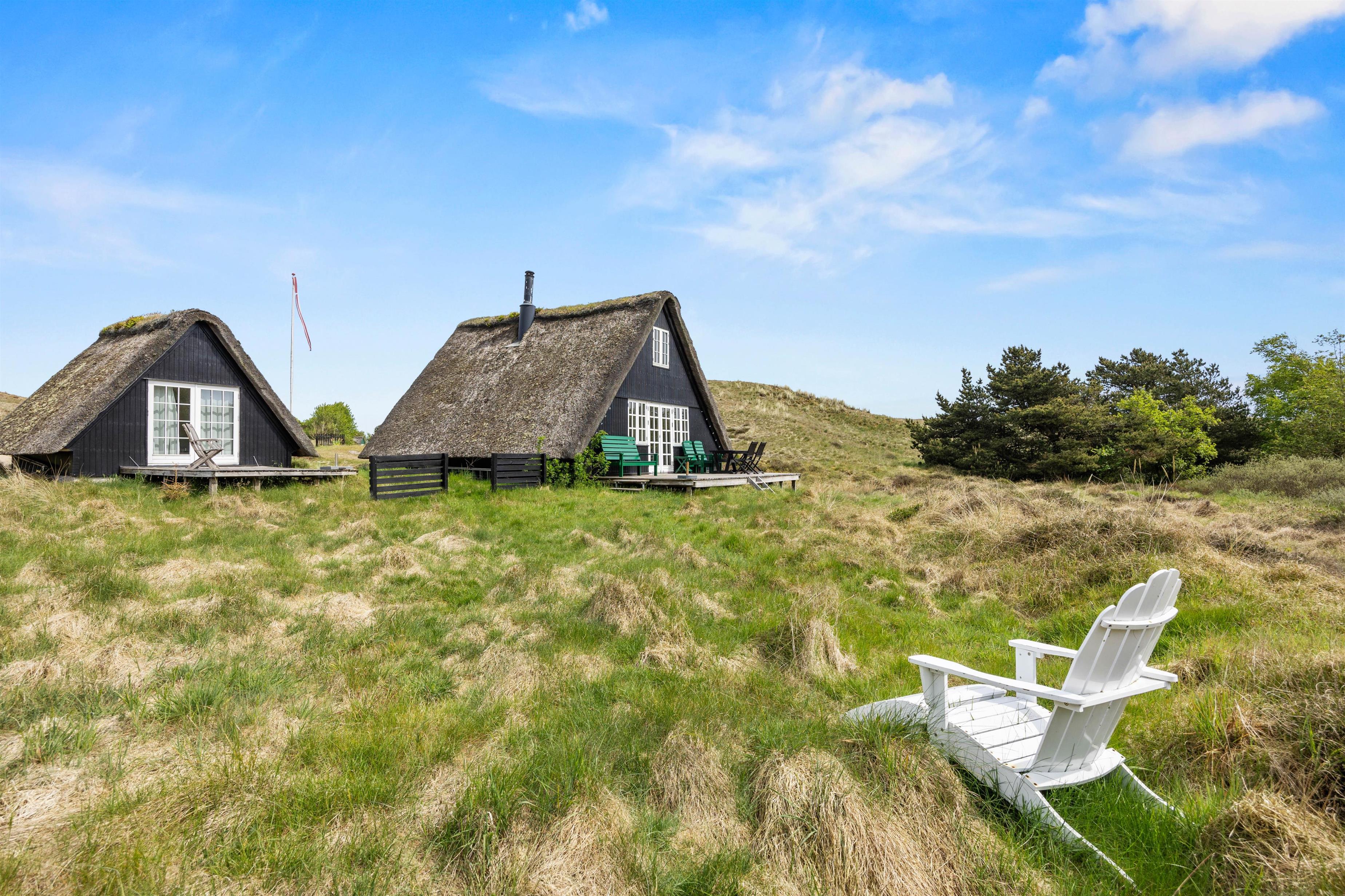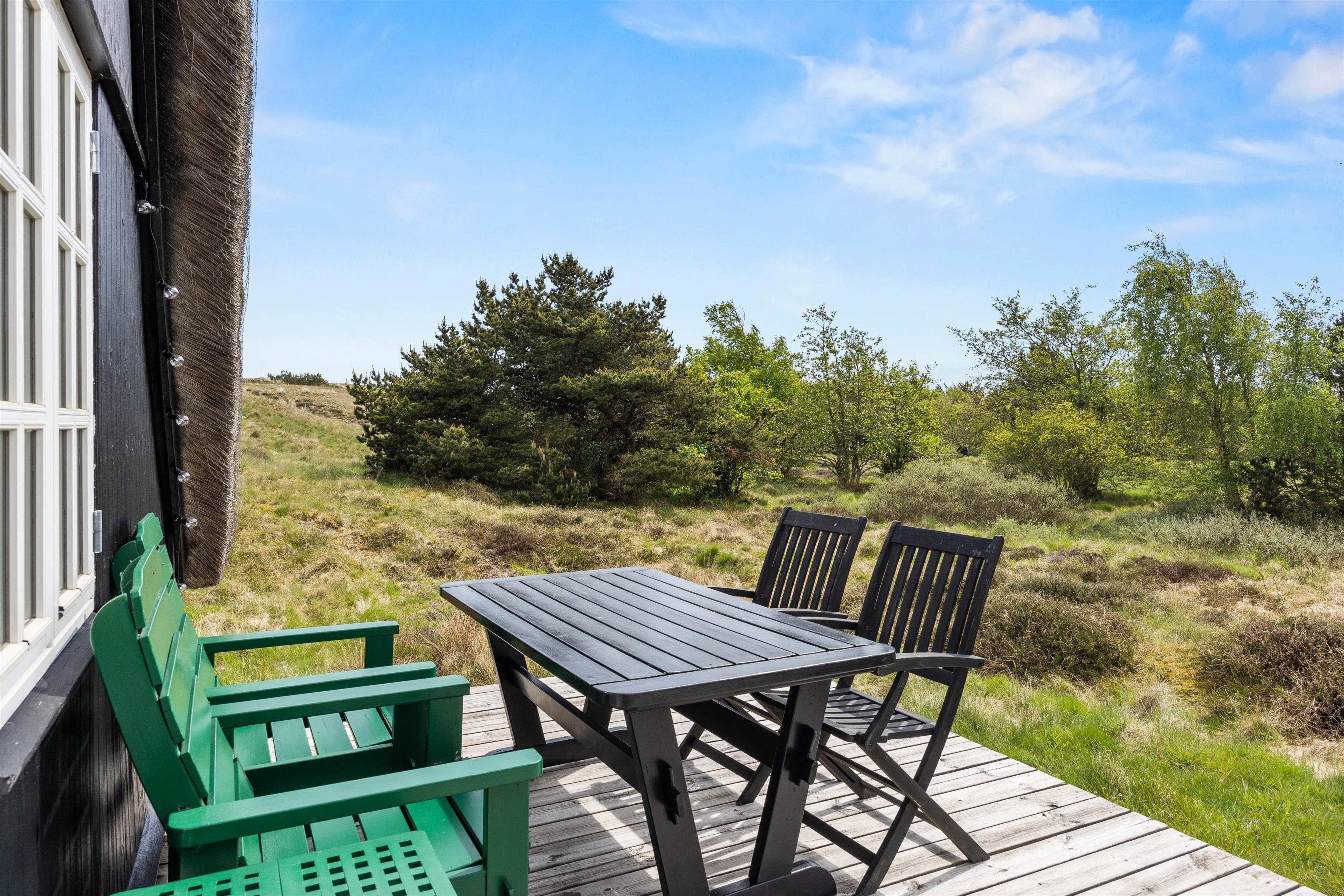Udenfor venter en skøn naturgrund, hvor I kan nyde dagens måltider på terrassen, lade børnene lege frit eller bare læne jer tilbage i havemøblerne og lytte til fuglene. Når vejret er til det, kan I tænde op i grillen og lade aftenen glide roligt afsted under åben himmel. Og har I lyst til en dukkert eller en lang gåtur i klitterne, er stranden kun en kort cykeltur væk.