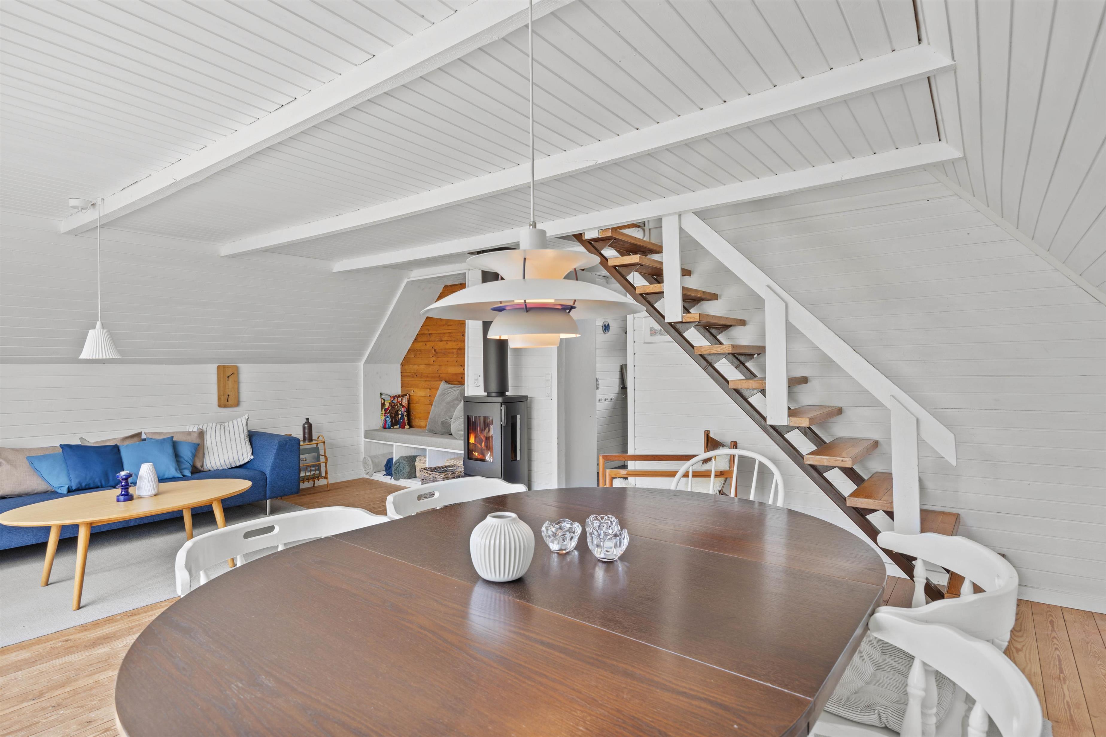 Indretningen bærer præg af klassisk sommerhusstemning med synlige bjælker, naturlige materialer og en brændeovn, der skaber varme og hygge året rundt. Samtidig er sommerhuset udstyret med moderne faciliteter som opvaskemaskine, Chromecast og en energivenlig varmepumpe, så I hverken skal undvære bekvemmelighed eller den særlige stemning, der kendetegner et sommerhus i Sønderho. Når dagen går på hæld, kan I tænde op i brændeovnen, finde en god film og lade roen sænke sig over jeres ferie på Fanø.