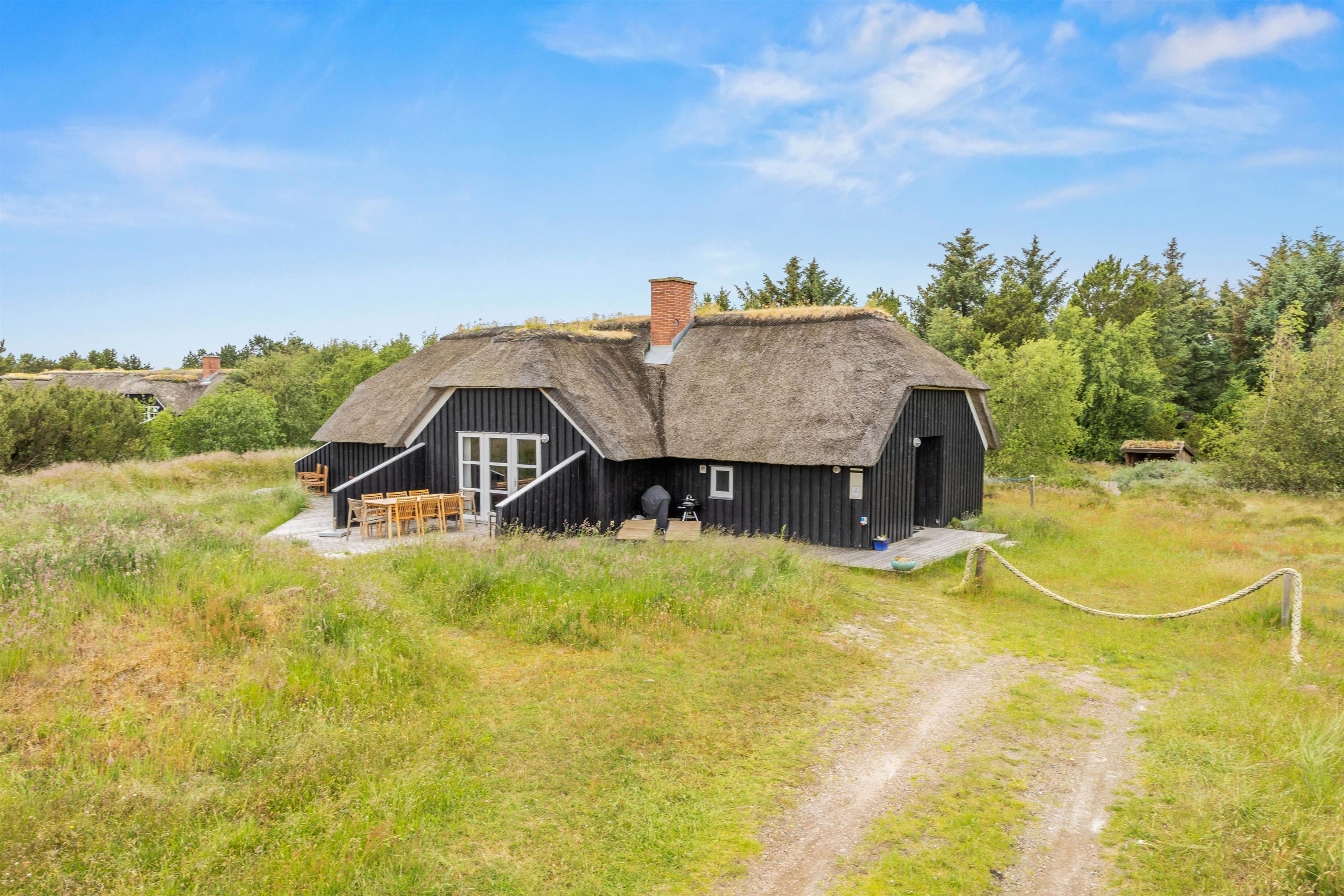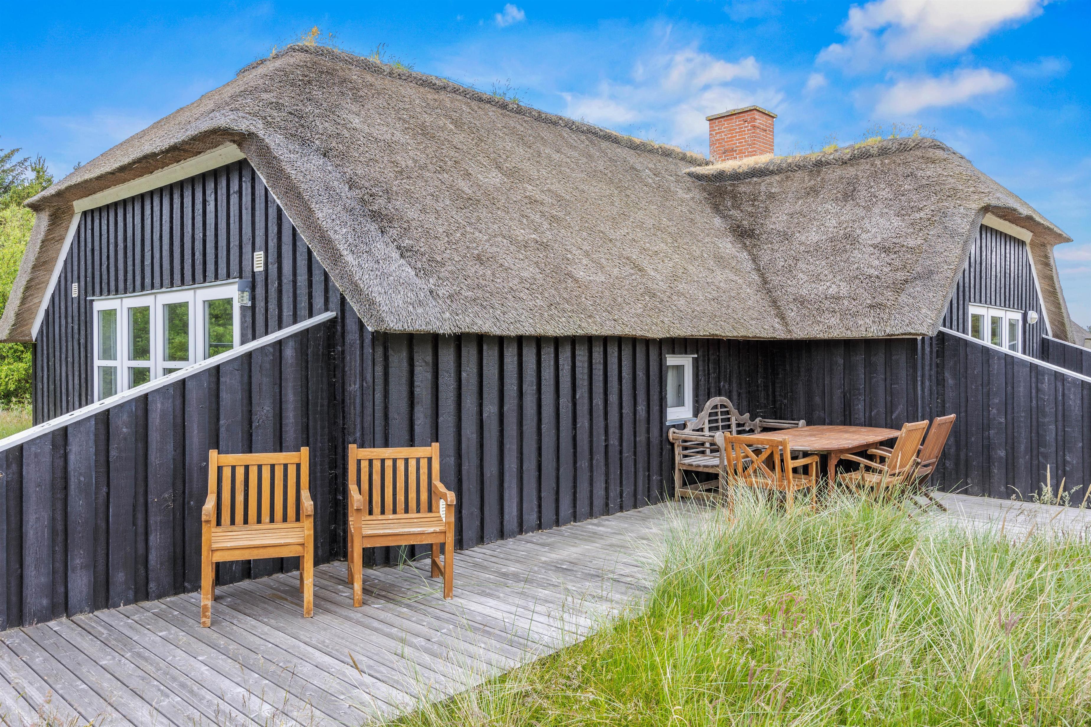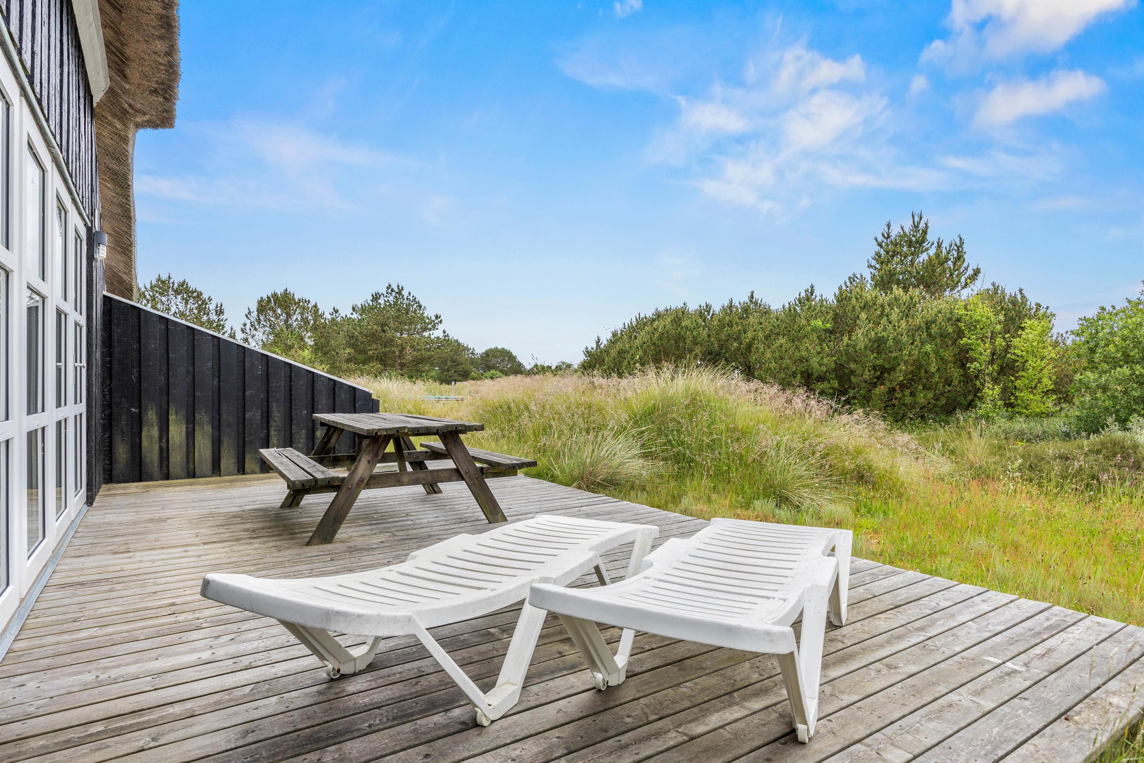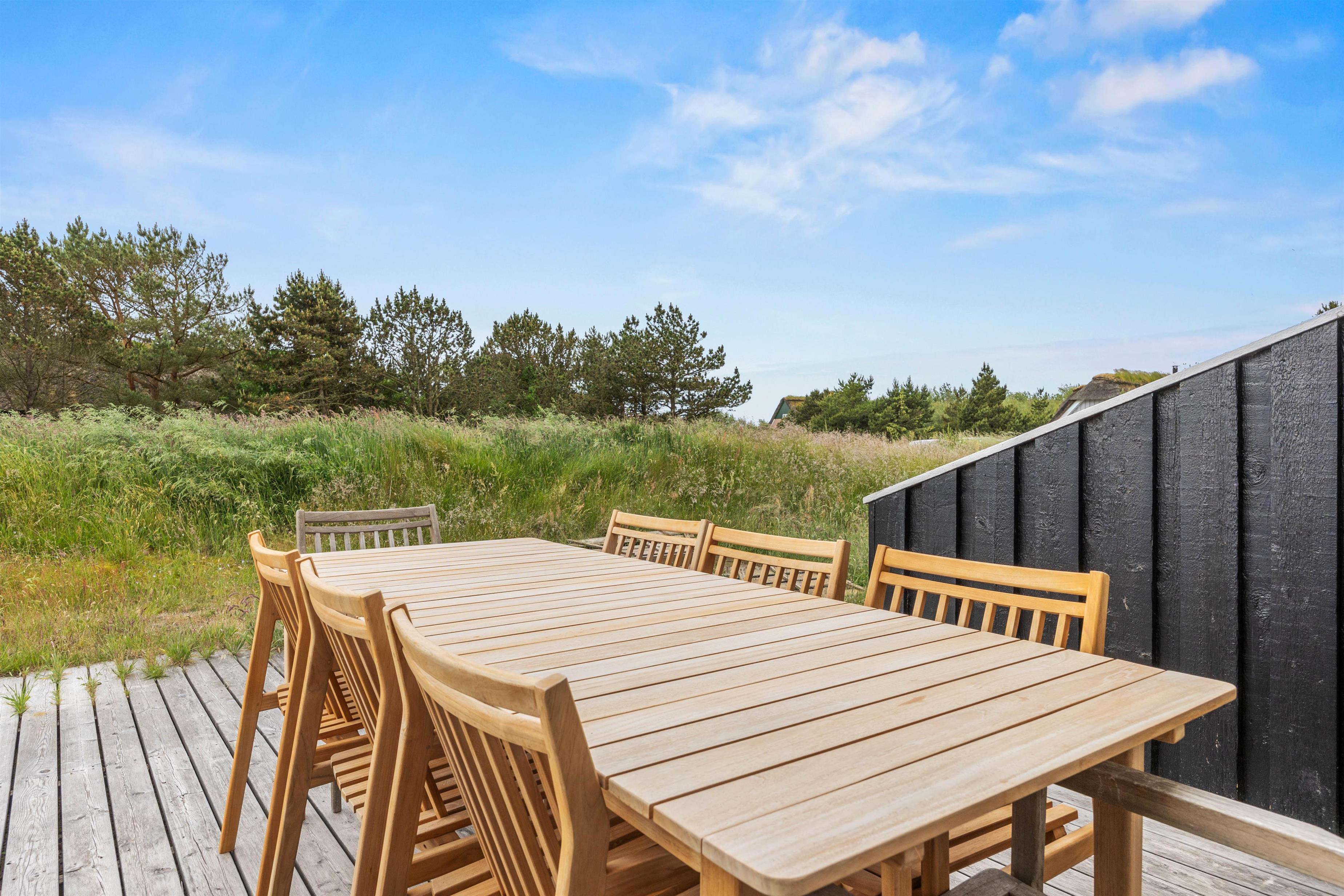 Udendørs finder I en sandkasse og en trampolin, som vil glæde børnene. Træterrassen ved feriehuset i Sønderho indbyder til afslappede timer i det fri. Her kan I hygge med at grille, nyde den friske luft og afslutte dagen med en god bog eller et glas vin. Det er det perfekte sted at opleve naturen tæt på.
