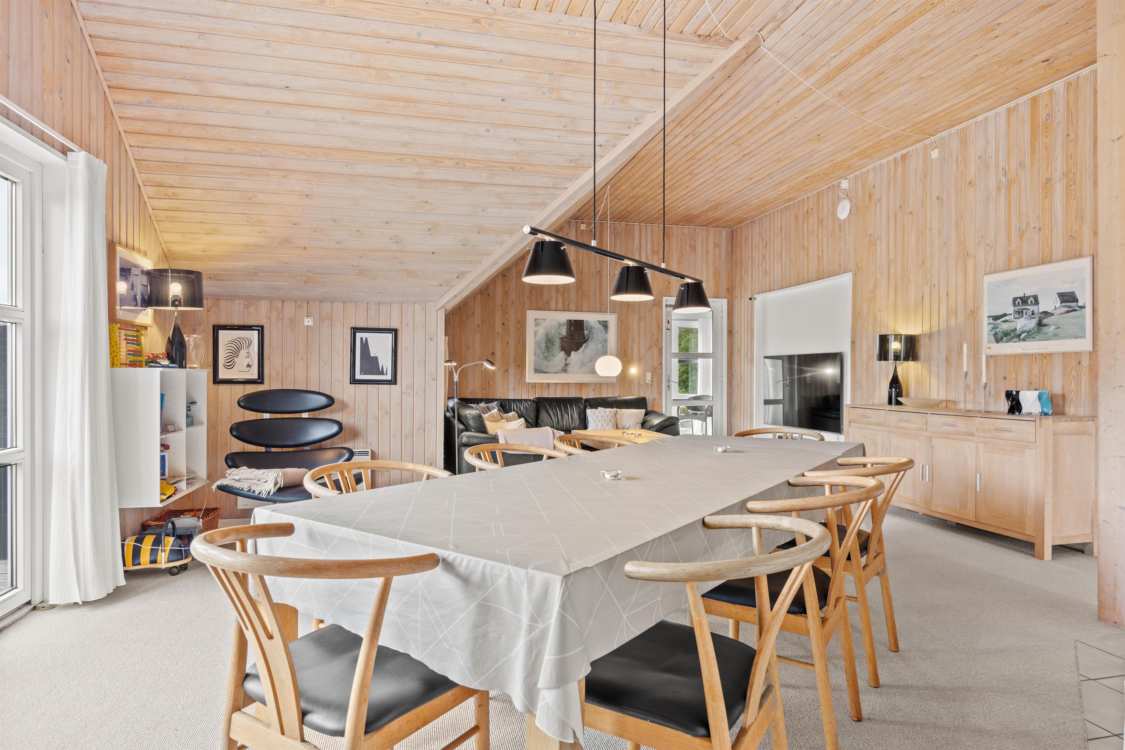 Den centrale opholdsstue forener køkken, spiseplads og dagligstue. Træbeklædte vægge kombineret med brændeovnen i dagligstuen bidrager til feriestemningen og afslappende aftener.