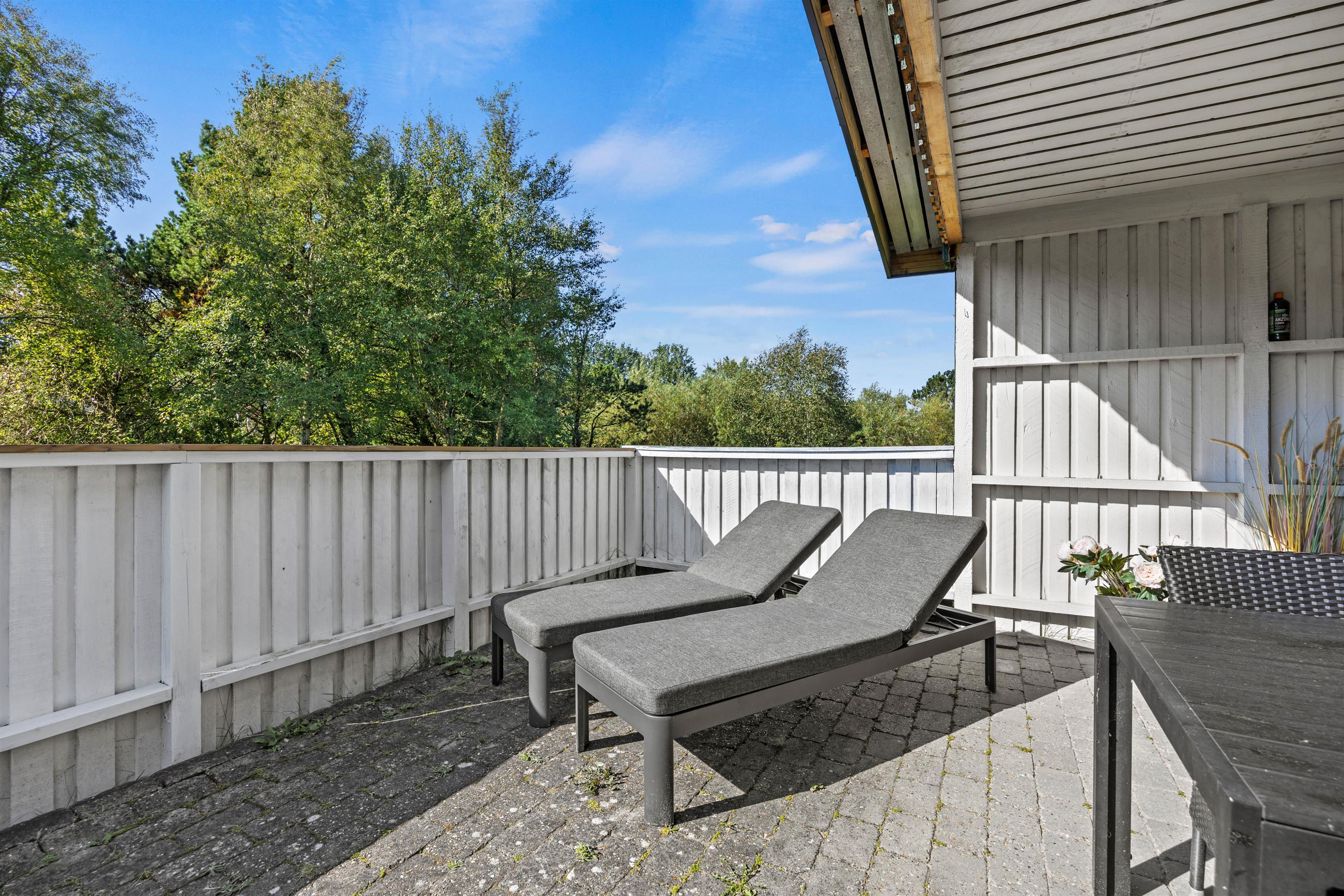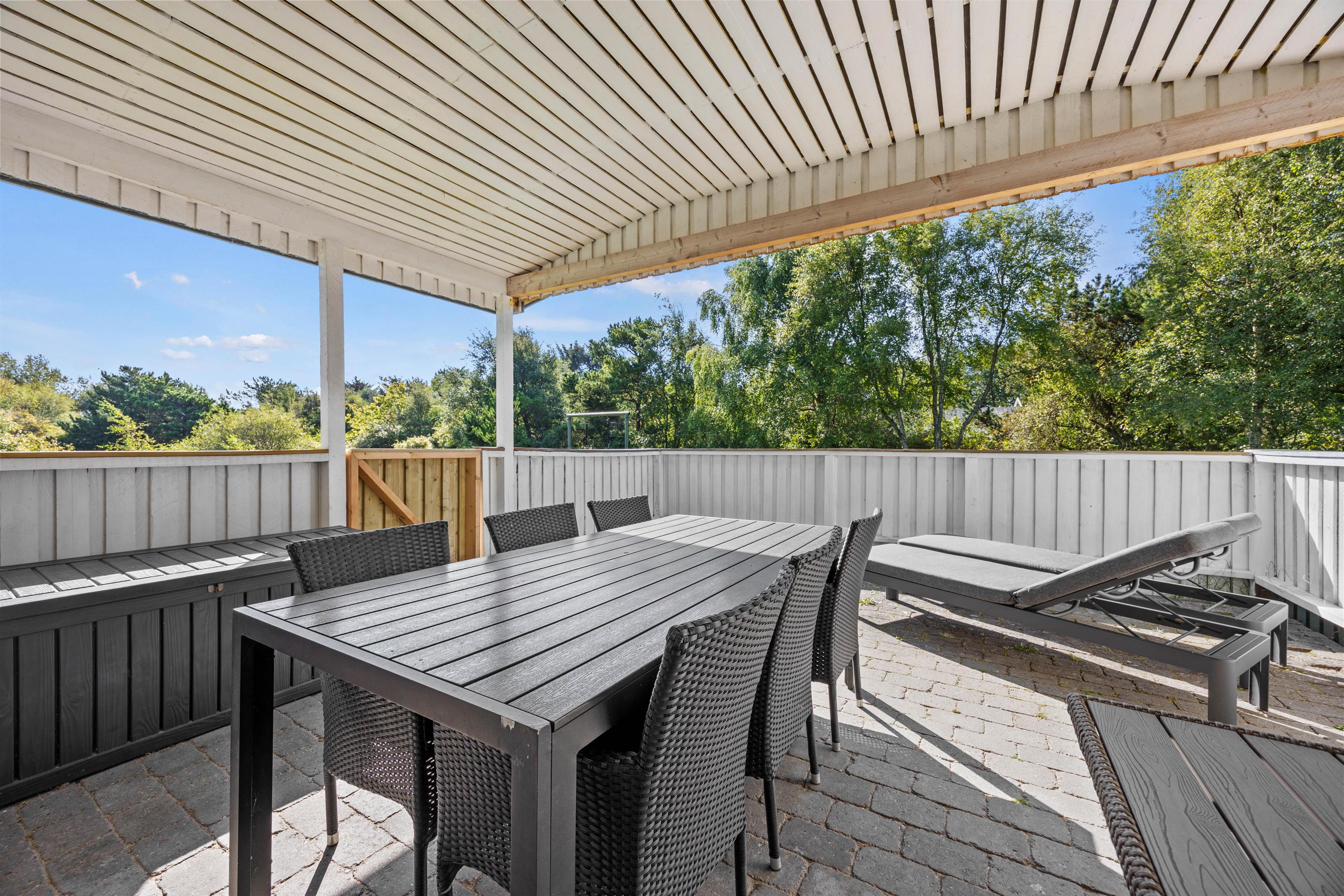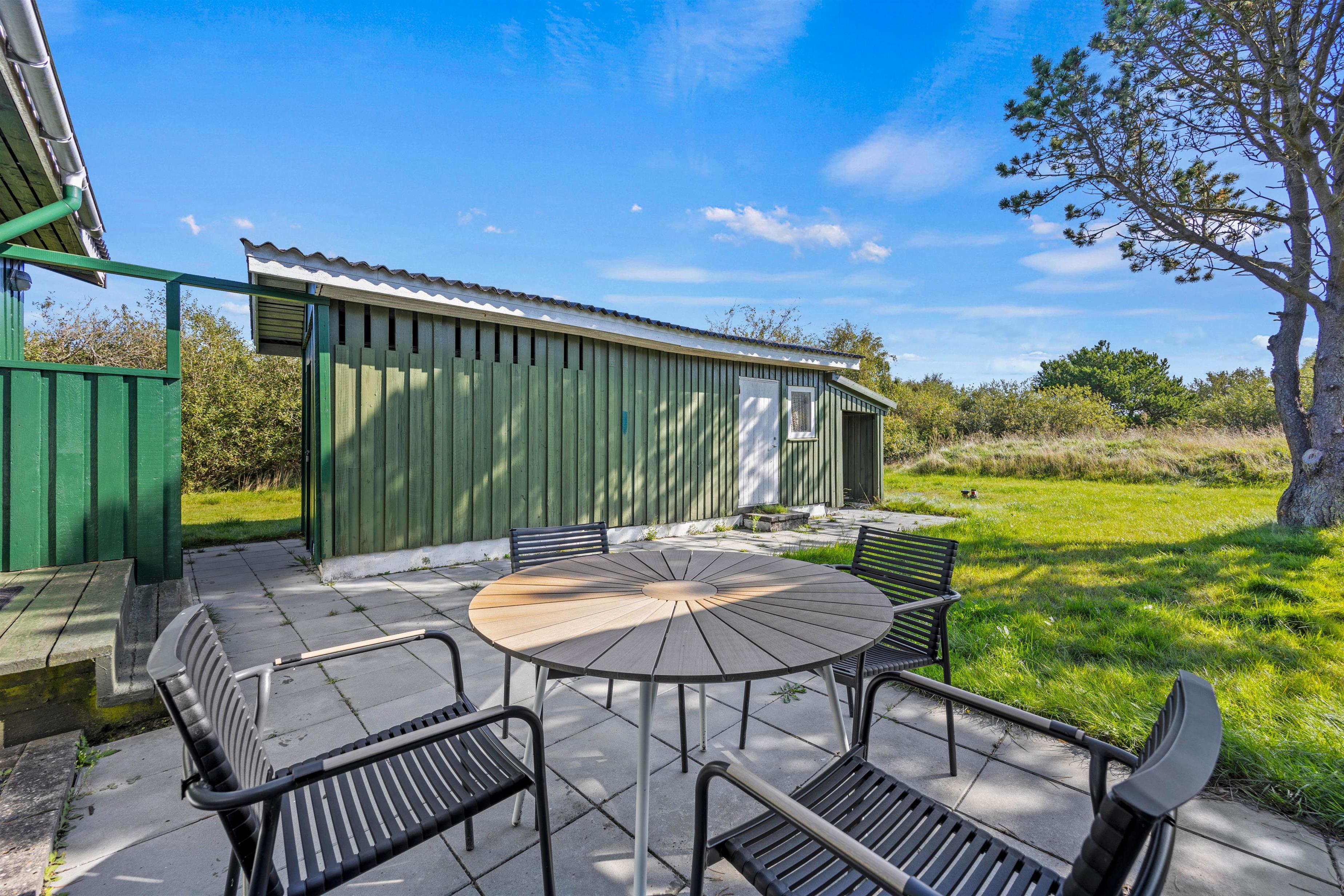 Sommerhusets udemiljø indbyder til hygge på de lune sommerdage. Her står jer både havemøbler og liggestole til rådighed, så sommeren kan nydes til fulde. Den store terrasse er både afskærmet og overdækket, så I uanset vind og vejr kan opholde jer ude. Derudover er der på terrassen også grill, så I kan prøve nogle af de lokale specialiteter, der kan købes i diverse gårdbutikker på øen.