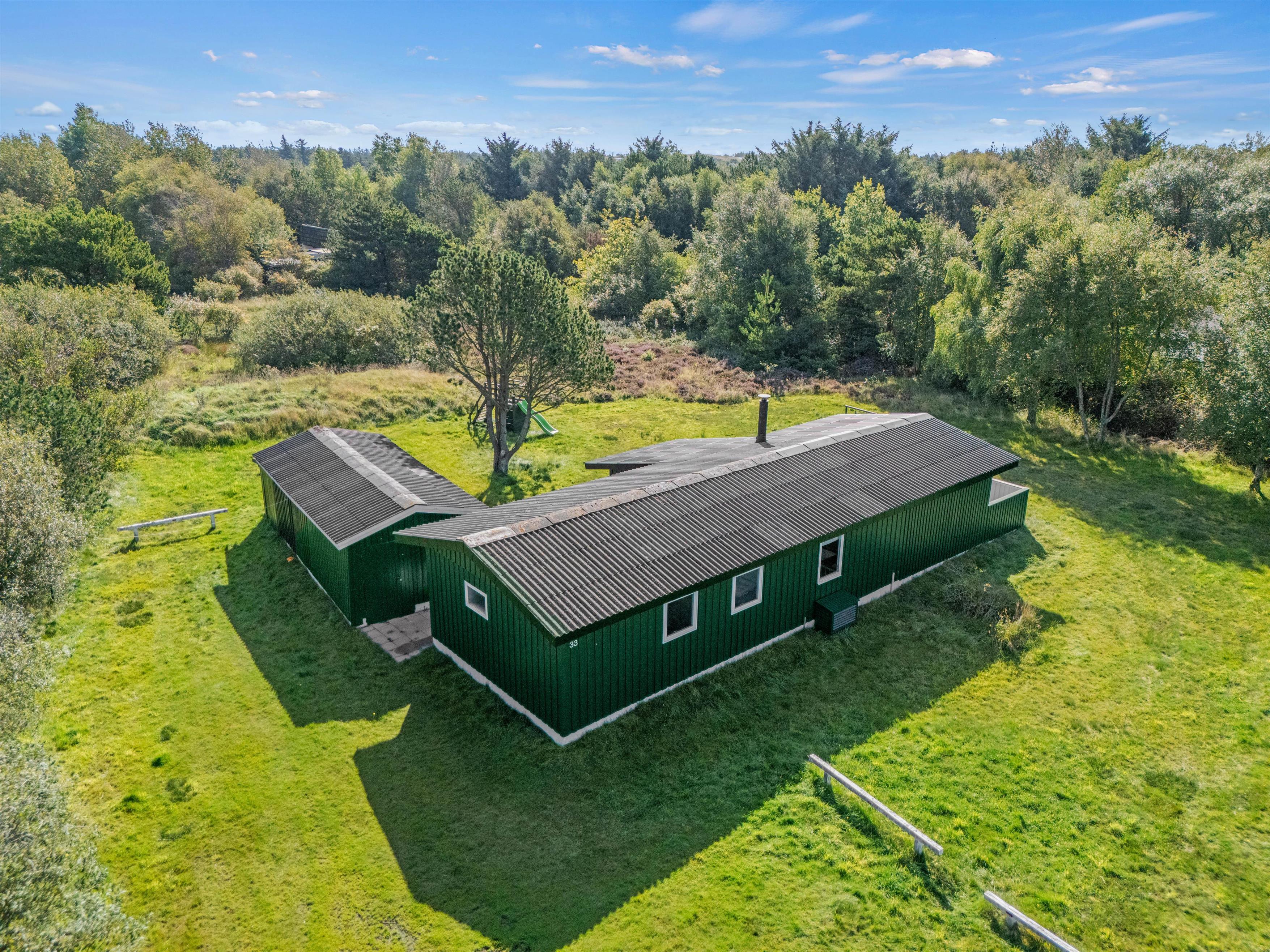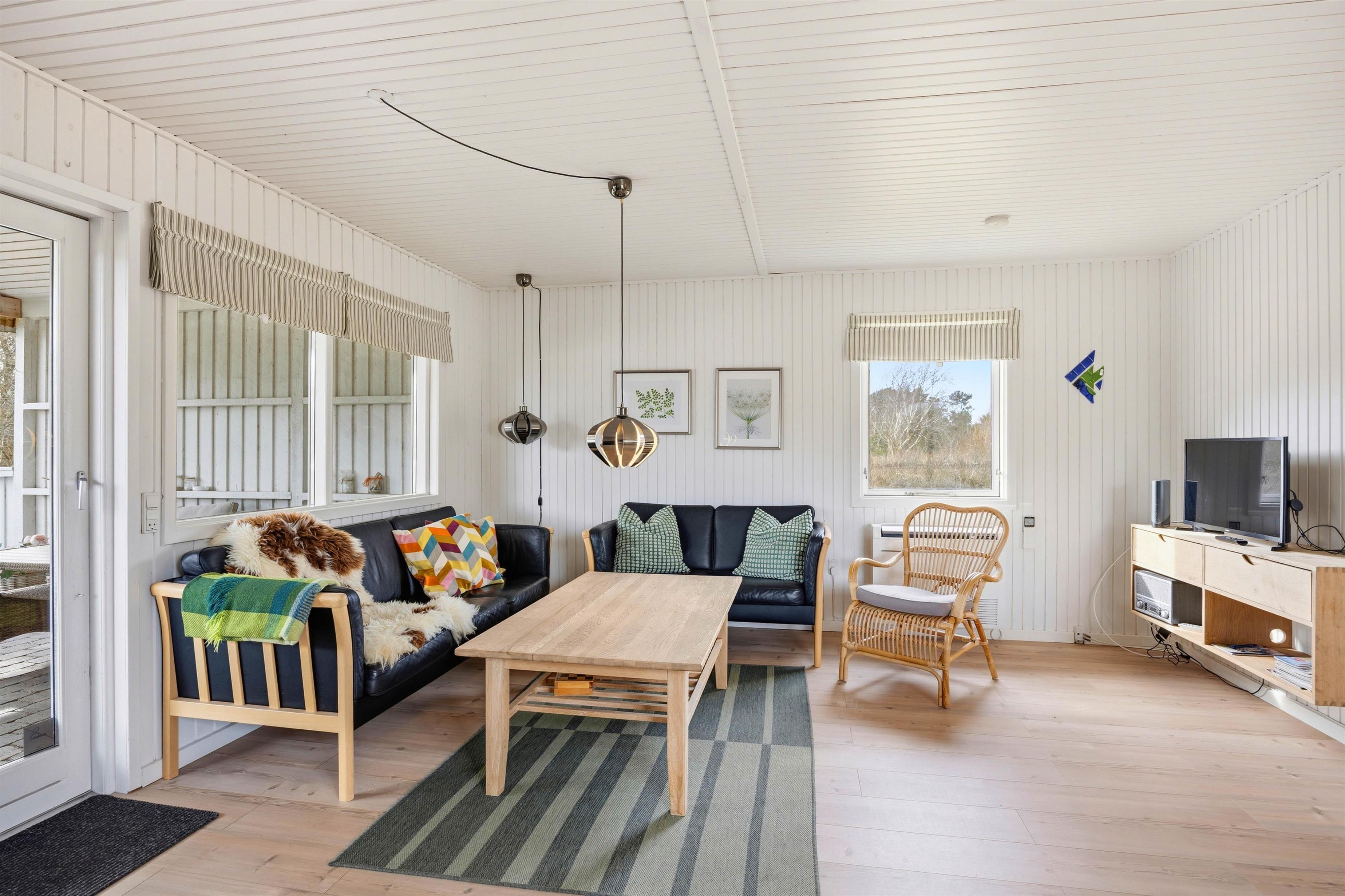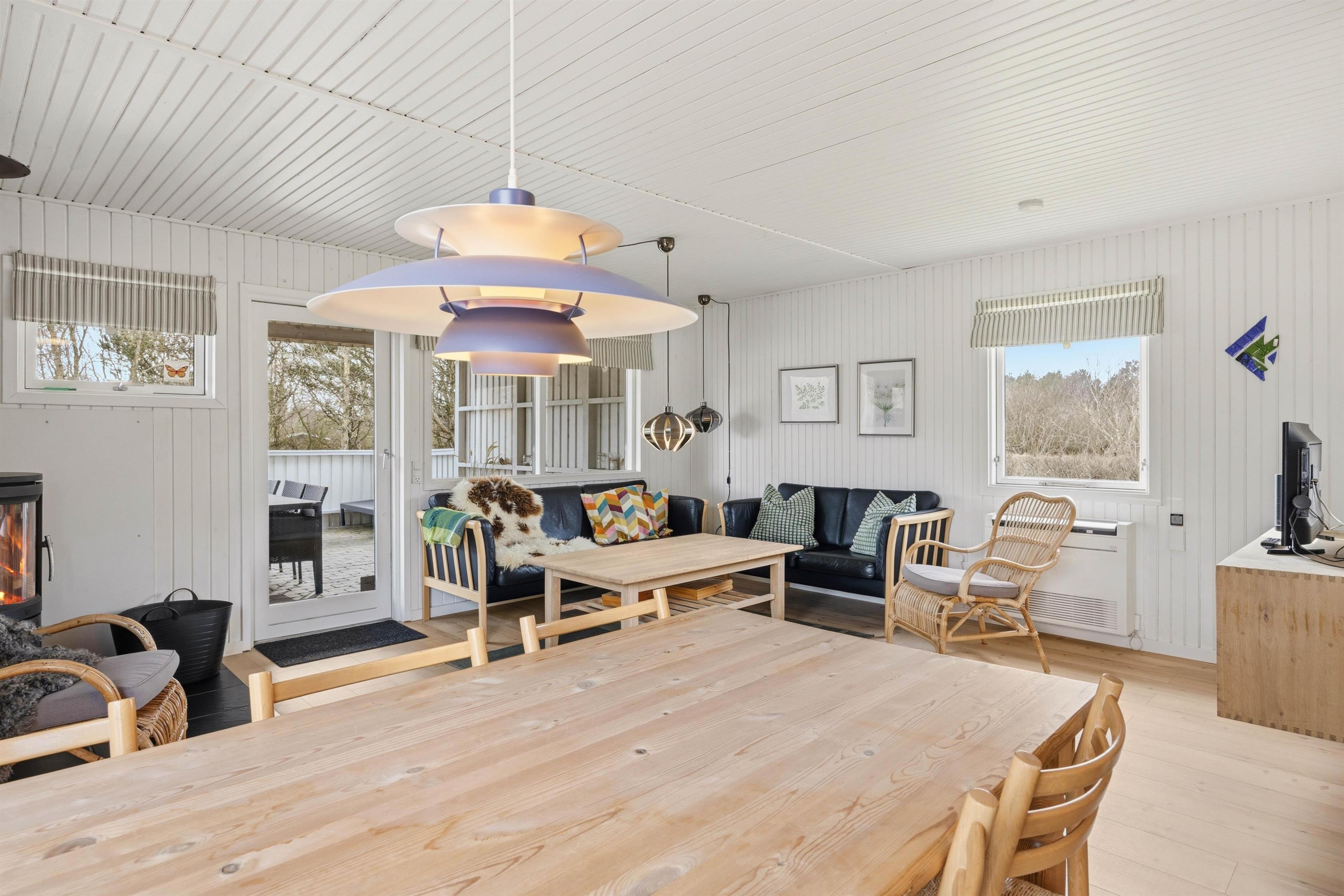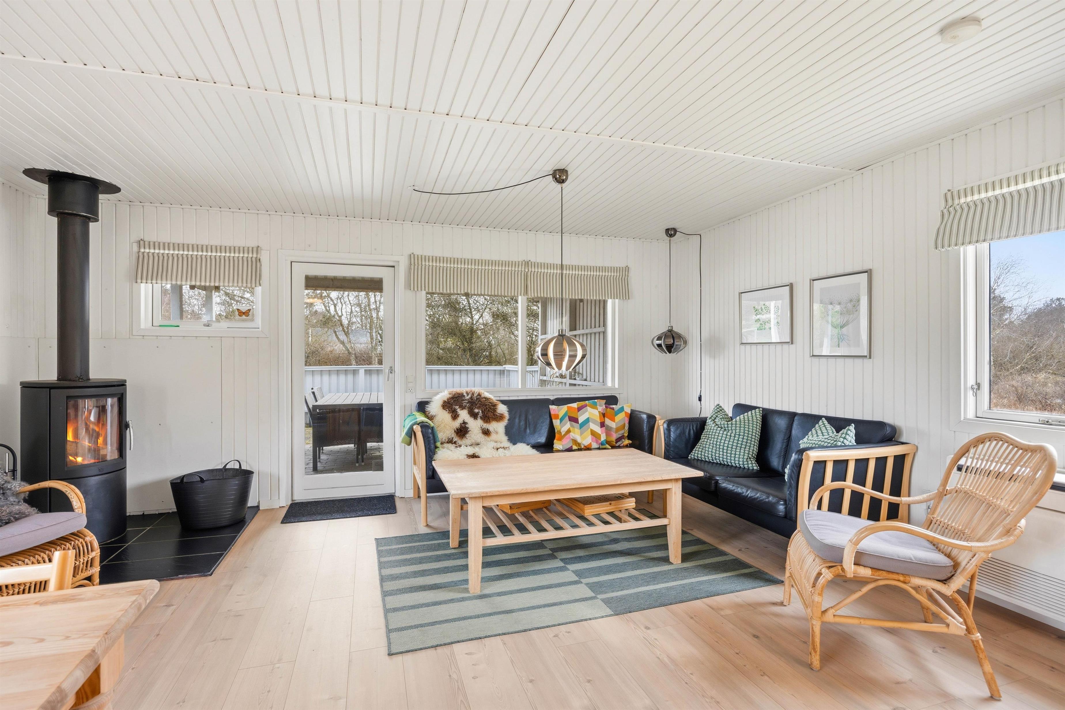 Hjertet af sommerhuset er det store alrum, hvor det funktionelle køkken med opvaskemaskine og mikrobølgeovn ligger i åben forbindelse til spiseplads samt opholdsstuen. Stuen er indrettet med komfortable møbler, hvor I kan tænde op i brændeovnen og sætte jer til rette og mærke roen indfinde sig, mens flammernes skyggedans fylder rummet.