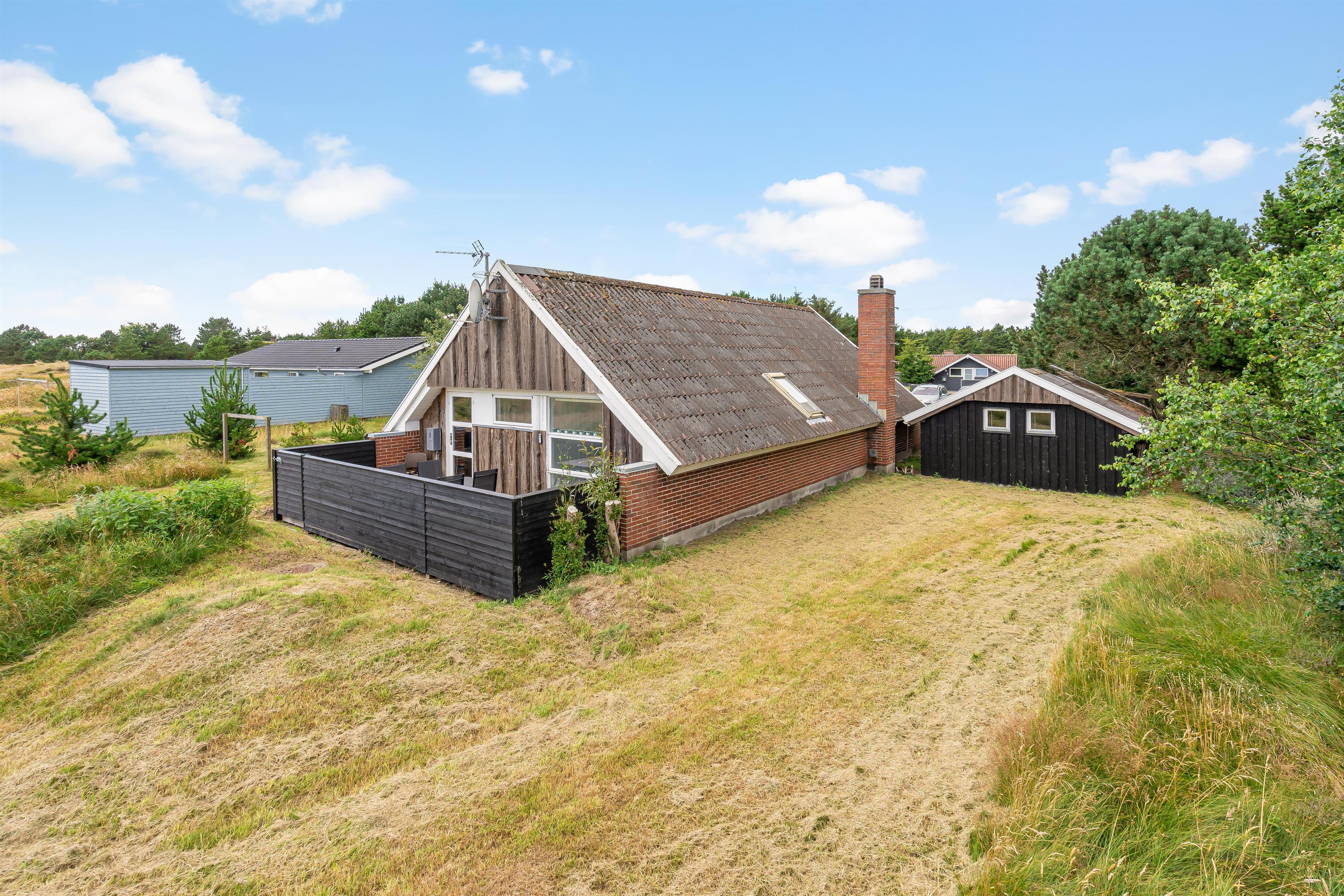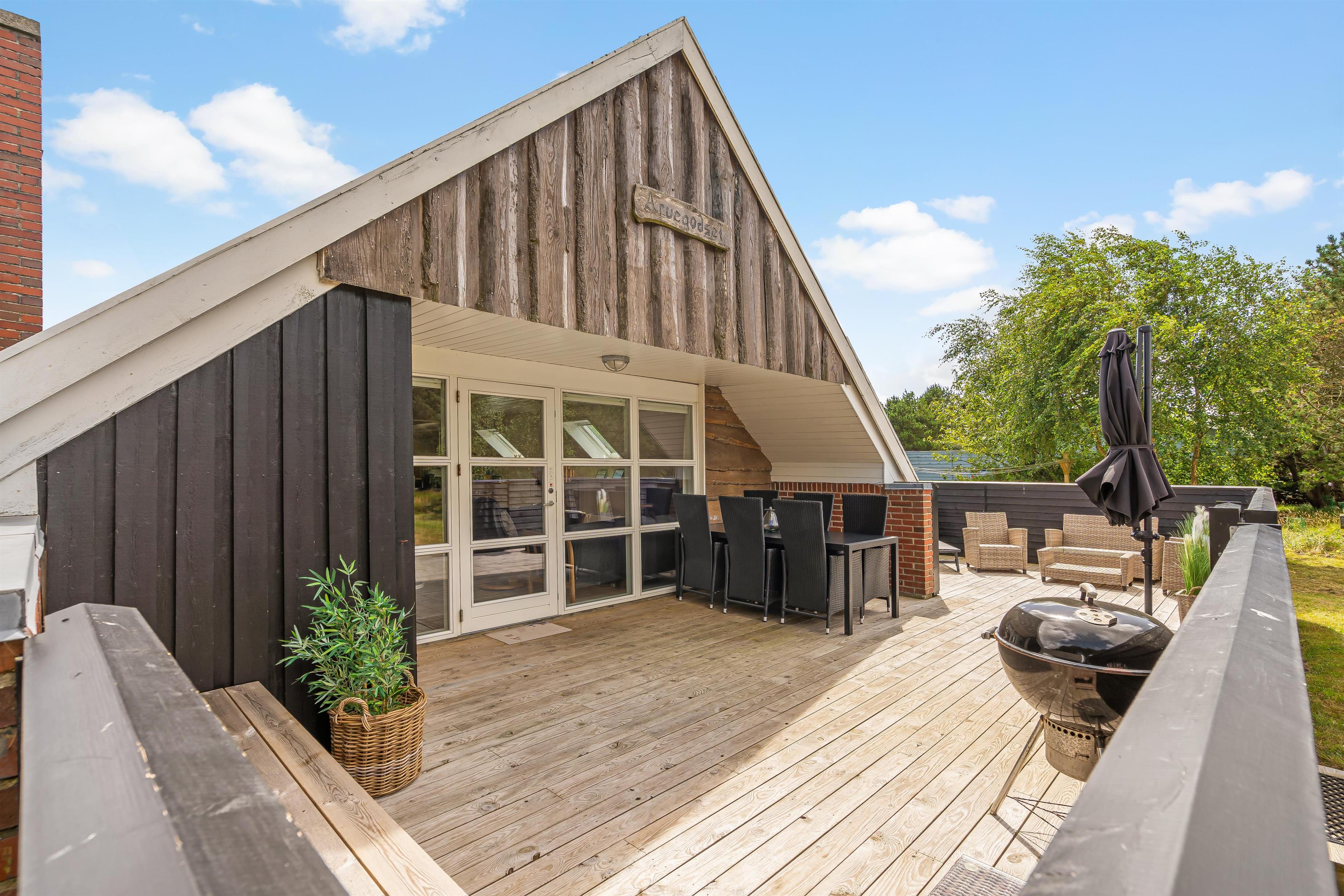 Uderummet ved feriehuset på Vesten Sandene 19 er godt udtænkt og udstyret. Foran huset har I den store delvist overdækkede terrasse, hvorfra I kan nyde solens sidste stråler. Her står både havemøbler, solvogne og grill til rådighed, så når dag bliver til aften, kan I samles her og tænde op i grillen, og nyde aftenen med god mad i hyggeligt selskab.