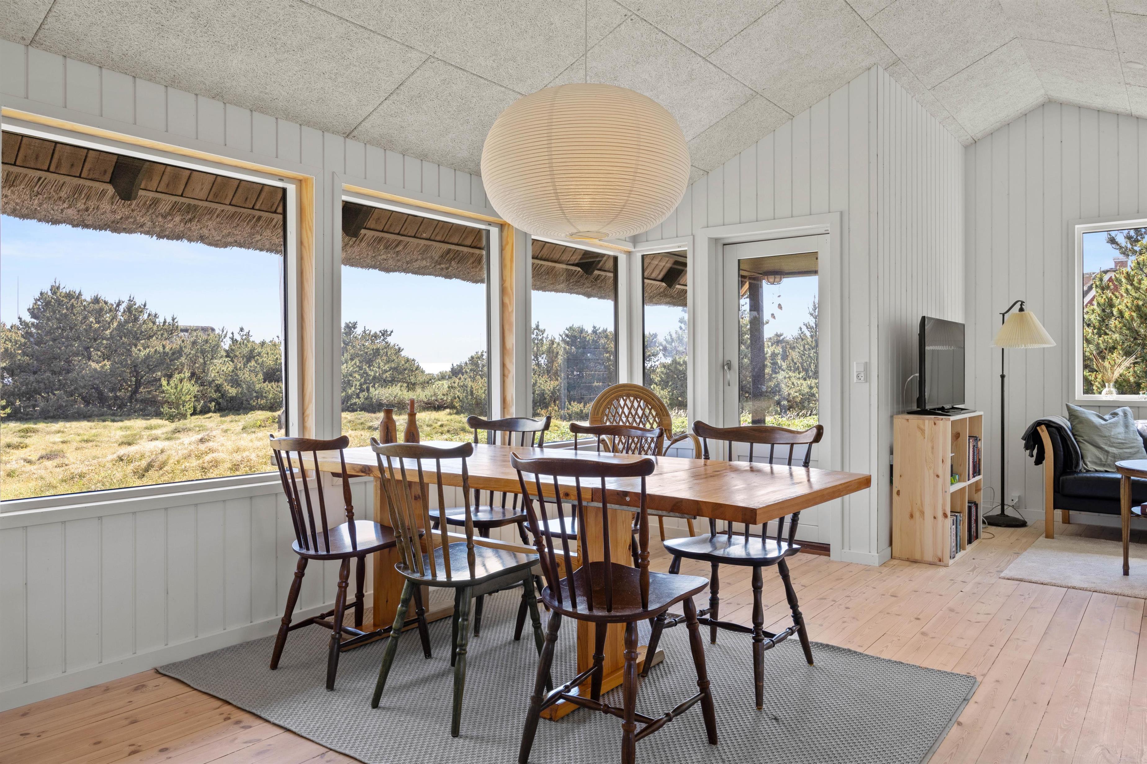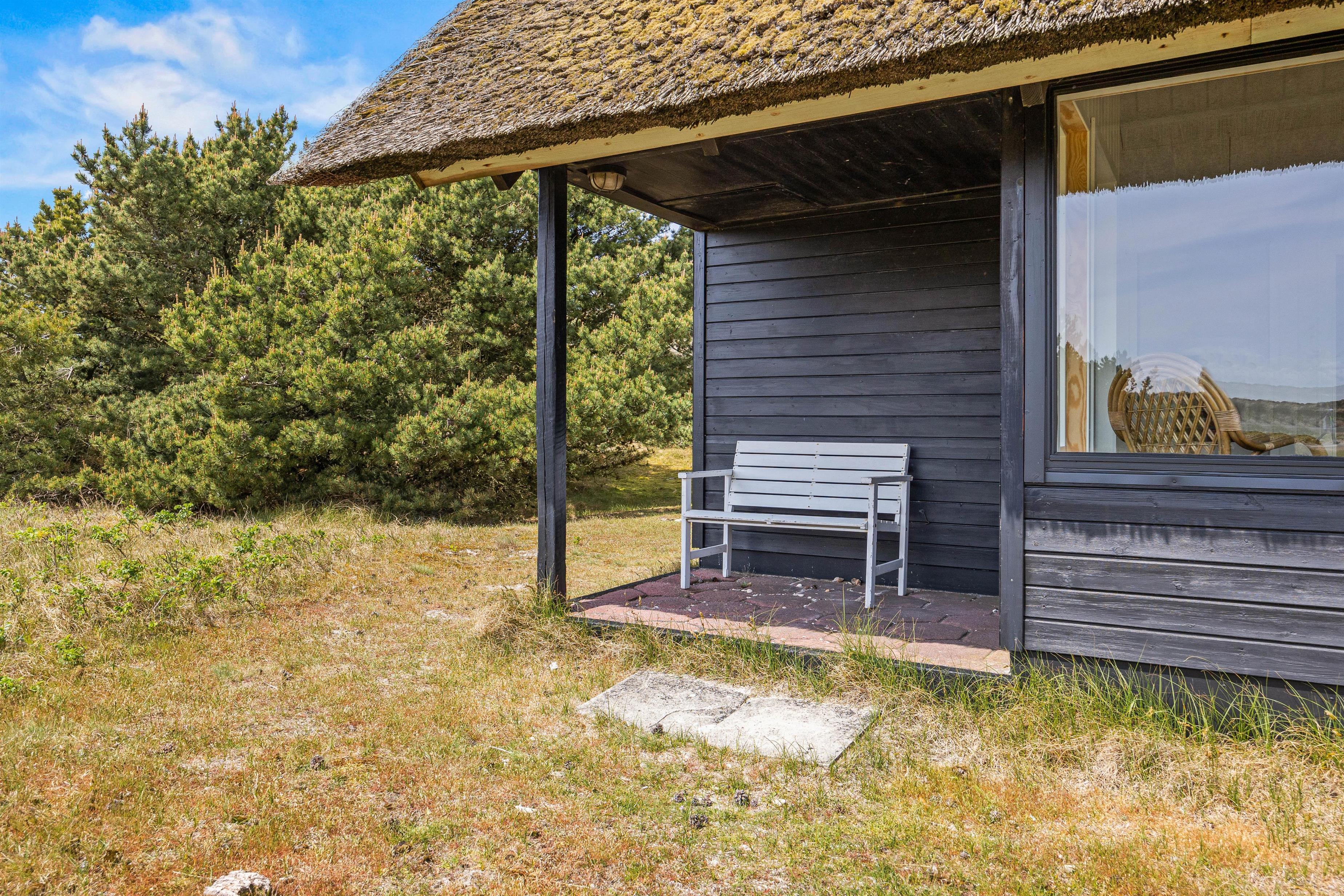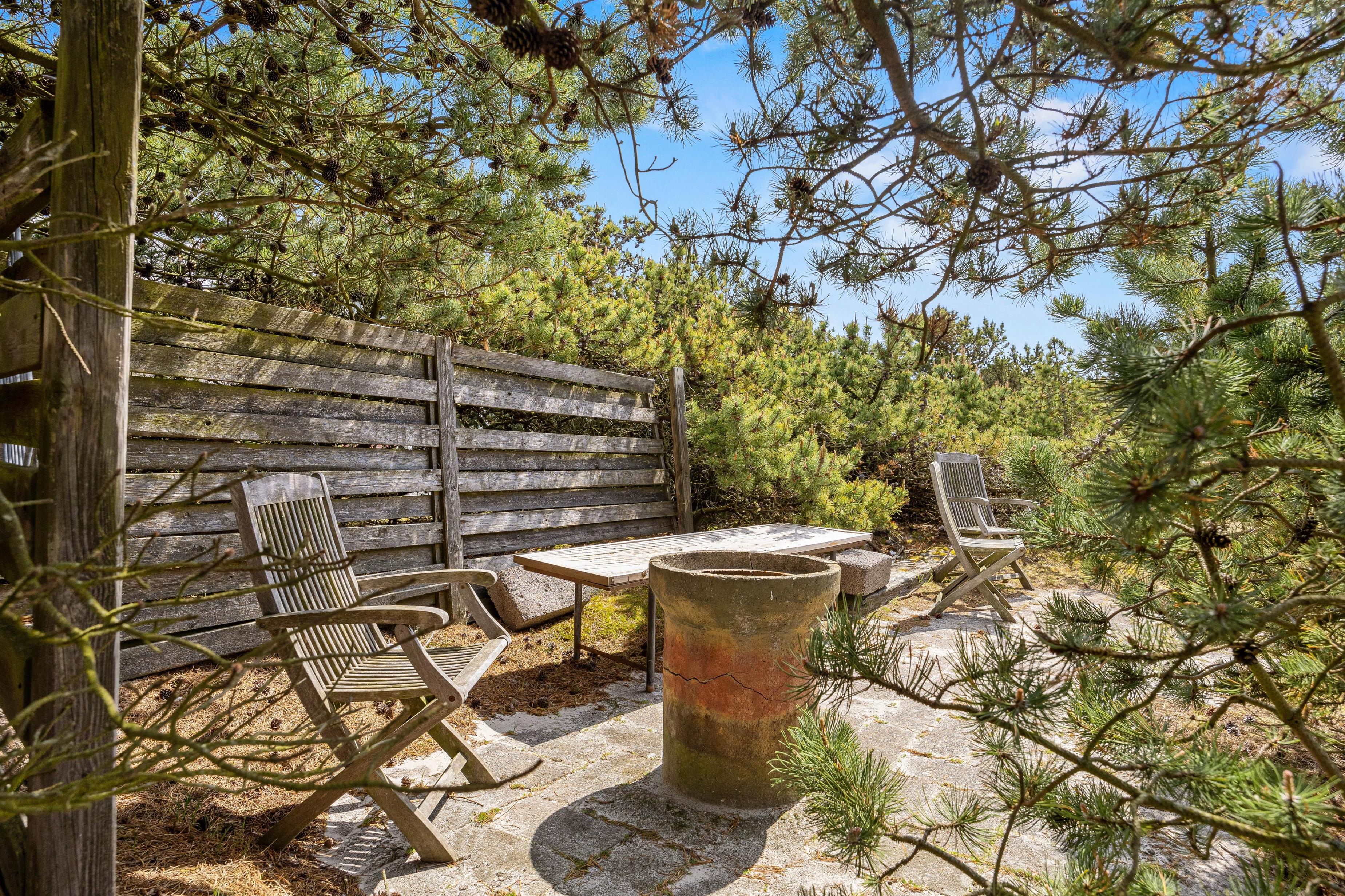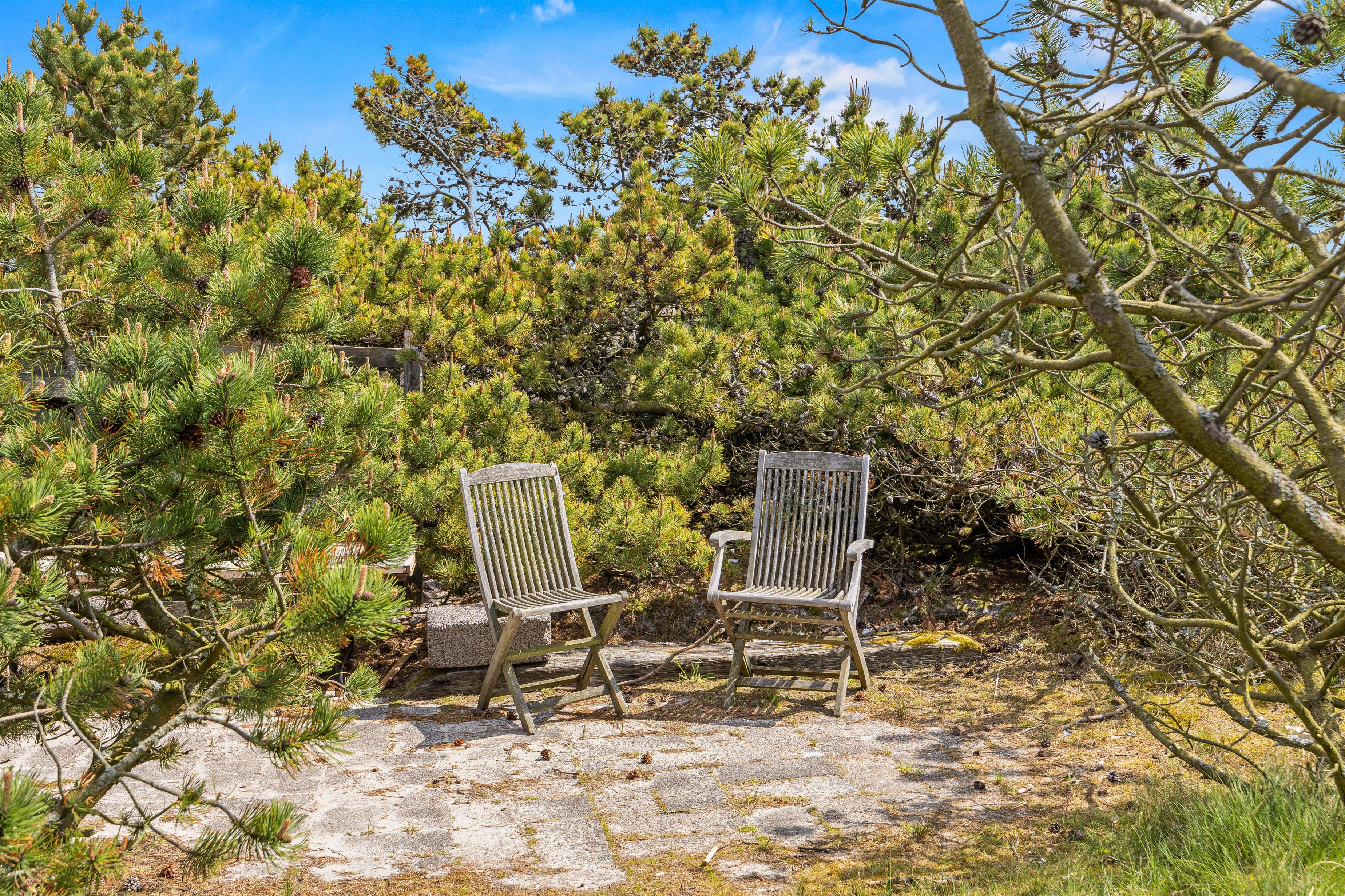 Udenfor på feriehusets terrasser, findes der flere hyggekroge, hvorfra I kan nyde sommersolen under jeres ferie. Her forefindes der havemøbler og grill, så I kan tilberede og nyde aftensmaden under åben himmel, samt solvogne, hvor I kan lægge jer til rette og dase i solen. Ligeledes kan I her være heldige at se kronvildt og harer helt tæt på, når de slår vejen forbi den smukke natur- og klitgrund, som feriehuset er beliggende på.