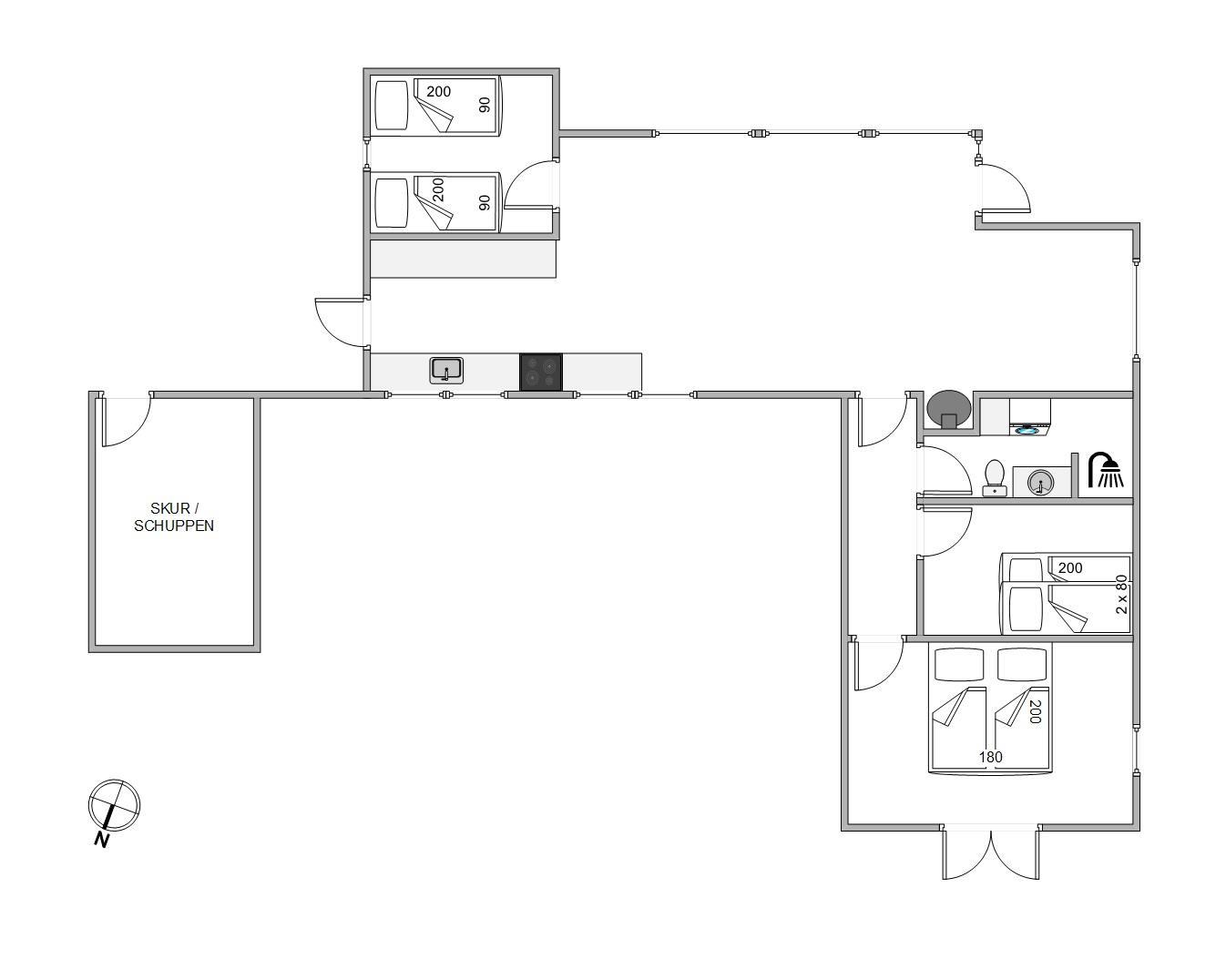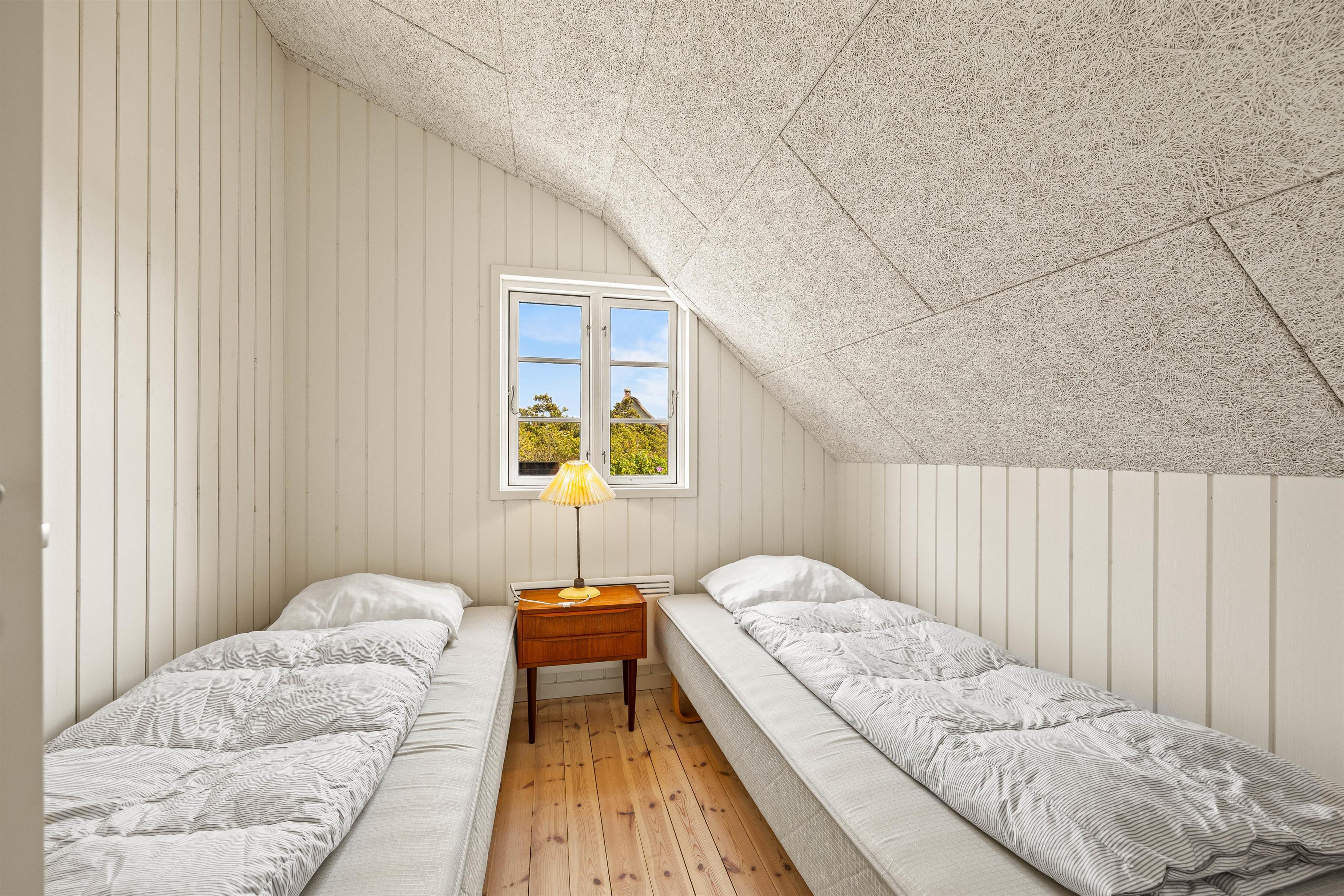 Sommerhusets 3 soverum består af et værelse med enkeltsenge, et værelse med køjeseng – perfekt til børnene, og et stort værelse med en dobbelt seng og dobbeltdøre, der åbner ud til den storslåede natur. Her venter jer et lækkert badeværelse med tilhørende vaskemaskine og gulvvarme, så I uanset årstiden altid har lune fødder.