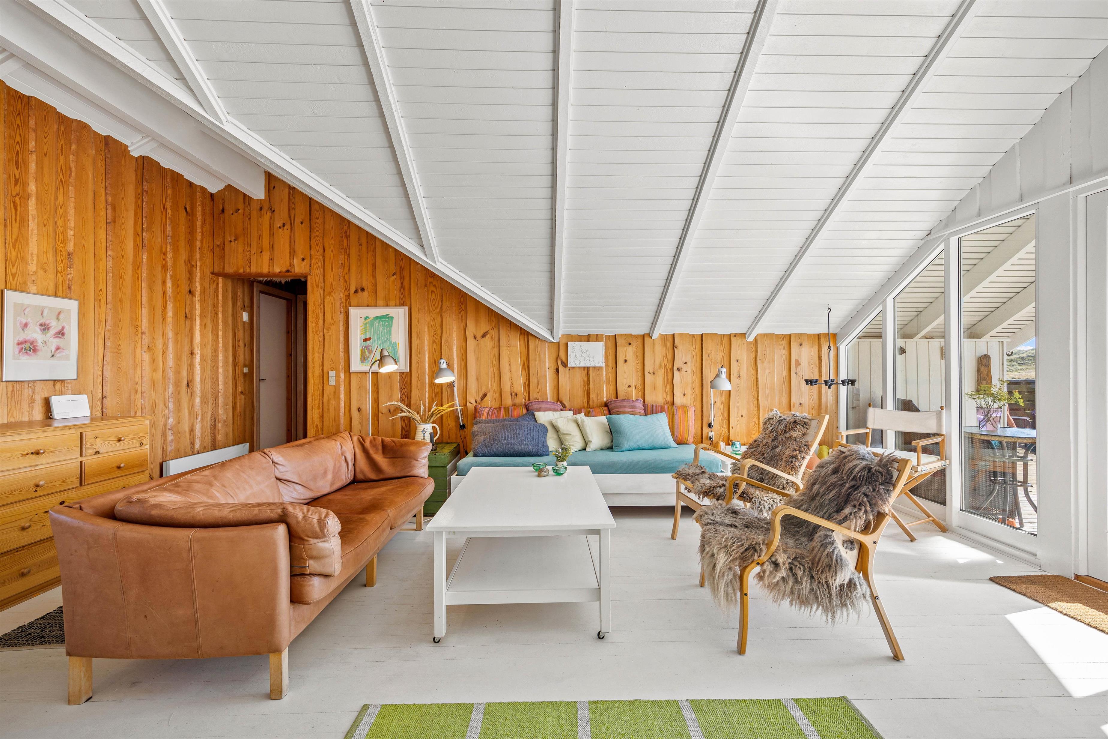 I det rummelige opholdsrum, hvor stue, køkken og spiseplads ligger i åben forbindelse med hinanden, kan I læne jer tilbage i den behagelige sofa og kigge ud af de store panoramavinduer mod den skønne natur omkring jer, alt imens brændeovnen spreder en dejlig varme og den rette hyggeatmosfære. I det veludstyrede køkken, venter jer desuden en opvaskemaskine, der letter oprydningen efter madlavningen. Derudover er der her også en vaskemaskine tilgængelig, så I kan friske tøjet op inden ferien er forbi.