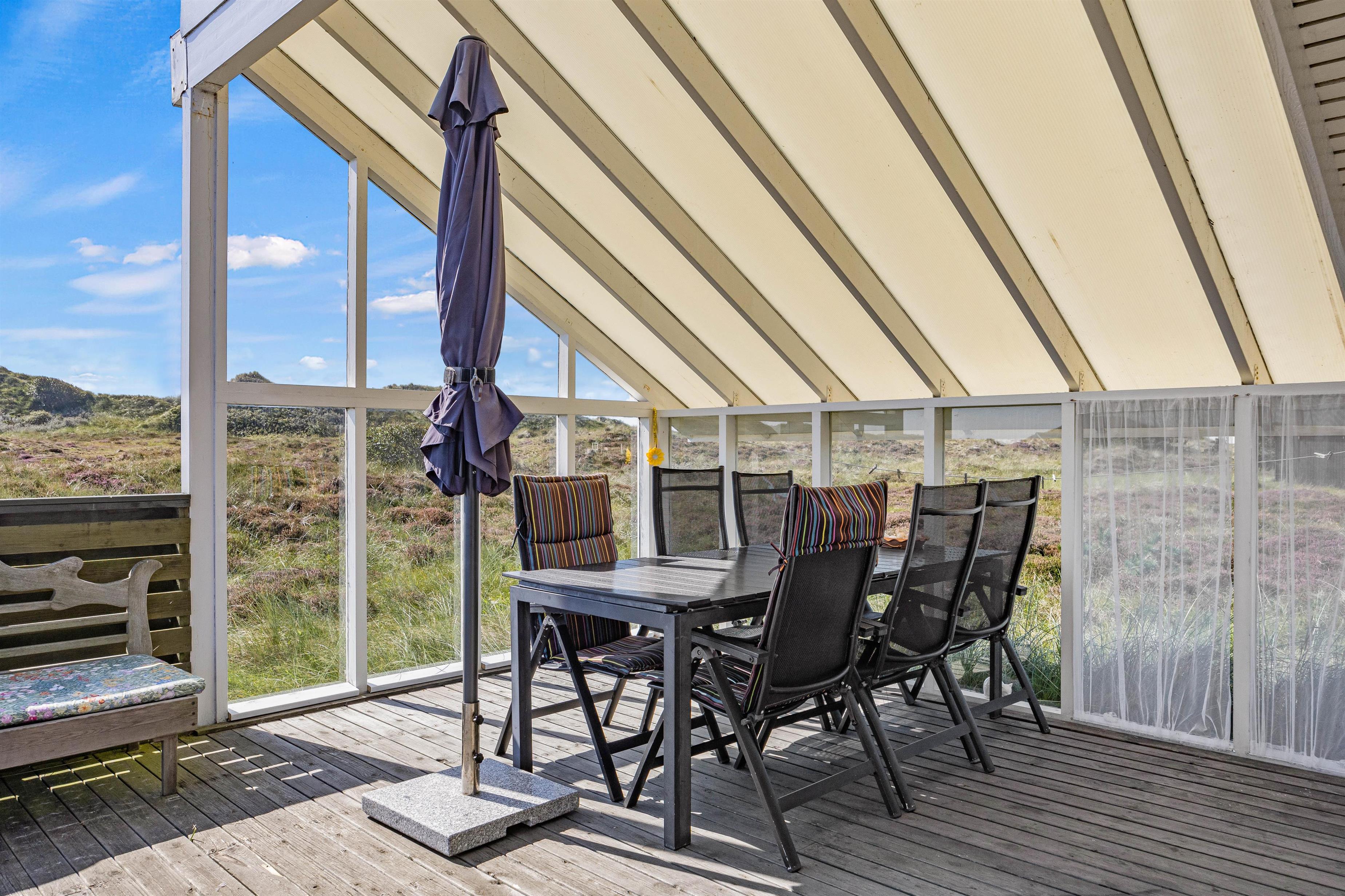 Skal de lange feriedage tilbringes i feriehuset, så kan I sætte jer til rette i de komfortable havemøbler der står til jeres rådighed på den fine terrasse, der både er lukket, delvist afskærmet og overdækket, så I uanset vind og vejr altid kan finde den perfekte siddeplads. Sæt jer til rette, tænd op i grillen og nyd lækre lokale specialiteter tilberedt under åben himmel, og udnyt tiden til hyggeligt samvær og planlægning af næste feriedag.