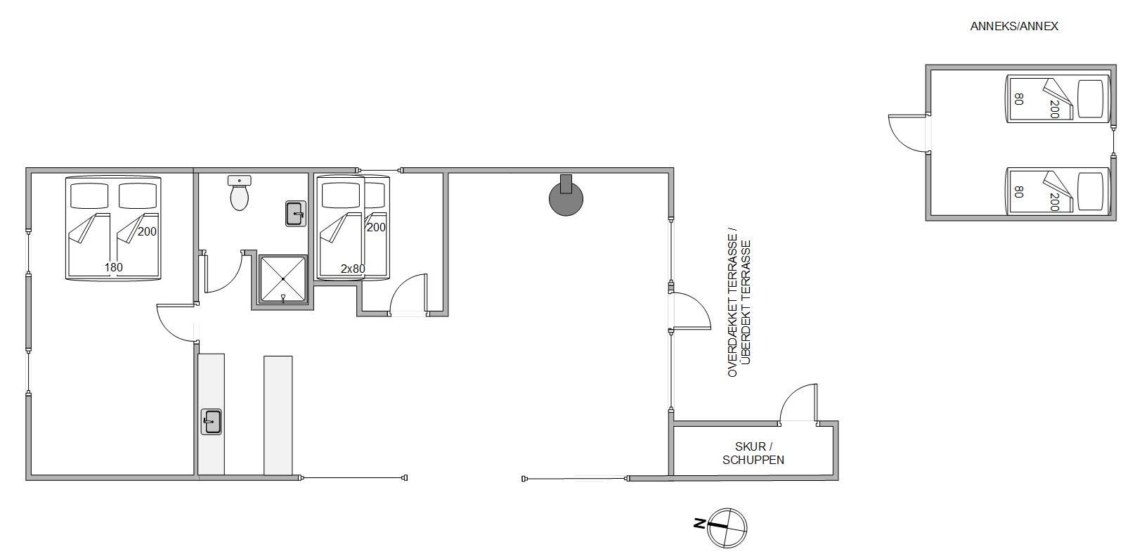 Det veludstyrede køkken har opvaskemaskine og alle de vigtige husholdningsapparater, I har brug for til et afslappet ophold. Her kan I lave mad sammen, spise og tilbringe hyggelige timer. Feriehuset har 2 soveværelser, begge med dobbeltseng, og derudover et anneks med 2 enkeltsenge – ideelt, hvis I rejser flere sammen eller ønsker ekstra soveplads. Badeværelset er funktionelt indrettet og udstyret med brusebad og toilet.