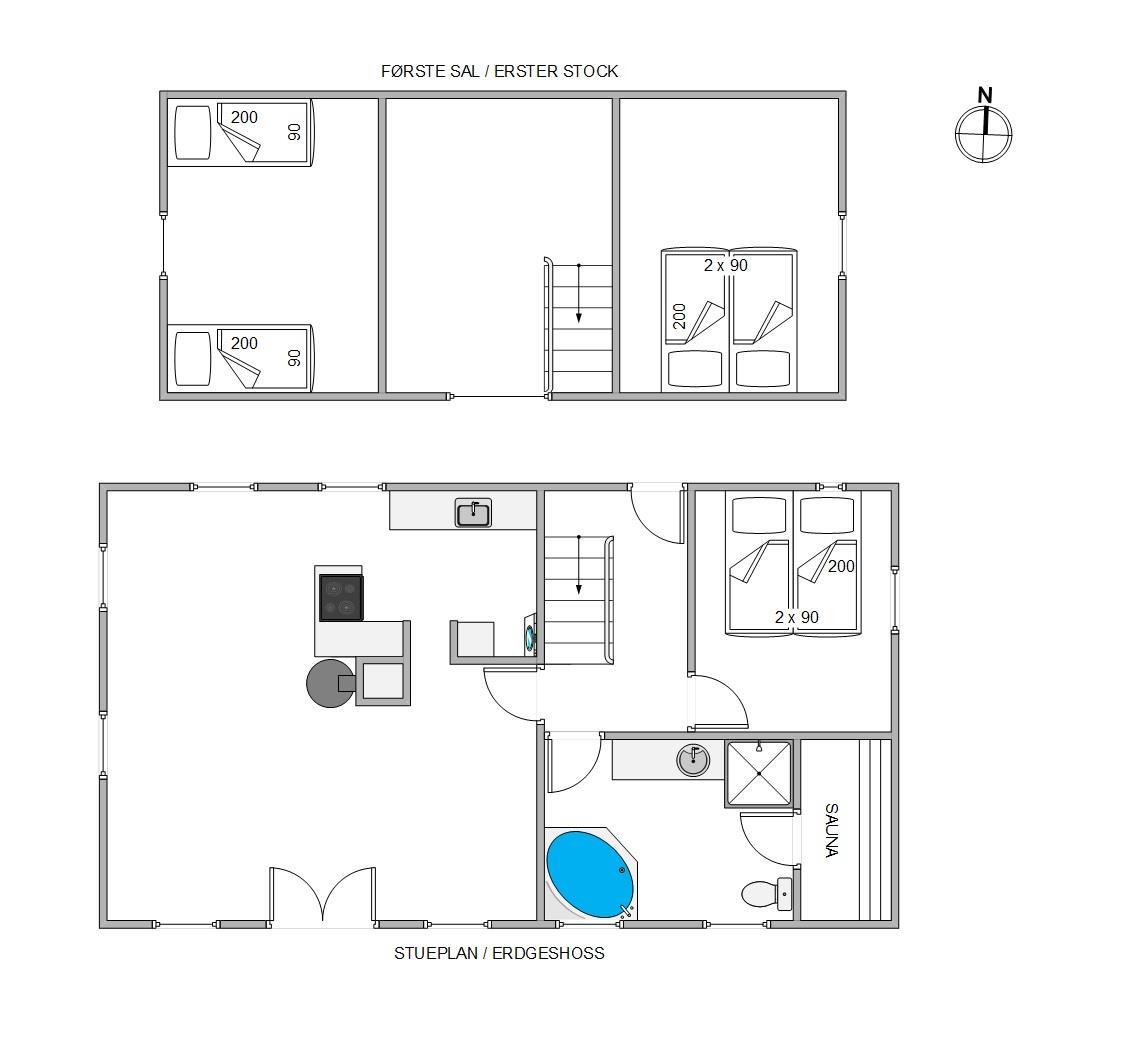 Med et boligareal på 128m2 fordelt på 2 etager, har I her rigeligt plads til sjov, leg og hygge. Det store samlingspunkt for jer i feriehuset er uden tvivl køkkenalrummet, hvor det veludstyrede køkken ligger i åben forbindelse til stuen og spiseplads. Her er der god plads til mange hyggelige timer sammen, og for lidt ekstra ferieatmosfære, kan I tænde op i brændeovnen og nyde den gode varme og den sagte knitren i baggrunden, alt imens der spilles spil omkring spisebordet.