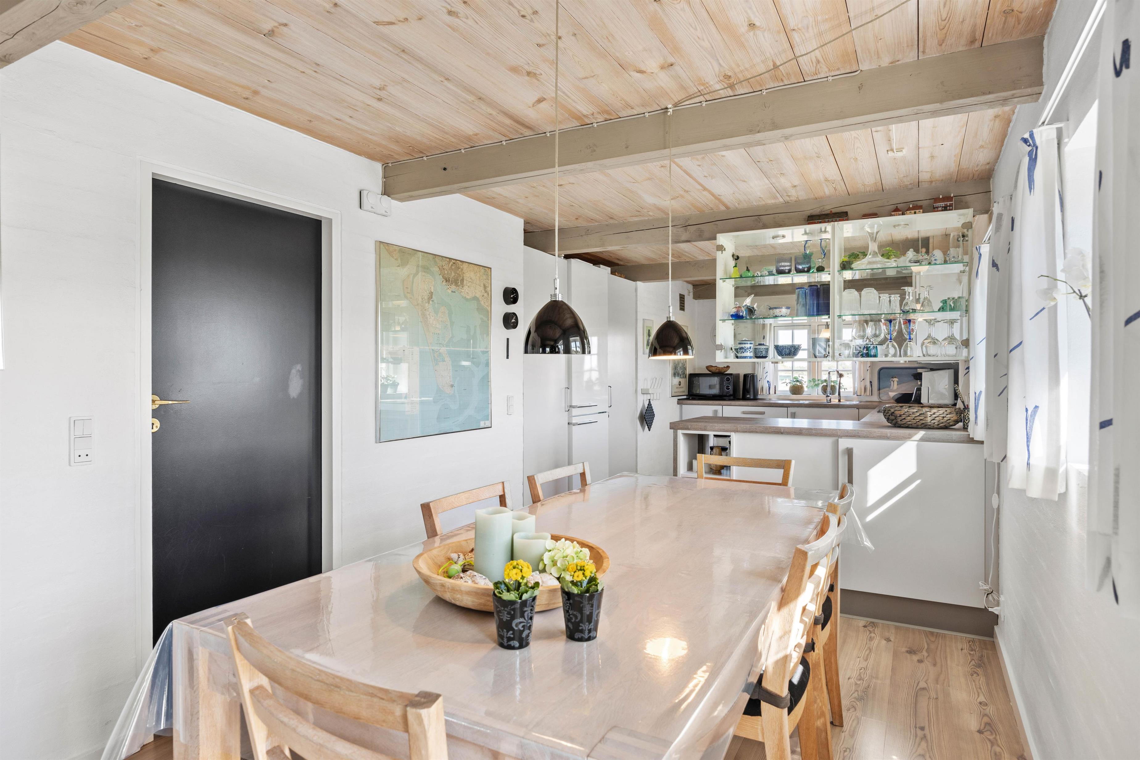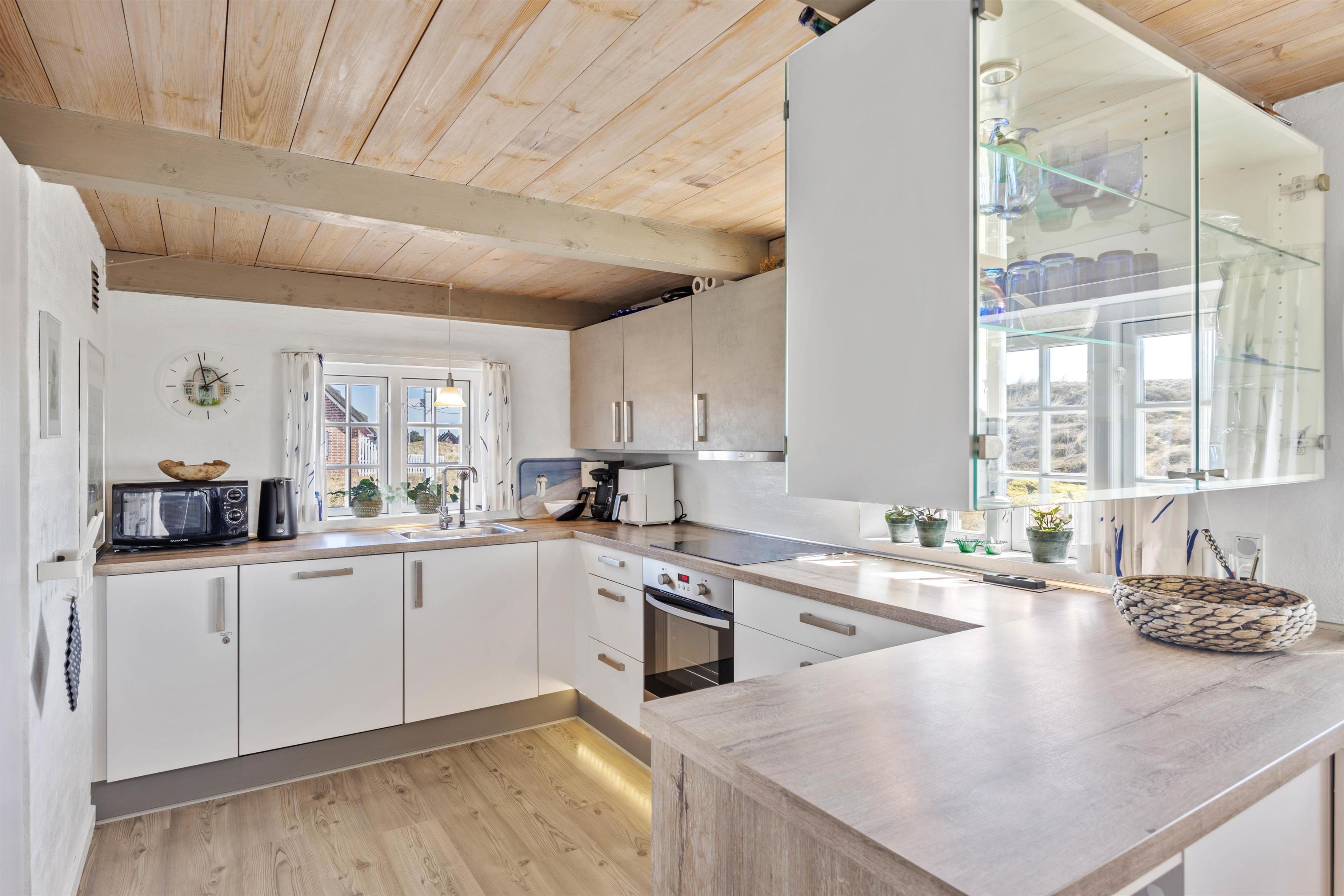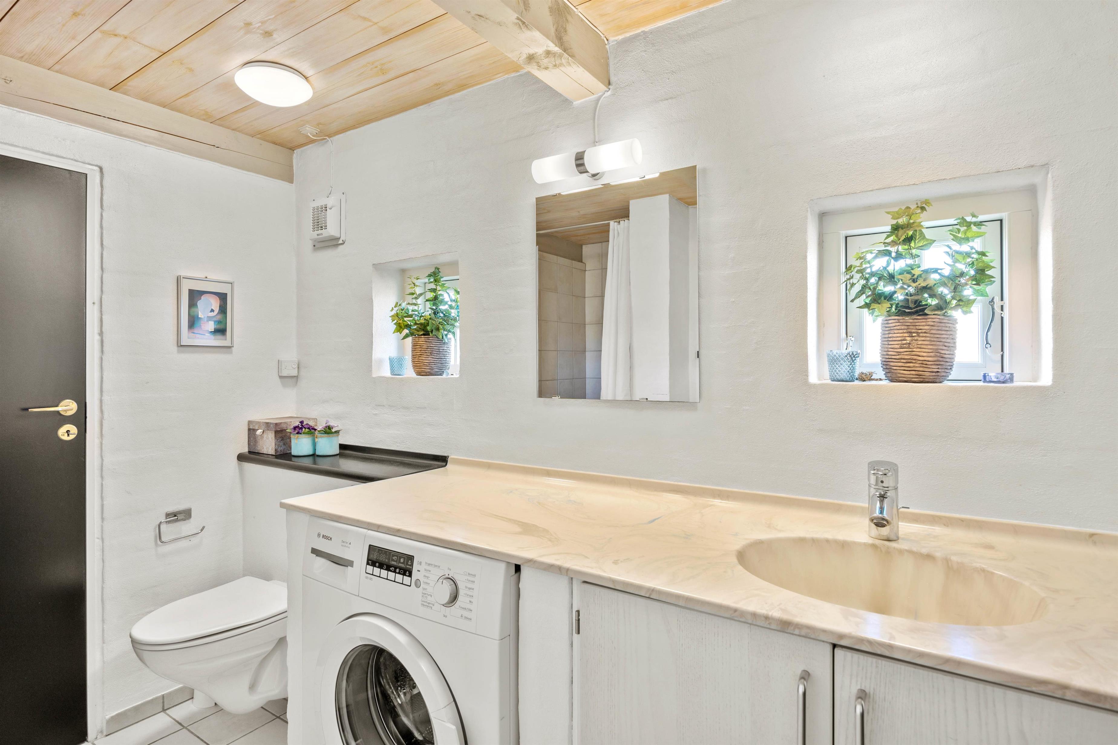 Det moderne, åbne køkken indeholder alt, hvad I behøver for at forkæle hinanden med lækre, hjemmelavede måltider, herunder induktionskomfur, opvaskemaskine og mikroovn. Badeværelset har gulvvarme og direkte adgang til saunaen. Praktiske faciliteter som en vaskemaskine gør, at I også kan friske håndklæderne op i løbet af ferien.
