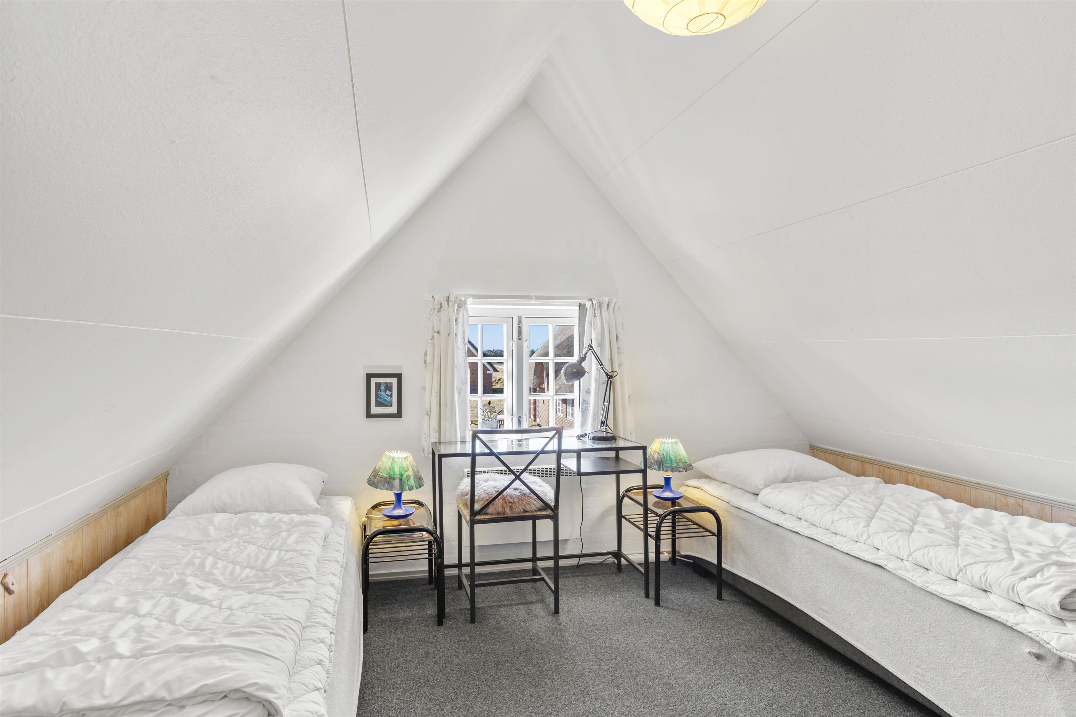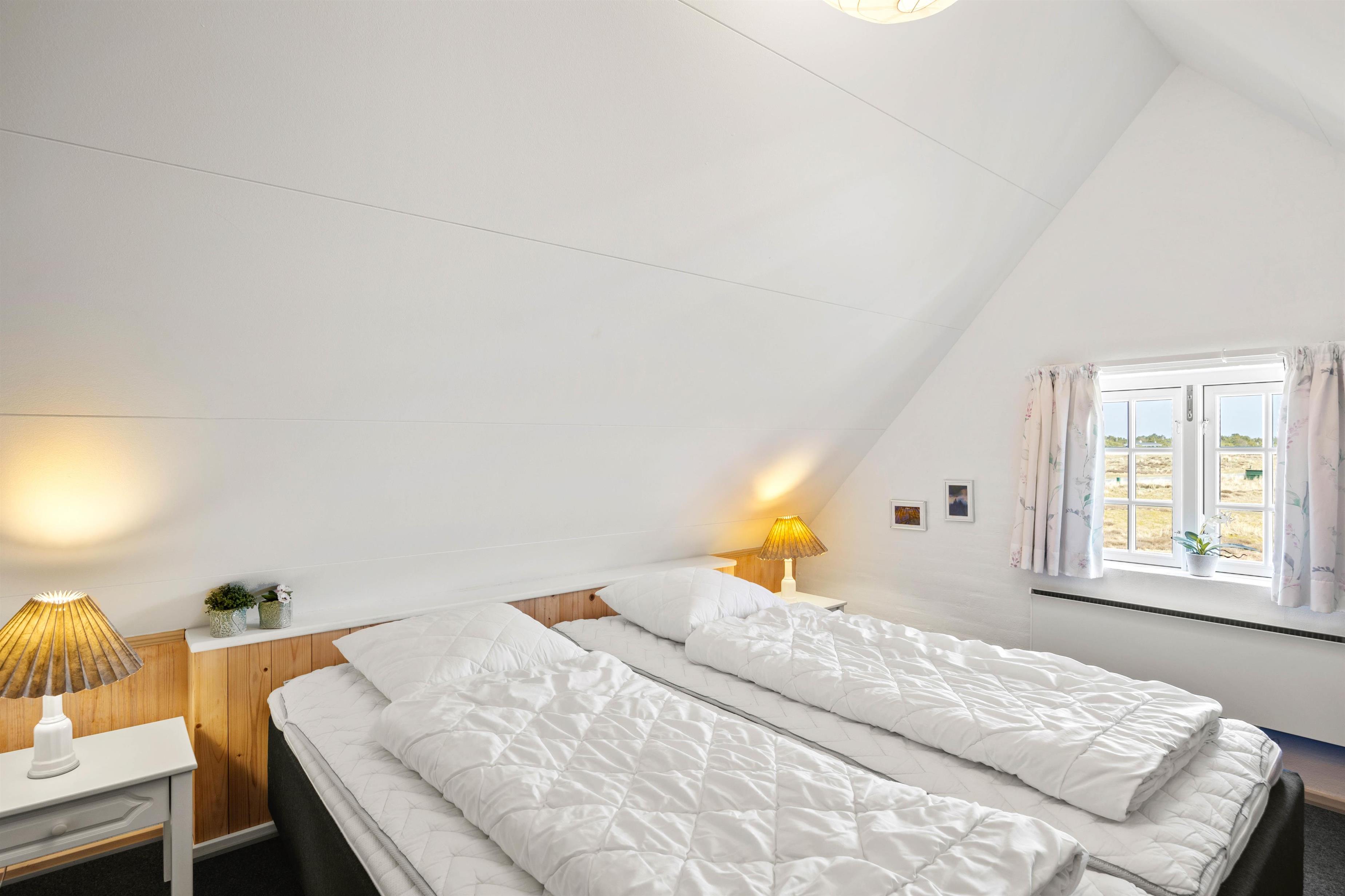 De 2 hyggelige soveværelser ligger på 1. sal: det ene er indrettet med en dobbeltseng og det andet med 2 enkeltsenge, så her kan I fordele jer, som det passer jer bedst.