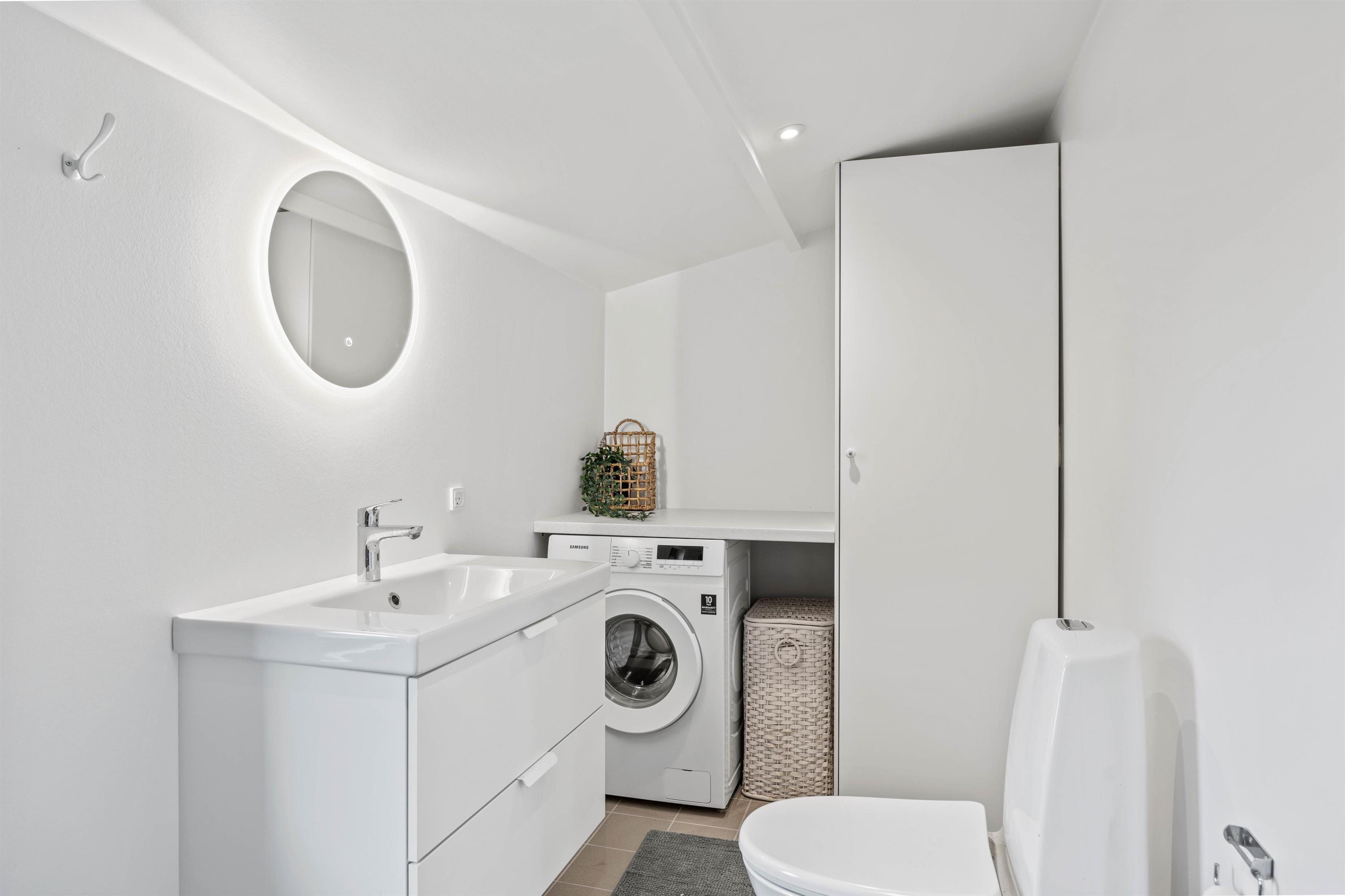 Det lyse badeværelse med gulvvarme sørger for ekstra komfort – især på kolde dage. Her er desuden også vaskemaskine.