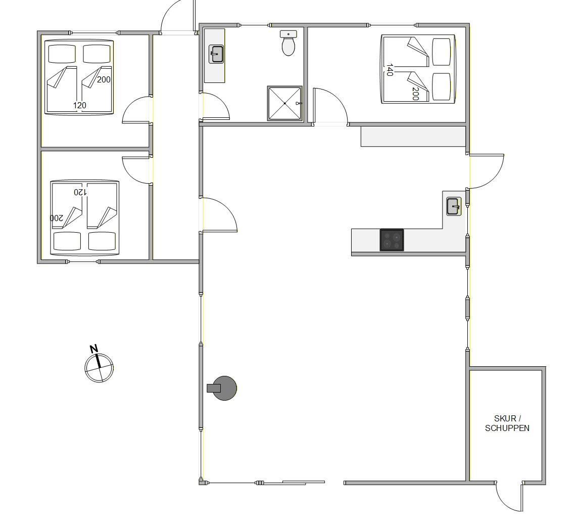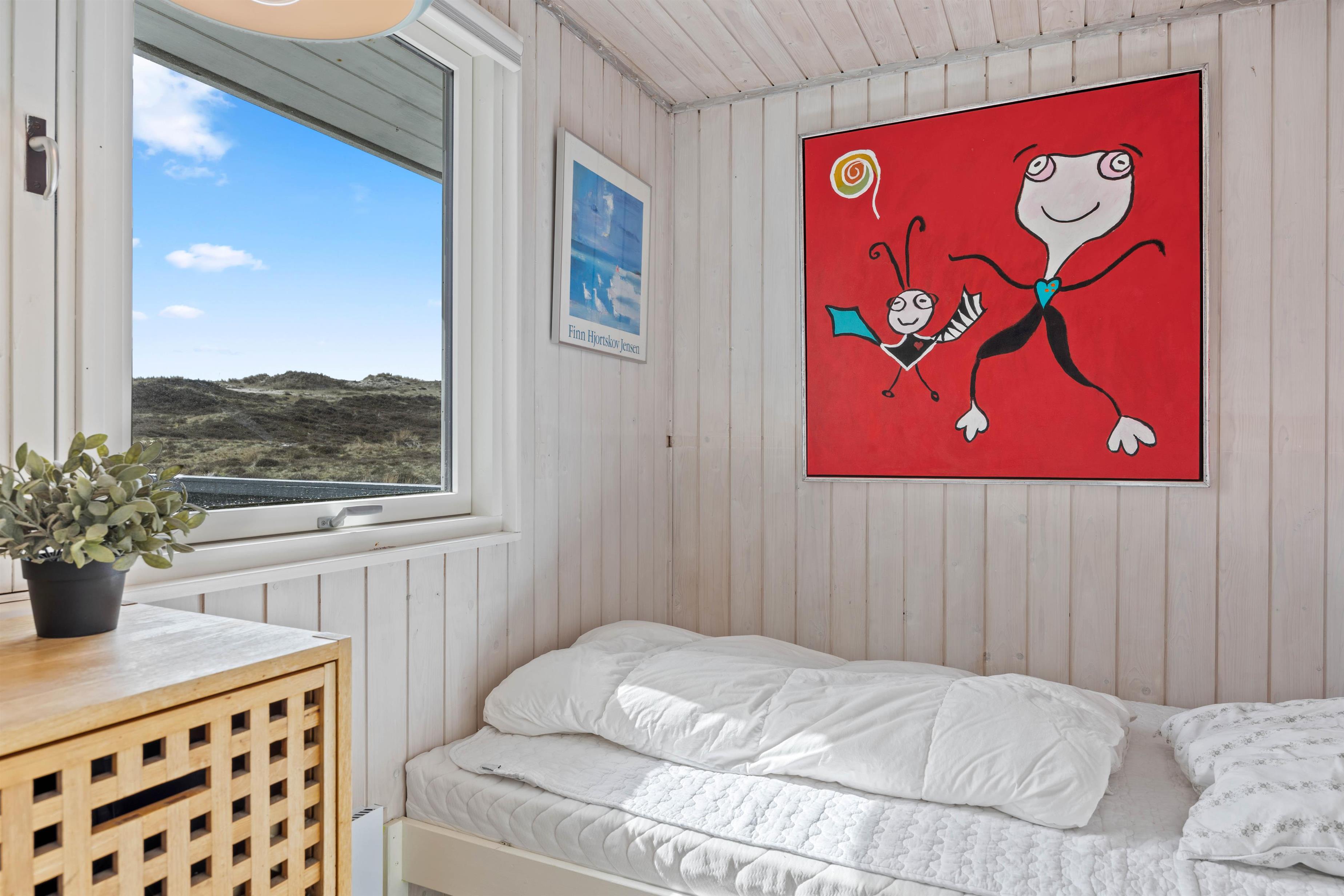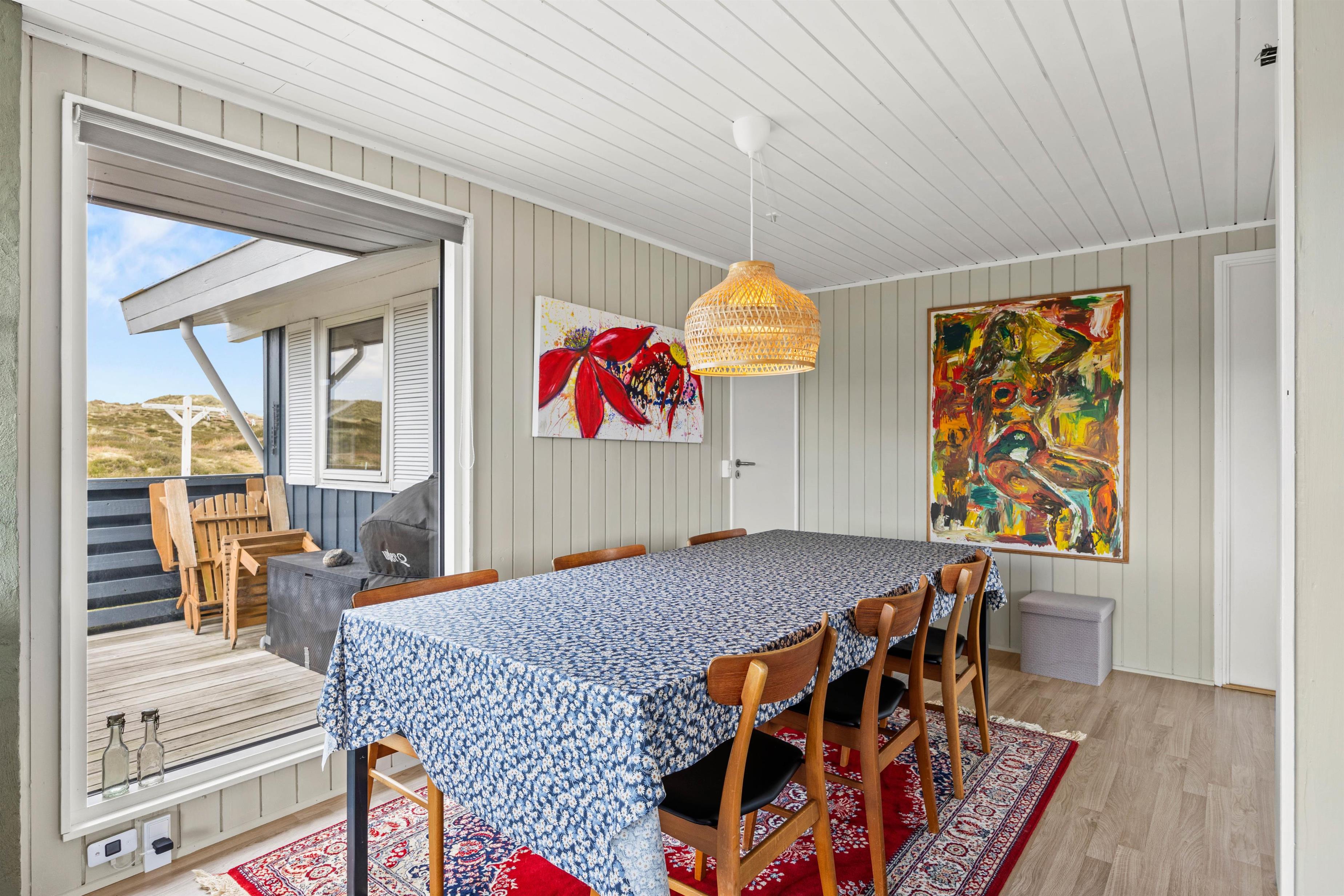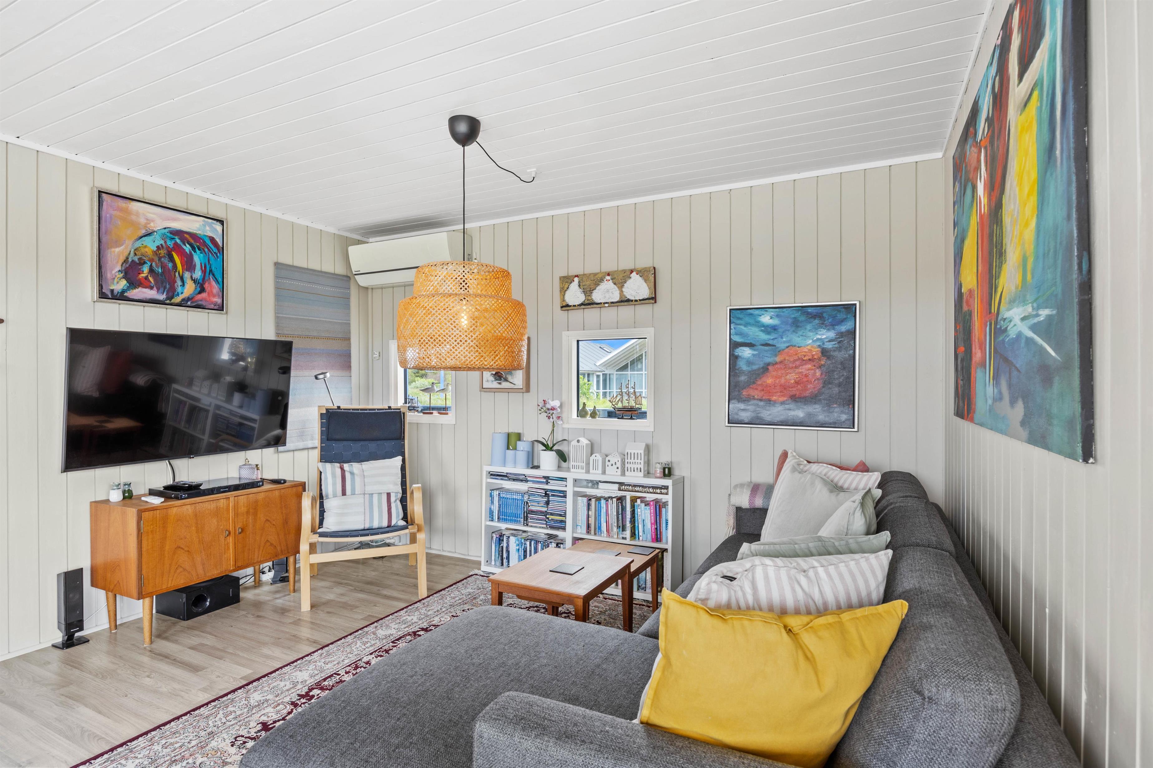 Allerede når I træder ind i sommerhuset, vil I kunne mærke stemningen af sommerhusferie. Væggene og loftene i hele sommerhuset er beklædt med træ og malet lyst. Midtpunktet i dette dejlige sommerhus vil helt sikkert være den hyggelige og lyse opholdsstue, hvor stue, køkken og spisestue er samlet. Uanset hvor I befinder jer i dette rum, har I en fantastisk udsigt over den smukke natur.