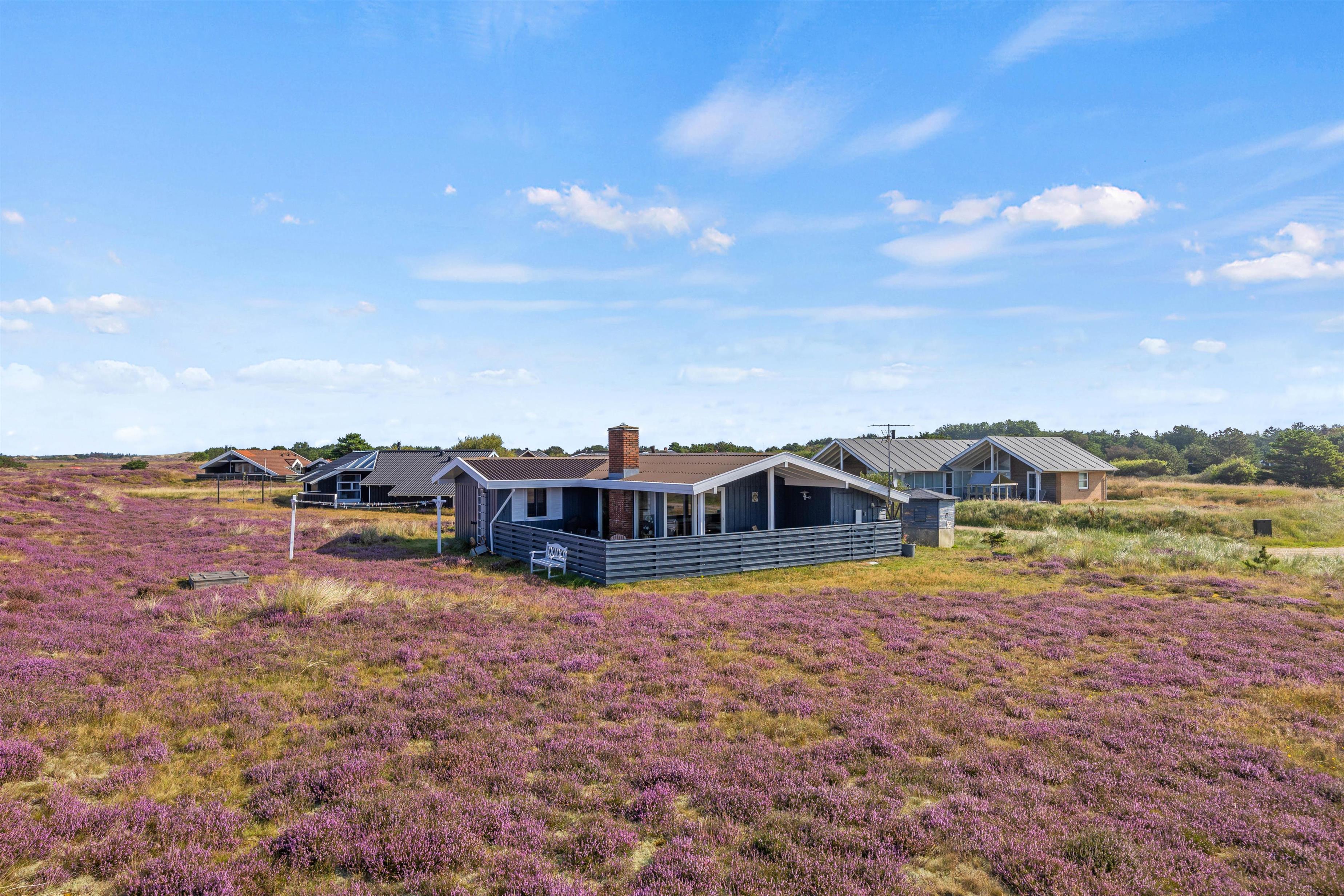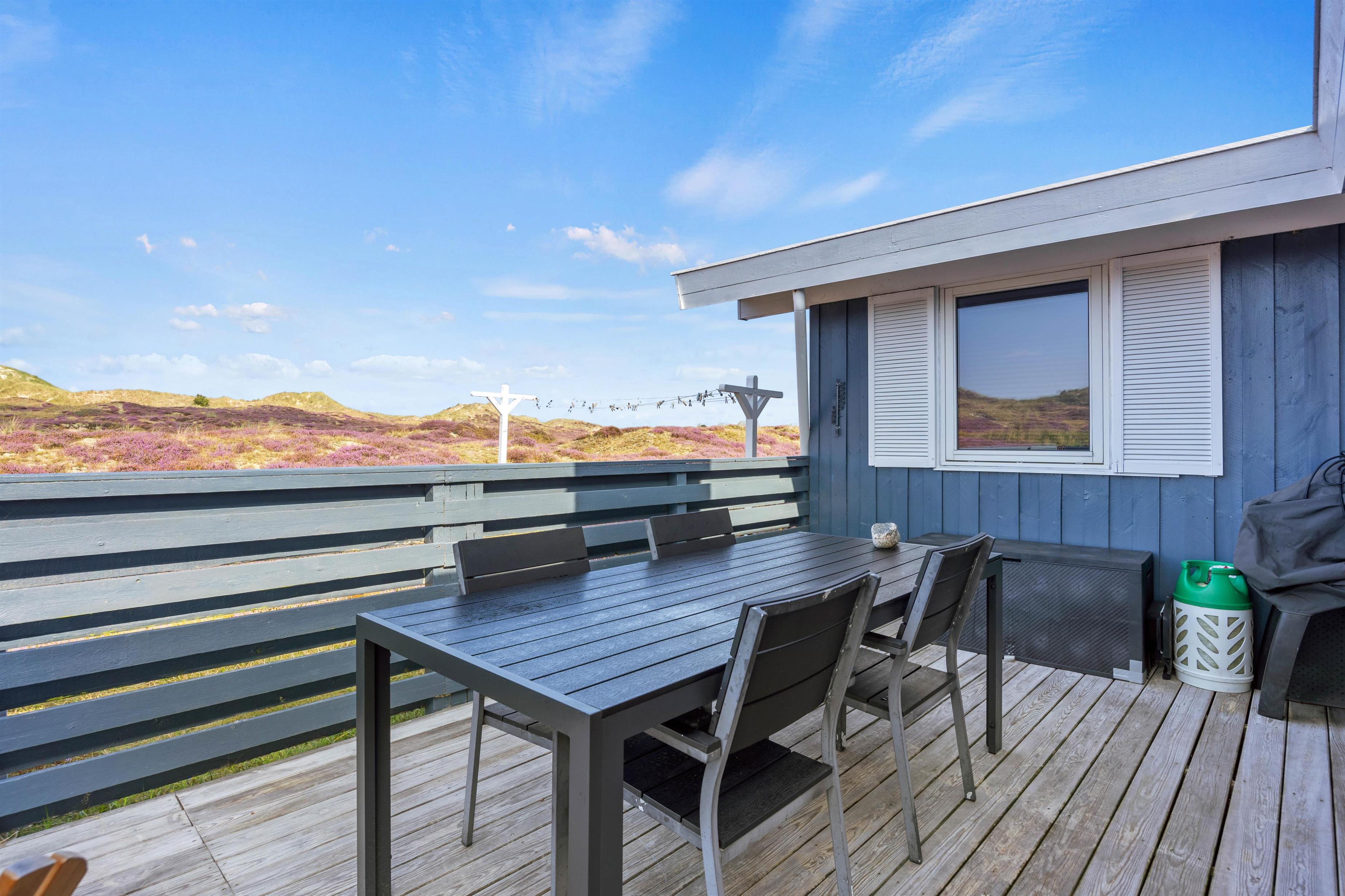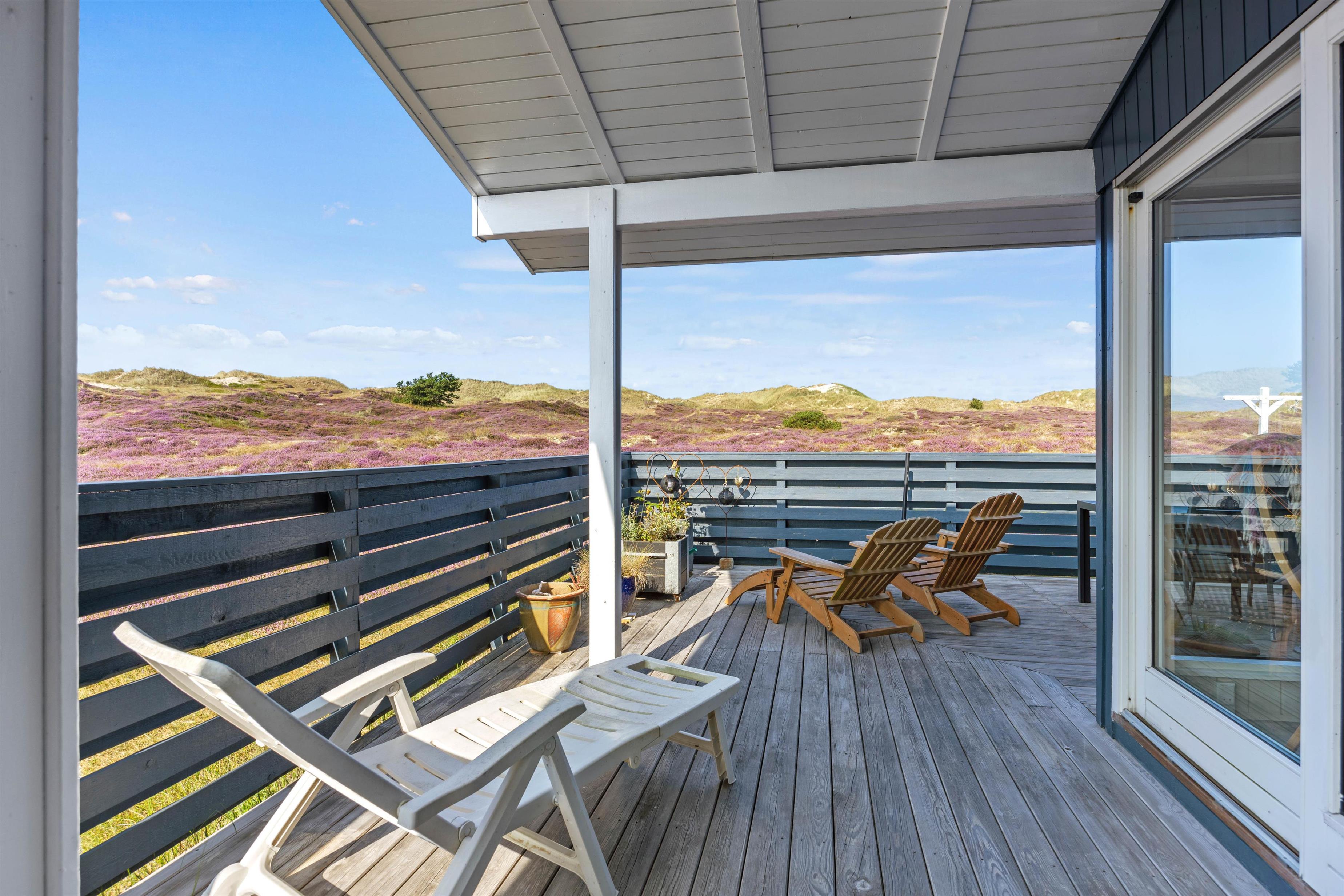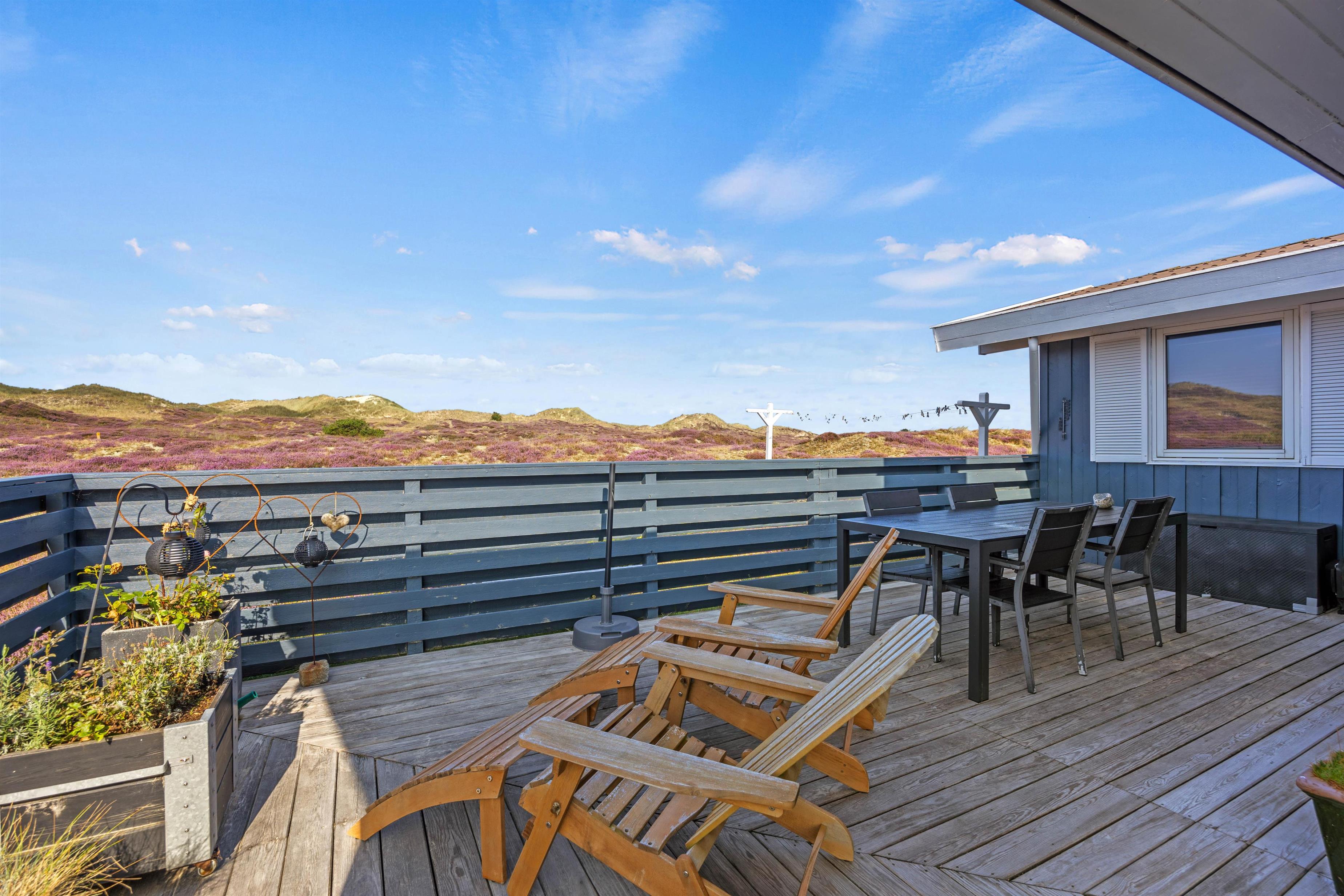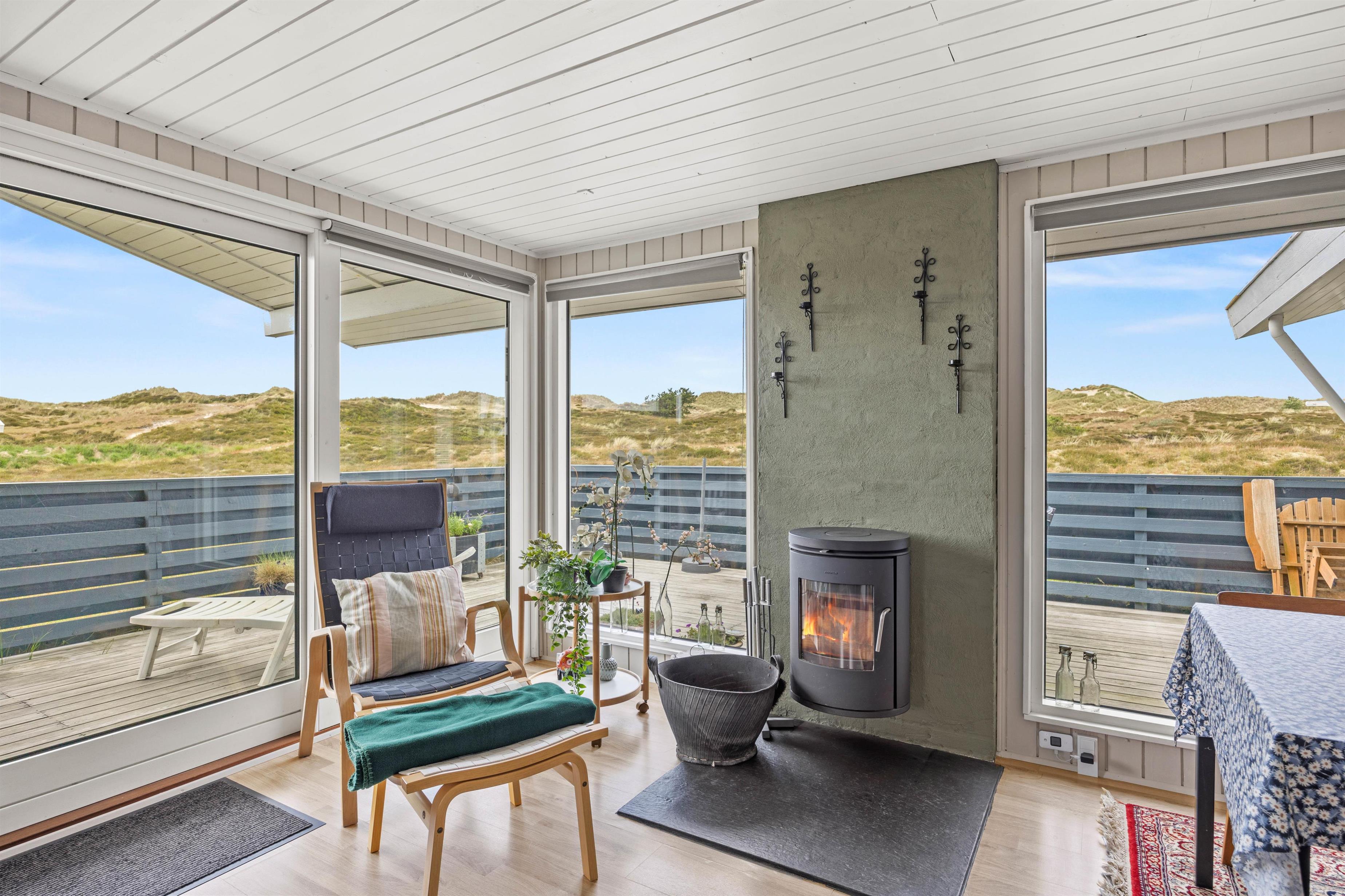 Det hyggelige sommerhus ligger på en fin natrugrund og har en fantastisk udsigt over Fanøs natur. Den lukkede og delvist overdækkede terrasse har både liggestole, havemøbler og grill, så I kan nyde sommersolen her. Mens I nyder roen på jeres lukkede terrasse, kan børnene og hunden bevæge sig frit.