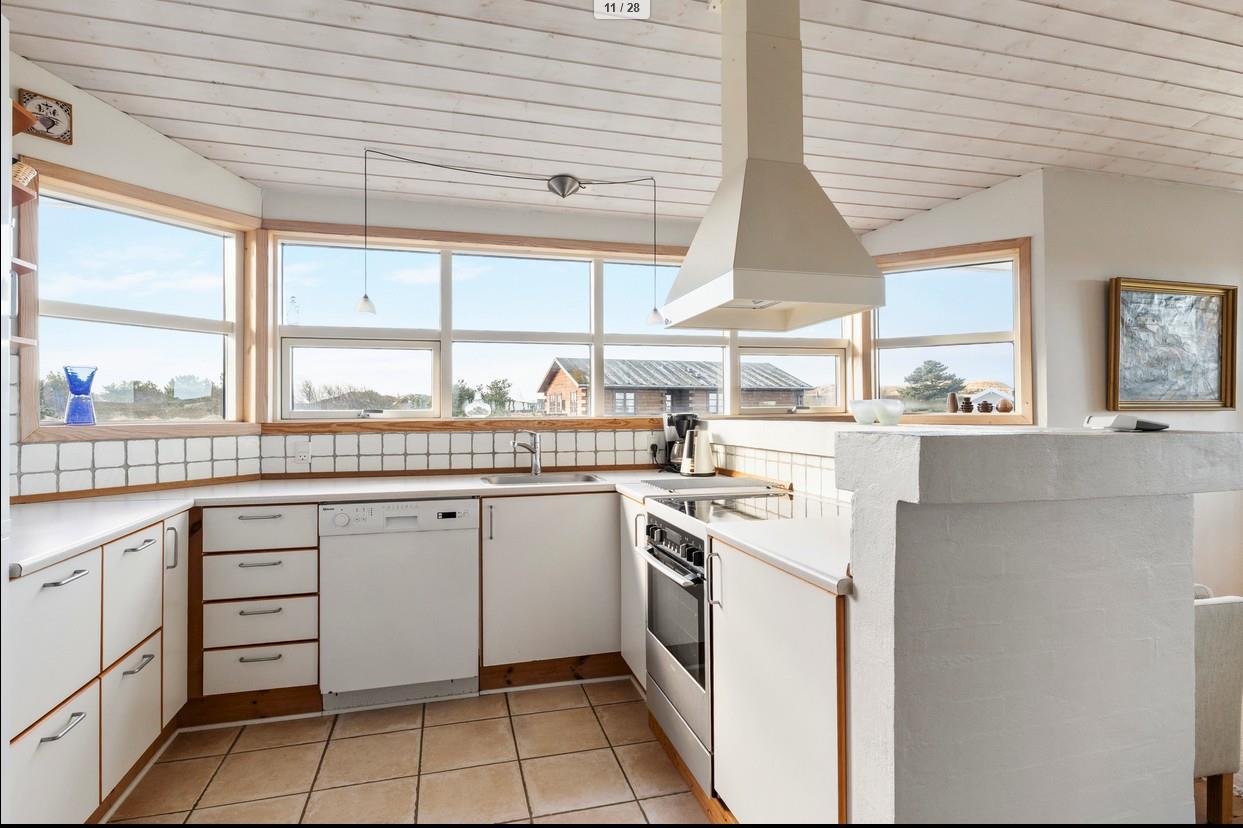 I det lyse køkkene giver de mange vinduer en skøn udsigt over naturgrunden og klitterne. Sommerhuset er udstyret med opvaskemaskine og vaskemaskine, der sparer dig tid, så du kan fokusere på at nyde din ferie. En luft til luft varmepumpe sørger for, at feriehuset altid har en behagelig temperatur, uanset vejret udenfor. Når det er tid til udendørshygge, kan I samle jer om grillen på den overdækkede terrasse, perfekt til hyggelige sommeraftener.