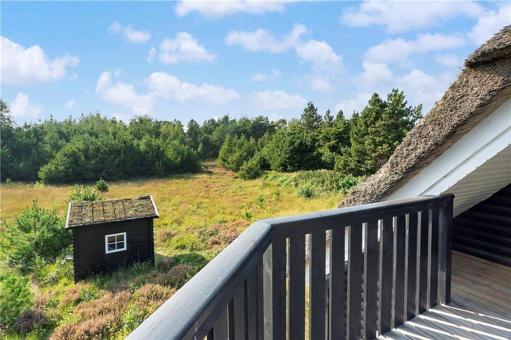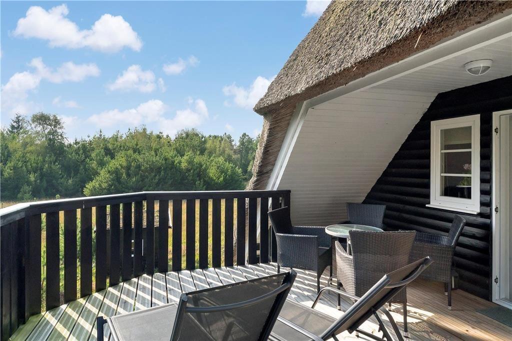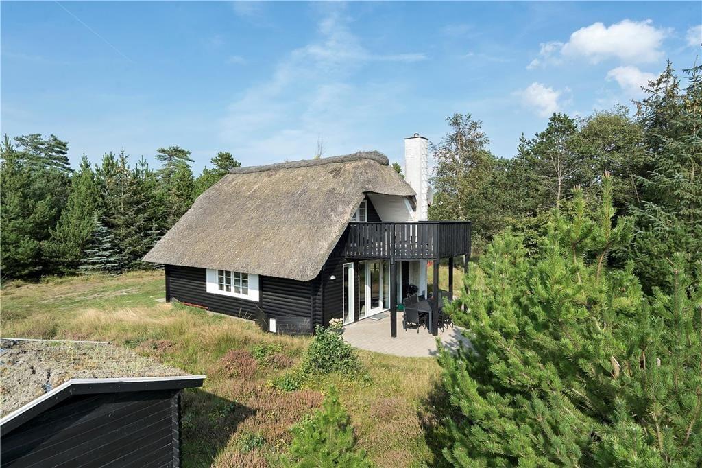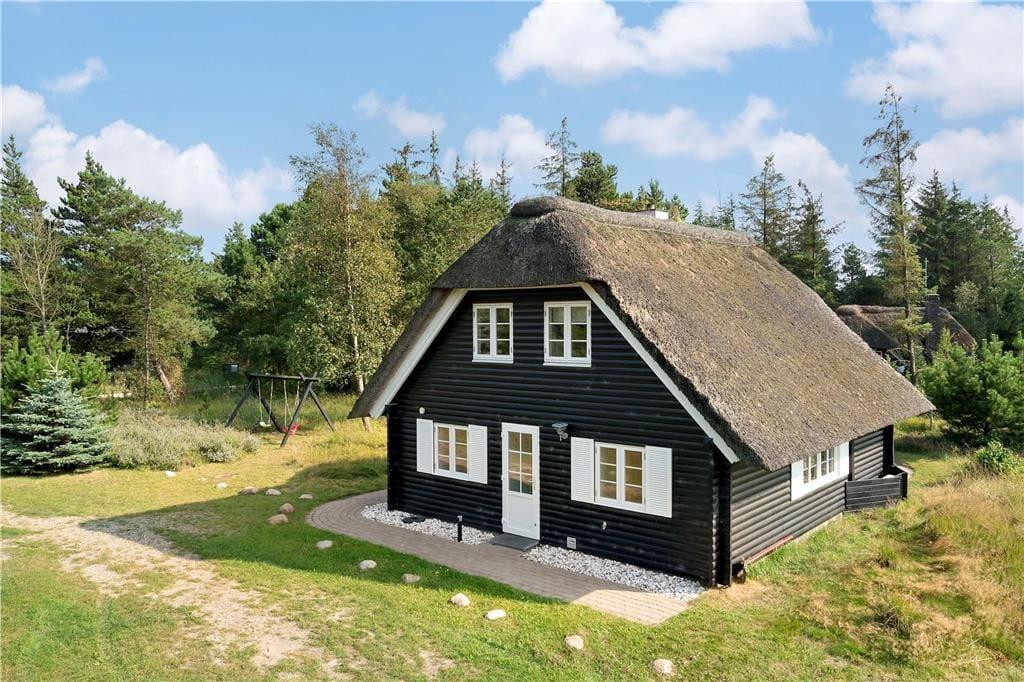 Med stråtag, hvide sprossevinduer og sort træfacade har sommerhuset et kønt og klassisk look, hvilket stemmer fint overens med den behagelige atmosfære inden døre. Efter et renoveringsprojekt i 2015, hvor blandt andet opholdsrummet i stueplan og førstesalens soveafsnit blev opdateret, består sommerhusets indretning af et vellykket mix af pænt og komfortabelt møblement, hyggeskabende detaljer og moderne bekvemmeligheder – inklusiv wifi, varmepumpe og vaskemaskine. Planløsningen i stueplan byder kort fortalt på en entré med vaskefaciliteter, et badeværelse med bruseniche, et soveværelse med dobbeltseng og et opholdsrum med integreret køkken og stue. På førstesalen finder I yderligere tre soveværelser samt en tv-stue, der har direkte adgang til sommerhusets store og skønne altan.