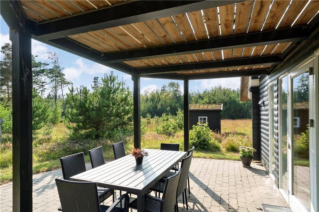 Altanen er et dejligt opholdssted, når I gerne vil nyde udsigten over de fredelige og flotte naturomgivelser lidt fra oven. Alternativt kan I slå jer ned på den delvist overdækkede fliseterrasse, der ligesom altanen vender mod syd og dermed er perfekt i forhold til solen. Terrassen fungerer som en perfekt ramme for både solbadning og grillmiddage – mens gyngestativet og sandkassen er en skøn detalje, hvis de yngste familiemedlemmer trænger til at lege og brænde energi af.