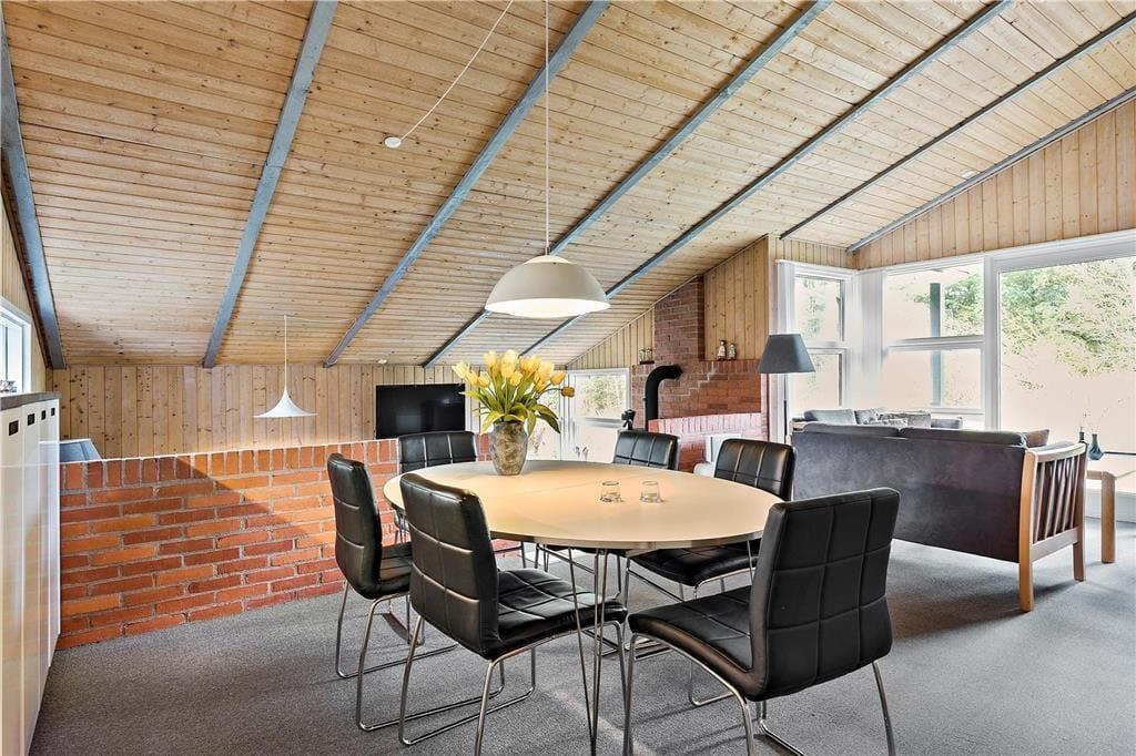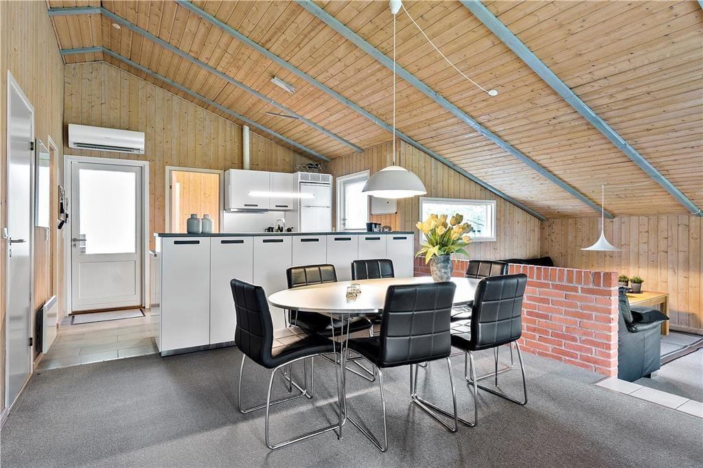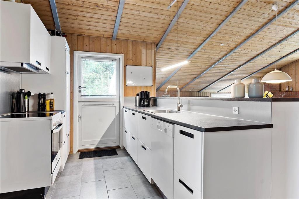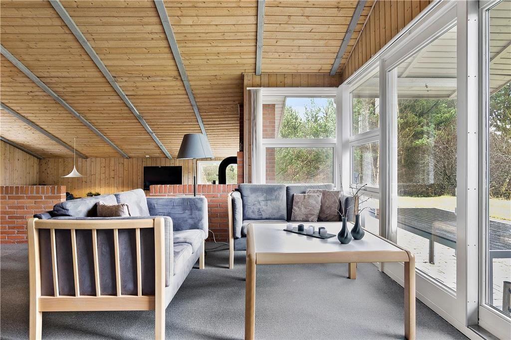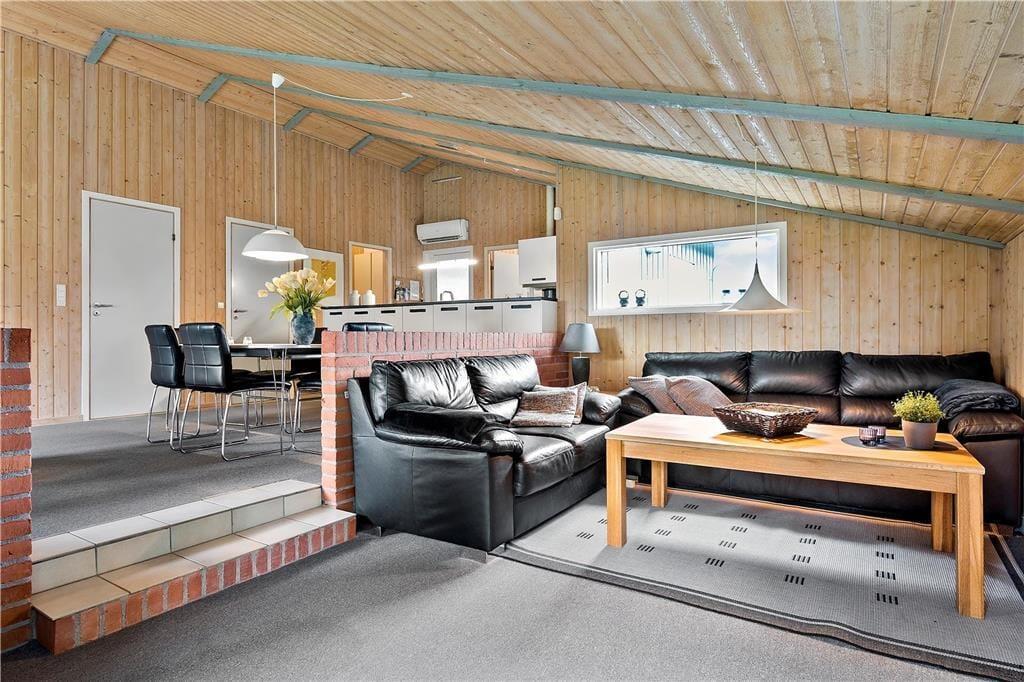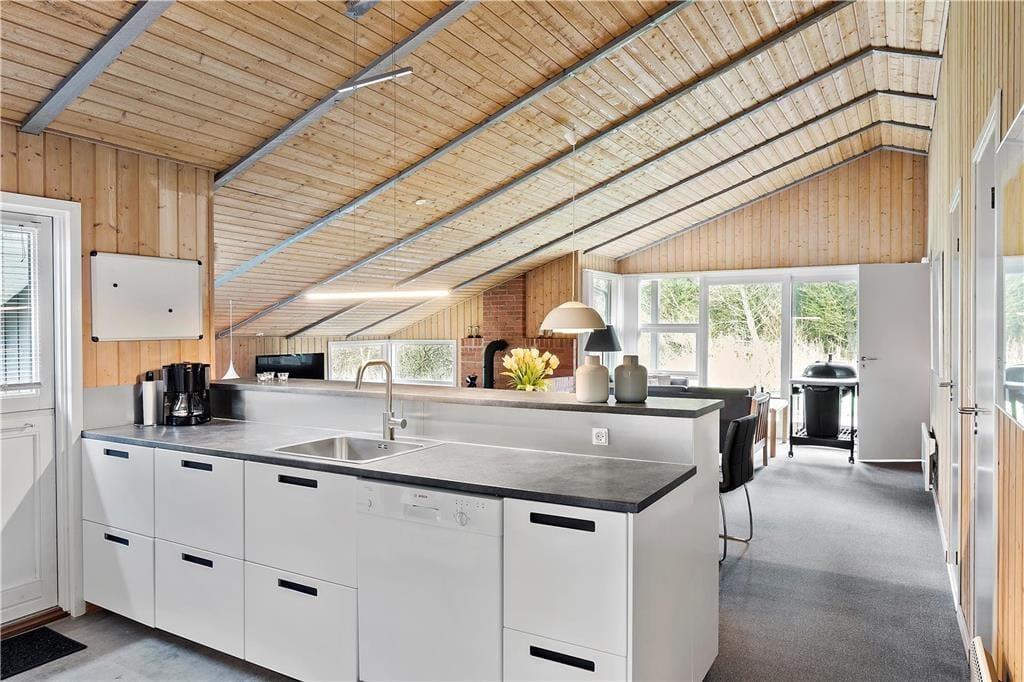 Sommerhusets 85 velindrettede kvadratmeter byder blandt andet på et rummeligt badeværelse med sauna samt tre gode soveværelser, der i alt har plads til seks feriegæster. Størst af alle er dog opholdsafdelingen, der består af køkken og stue i åben forbindelse. En del af stuen ligger sænket, og netop her er der indrettet en skøn hyggekrog med brændeovn, fladskærms-tv og bløde sofaer. Når det er ved at være spisetid, kan I gå i gang med at fremtrylle lækkerier i den veludstyrede og funktionelt indrettede køkkenafdeling. Alt efter vejret kan I tage varmepumpen i brug – den kan for øvrigt også køle, hvilket kan være rart i sommerperioden. Som en praktisk detalje er der installeret solcelleanlæg i sommerhuset, så energiforbruget holdes i bund.