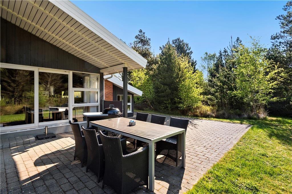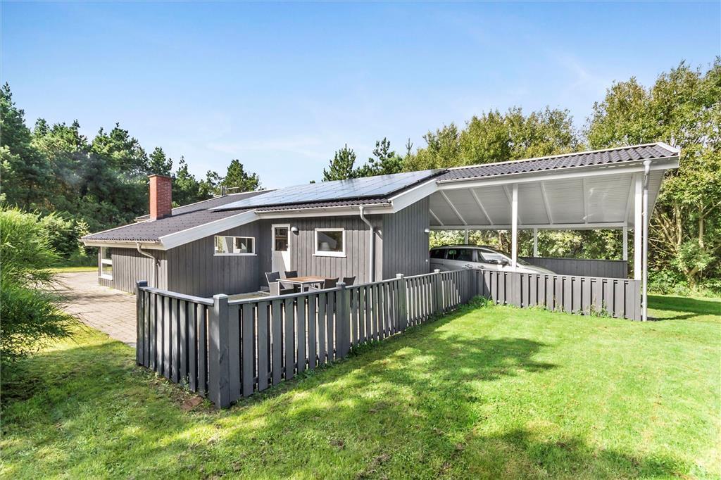 En stor, delvist overdækket fliseterrasse smyger sig om tre sider af sommerhuset, og derfor er det nemt at finde en skøn opholdsplads uanset solens placering på himlen. I kan også slænge jer og lege på græsplænen, der ligesom terrassen er dejligt ugeneret og fredelig takket være grundens frodige randbeplantning. Også bilen får gode forhold, for den kan blive parkeret i carporten, der ligger i forlængelse af sommerhuset.