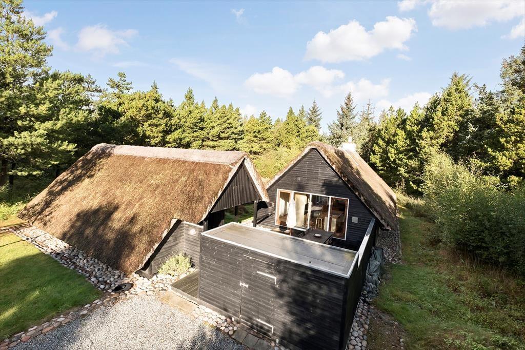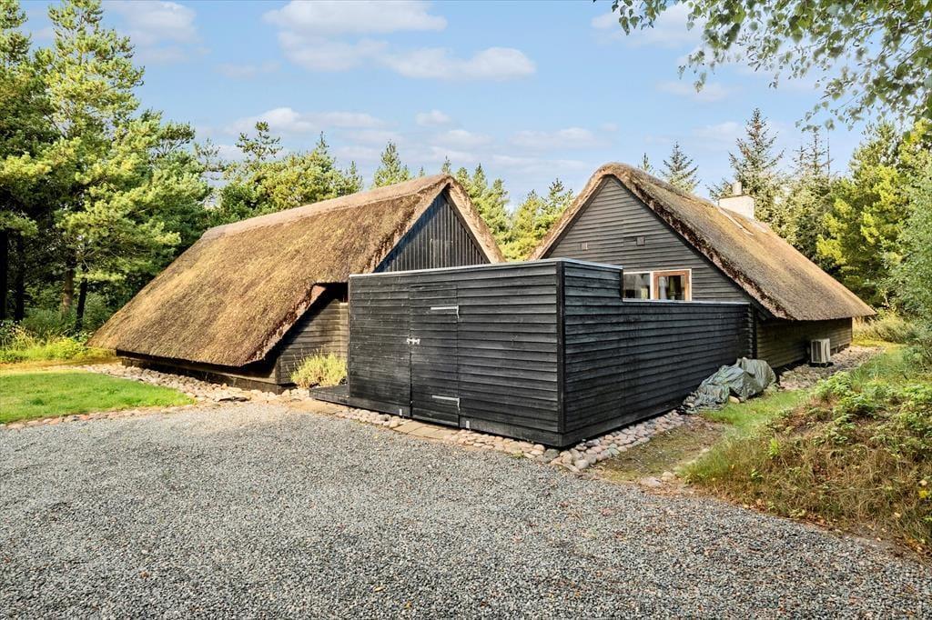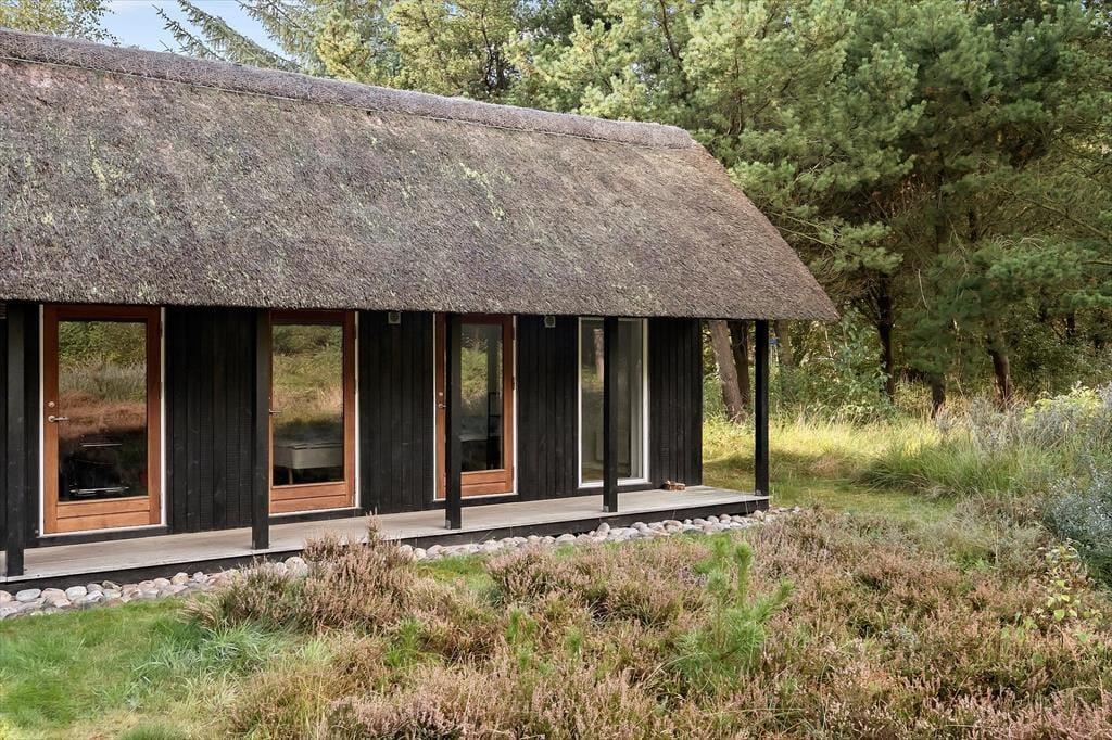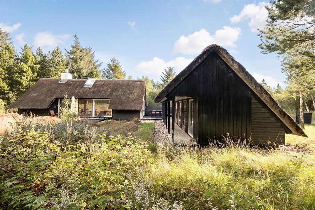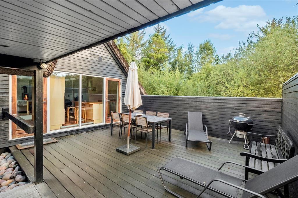 På den 2533 m² store naturgrund kan I se frem til at slappe af og nyde ferielivet i fulde drag. Mellem hovedhuset og annekset ligger en sydøstvendt træterrasse, der afskærmes af plankeværk, så det er en fredfyldt og ugeneret oase. Fra hovedhuset kan I også træde direkte ud på en vestvendt træterrasse, og det er det helt rette sted at slå sig ned, når I vil nyde det kønne syn af grundens lyng, krogede fyrretræer og anden fritvoksende beplantning.