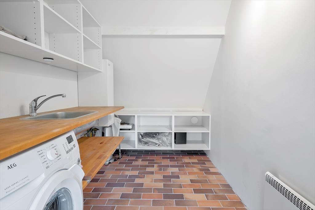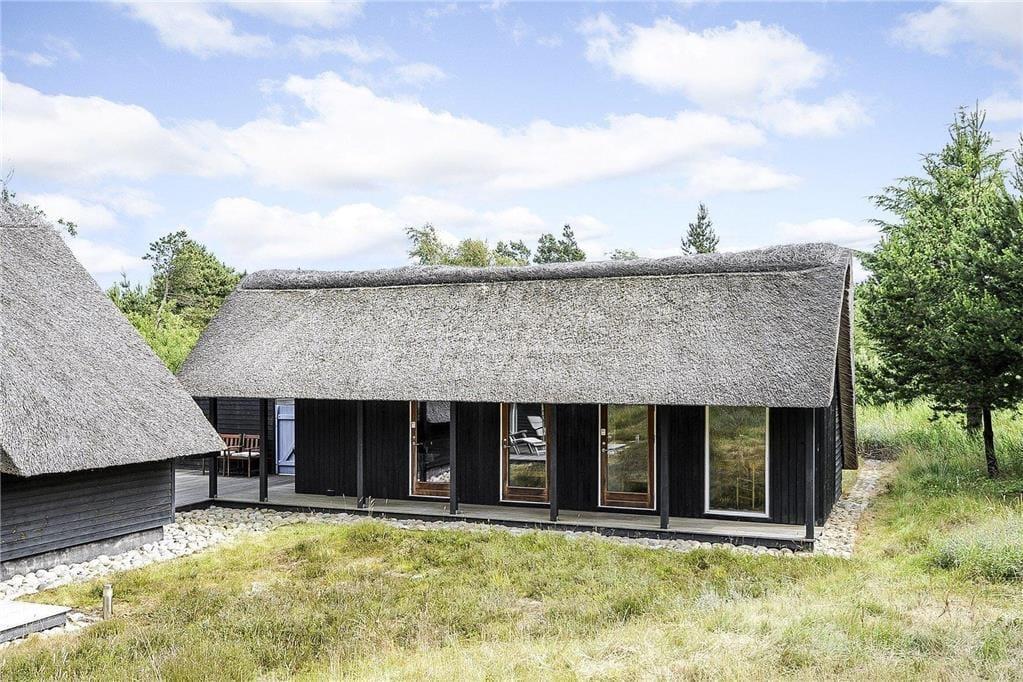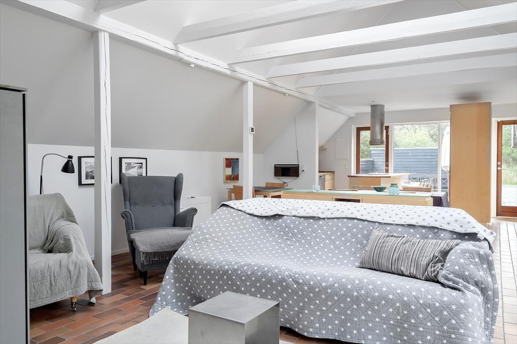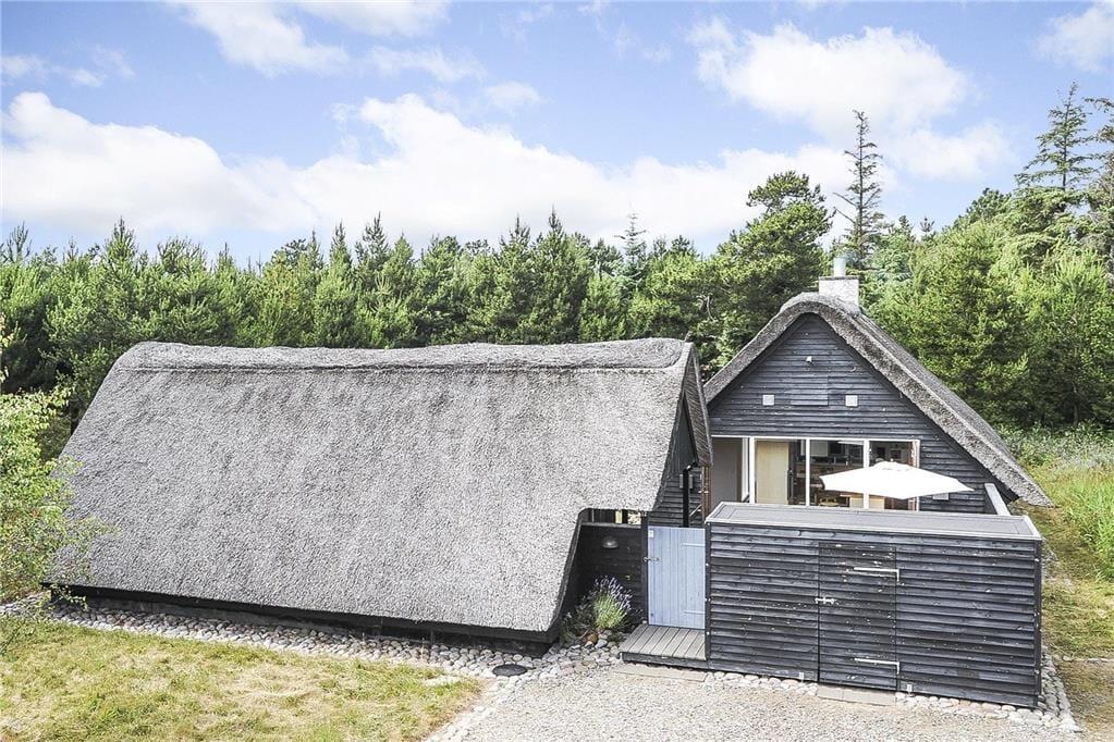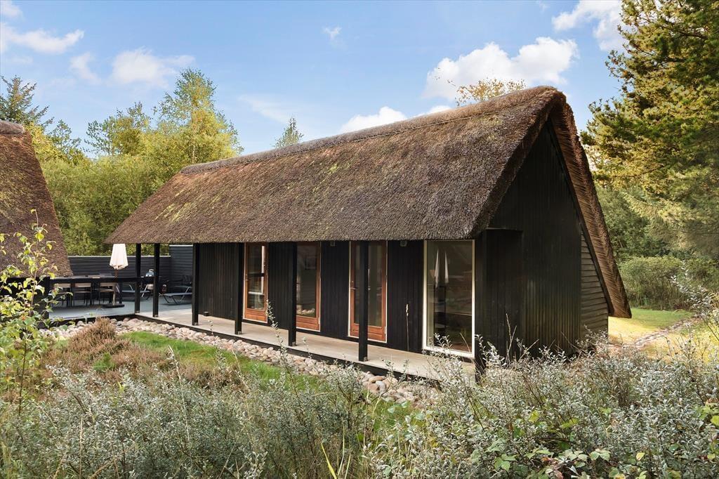 Sommerhuset er et flot og velholdt byggeri med stråtag og mørk træfacade, og det tilhørende anneks er opført i samme tjekkede stil. Den originale arkitektur får I også glæde af inden døre, hvor opholdsrummet imponerer med loft til kip, ovenlysvinduer og store glaspartier mod syd og vest, der giver jer udsigt til naturgrunden. Brændeovnen er også med til at bidrage til den behagelige rumfornemmelse, så I hurtigt kan føle jer godt til rette, når I slapper af i sofaen, sidder ved spisebordet eller kokkererer i køkkenafdelingen. I hovedhus og anneks er der tilsammen 112 m² at brede sig på. Hovedhuset består af køkken/alrum, soveværelse og badeværelse. I annekset får I soverum med dobbeltseng og ekstraseng, et badeværelse og et praktisk bryggers med vaskemaskine at gøre godt med.