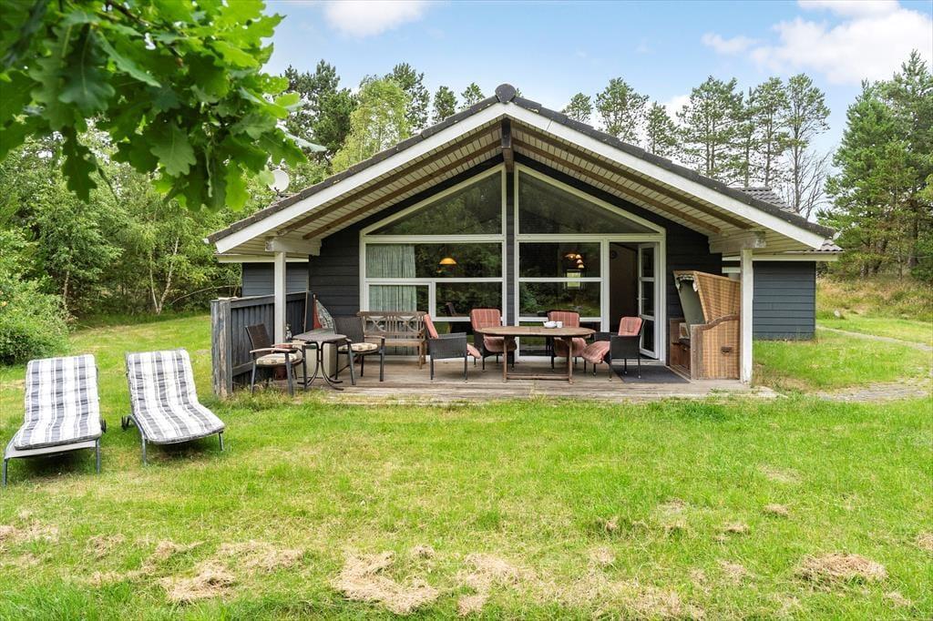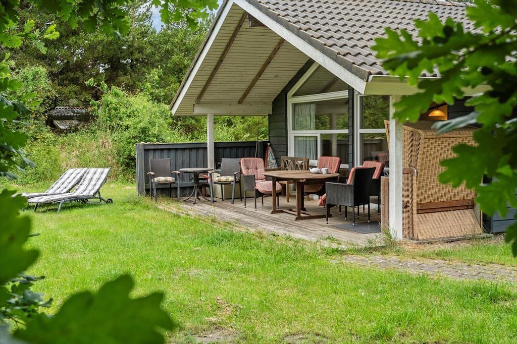 Huset byder på en skøn, delvist overdækket terrasse med plads til afslapning, leg og socialt samvær. Her kan du nyde din morgenkaffe, mens du lytter til fuglekvidder, eller slappe af med en god bog i den rolige atmosfære. Den fine strandkurv bidrager med et lille ekstra til feriestemningen, og de store, åbne arealer inviterer til leg og hyggelige stunder. Sommerhusets ugenerede beliggenhed tæt betyder, at du kan træde direkte ud i den friske luft og mærke brisen fra Vesterhavet.