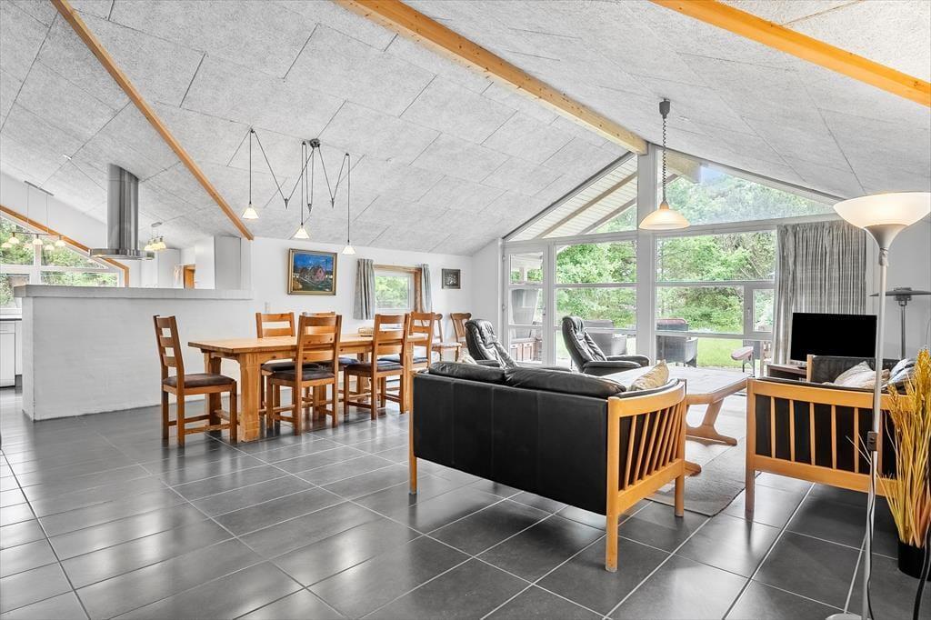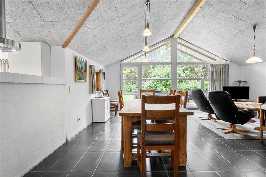 Indenfor åbner sommerhuset op til en stor, lys opholdsstue, hvor komforten er i højsædet. Her finder du masser af plads til afslapning, med bløde sofaer og to lænestole, hvor du kan læne dig tilbage efter en dag fyldt med oplevelser. De praktiske flise- og trælaminatgulve under fødderne bidrager til den varme og indbydende atmosfære, mens de små detaljer, som den charmerende strandkurv på terrassen, tilfører feriestemningen. Det indbydende køkken og spisestue er perfekt til fælles måltider, hvor du kan nyde duften af frisk mad, mens du lytter til fuglene udenfor. Når dagen bliver til aften, kan du blot trække i saunaen, hvor du kan lade hver en muskel slappe af, mens du nyder den særlige ro, som kun Rømøs fredelige omgivelser kan tilbyde. Det er den oplagte måde at genopbygge kræfter efter en dag med eventyr i den unikke natur.