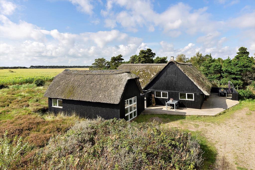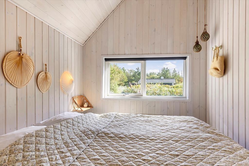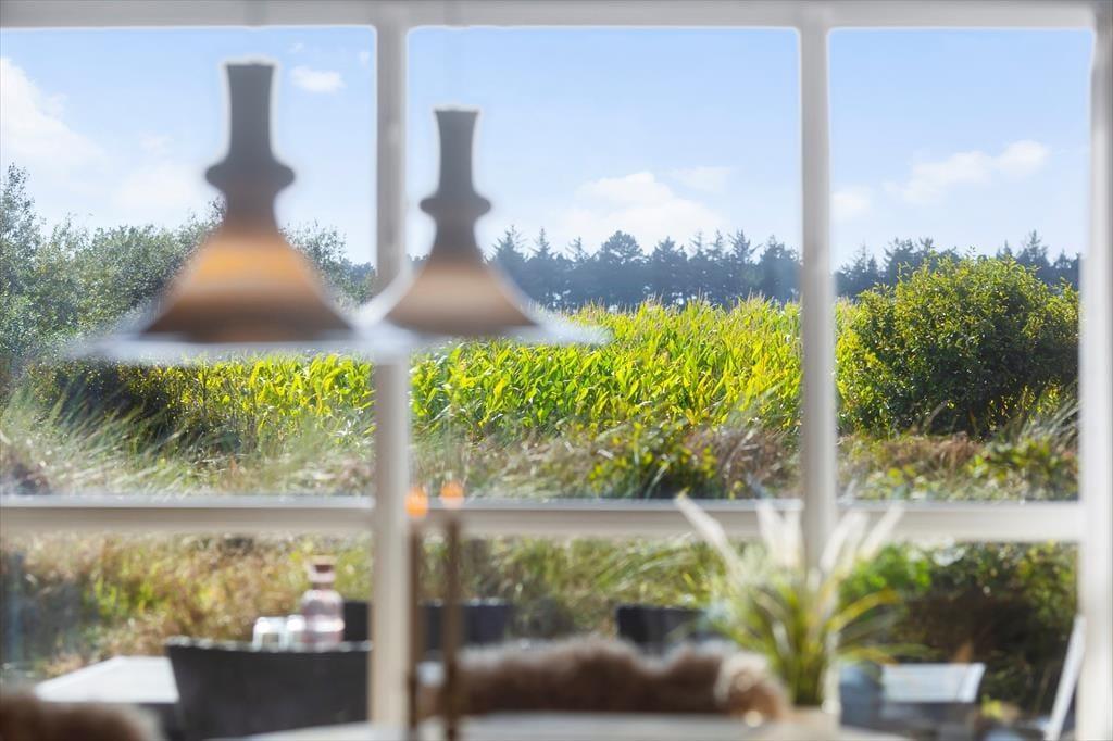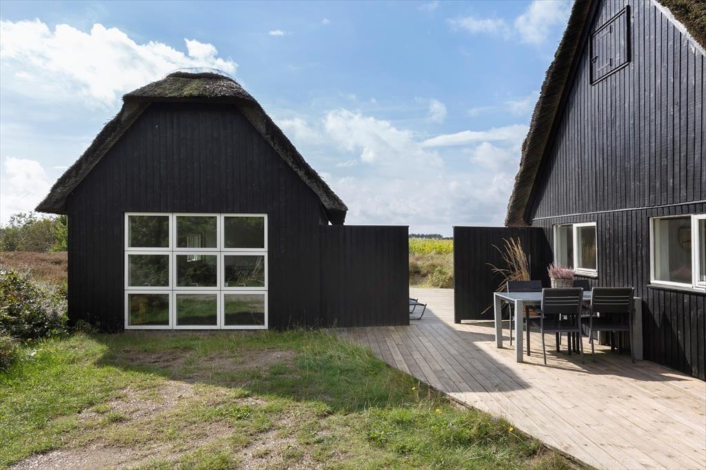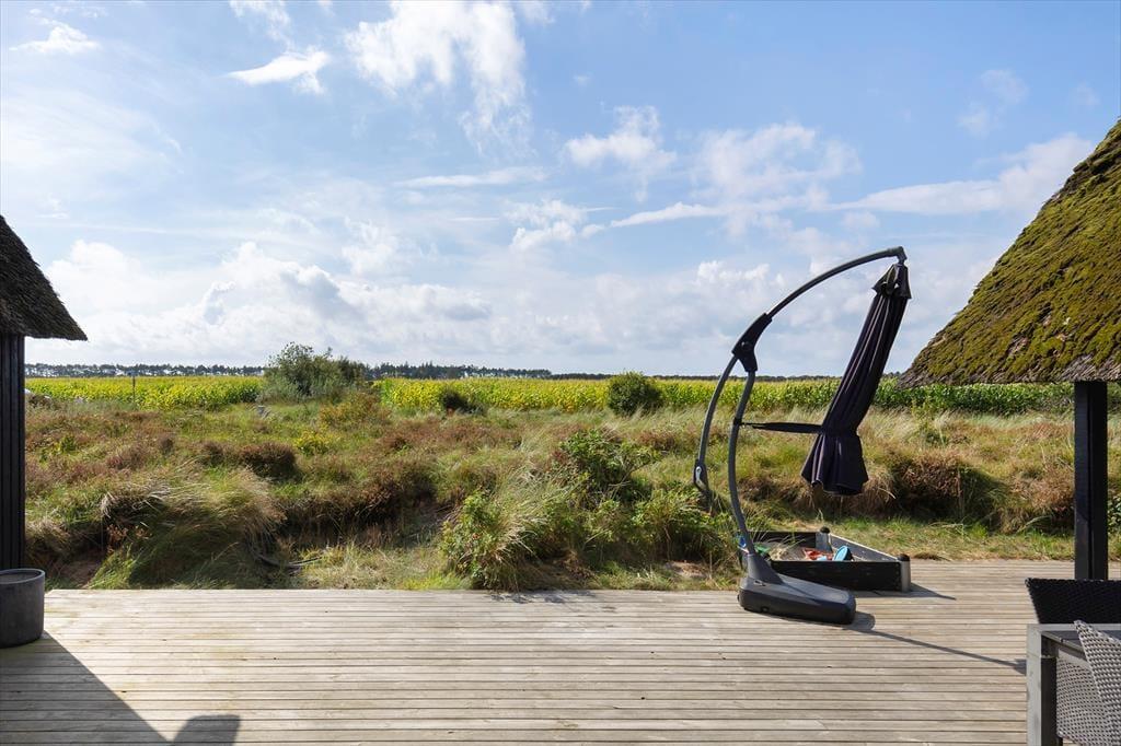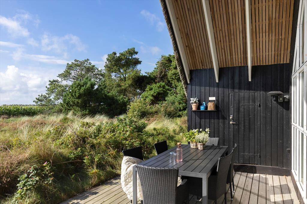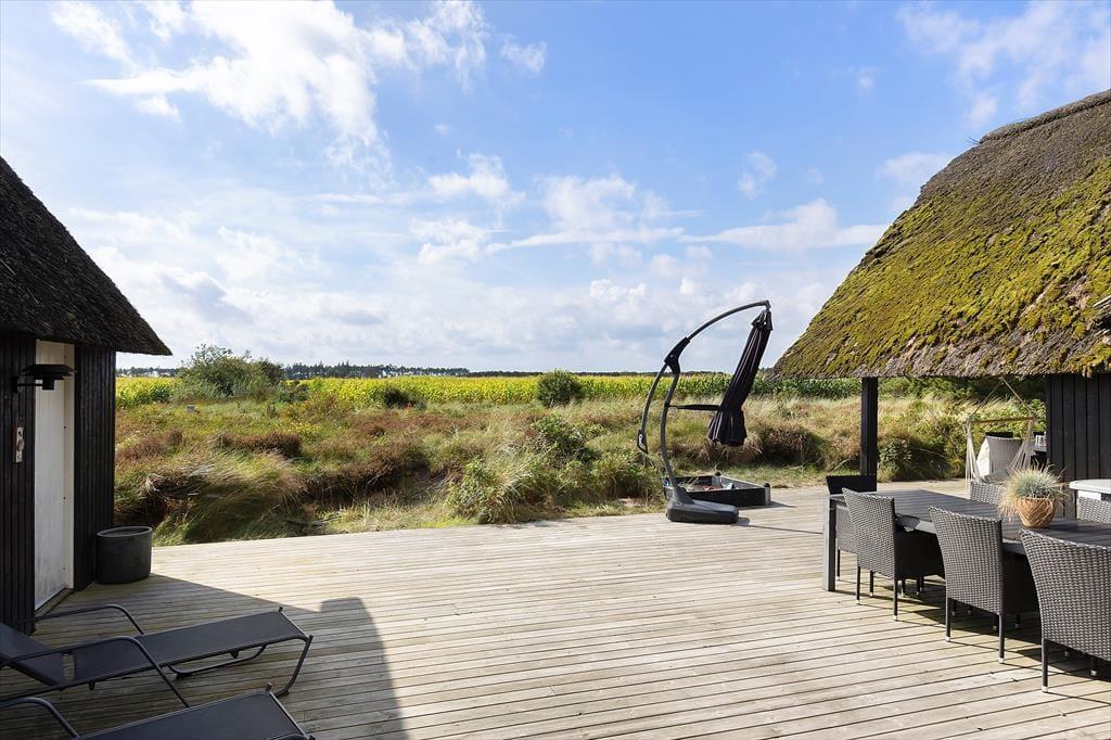 På den store, delvist overdækkede terrasse kan du slå dig ned og nyde udsigten over de åbne marker i retning mod Sønderstrand. På stille dage kan du endda høre havets bølger bruse i det fjerne – et soundtrack, der gør feriestunderne ekstra særlige. Her er god plads til både fælles måltider under åben himmel og rolige øjeblikke med sol på næsen. Fra huset er der desuden kort vej til Vråby Plantage, hvor du kan gå lange ture ad de snoede stier. Har du hunden med, er den indhegnede hundeskov et sikkert hit, for her kan din firbenede ven løbe frit og lege uden snor.