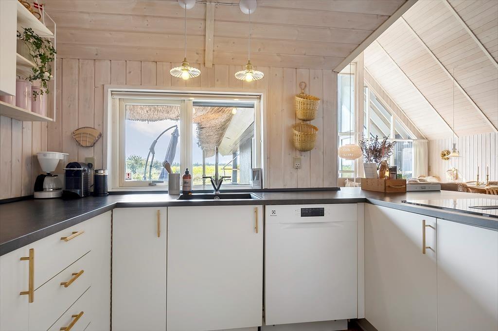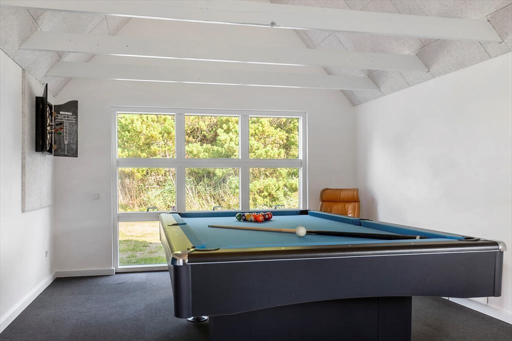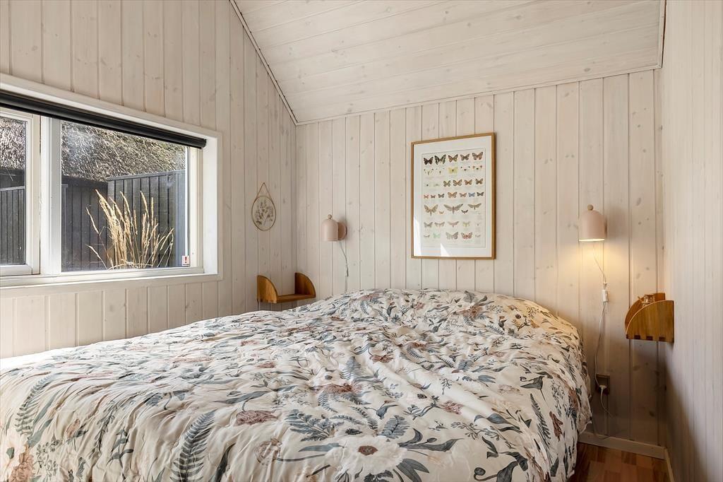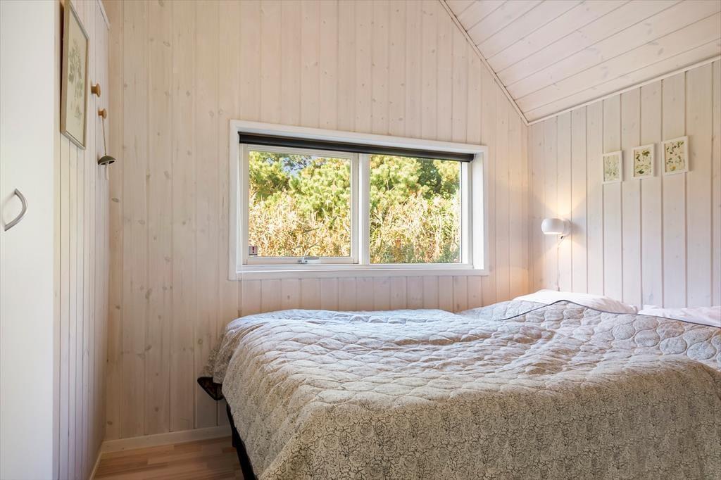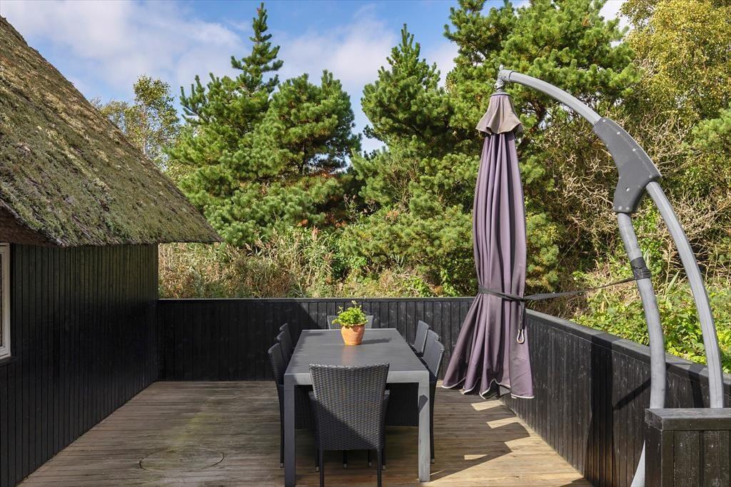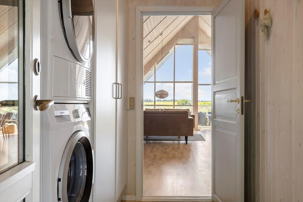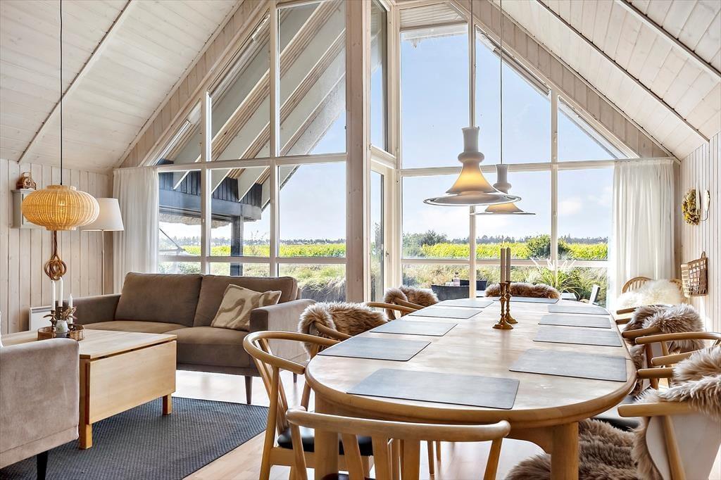 På den store, delvist overdækkede terrasse kan du slå dig ned og nyde udsigten over de åbne marker i retning mod Sønderstrand. På stille dage kan du endda høre havets bølger bruse i det fjerne – et soundtrack, der gør feriestunderne ekstra særlige. Her er god plads til både fælles måltider under åben himmel og rolige øjeblikke med sol på næsen. Fra huset er der desuden kort vej til Vråby Plantage, hvor du kan gå lange ture ad de snoede stier. Har du hunden med, er den indhegnede hundeskov et sikkert hit, for her kan din firbenede ven løbe frit og lege uden snor.