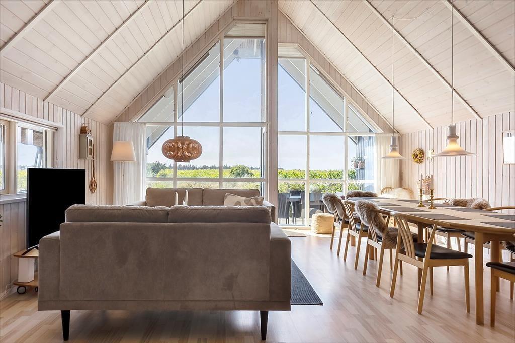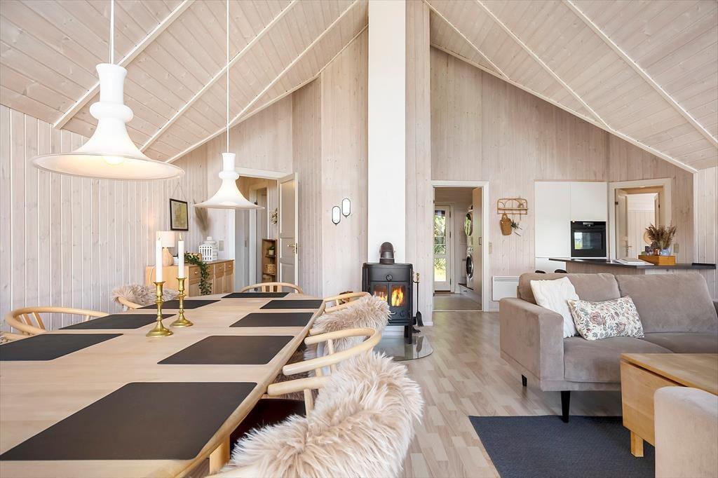 Allerede når du træder ind i huset, mærker du den åbne og særlige atmosfære. Det markante loft til kip rejser sig smukt mod de store vinduespartier, så lyset strømmer uhindret ind og giver en følelse af at være midt i landskabet, selv når du sidder i sofaen med en kop kaffe eller en god bog. De skrå lofter og det generøse rumforløb skaber en spændende arkitektur, som giver både luft og varme til indretningen. Huset byder på to moderne badeværelser, og efter en dag fuld af udflugter kan du forkæle dig selv med en tur i saunaen eller et afslappende boblebad i spabadet. Køkkenet er funktionelt og veludstyret, så du nemt kan tilberede alt fra hurtige frokoster til hyggelige feriemiddage.