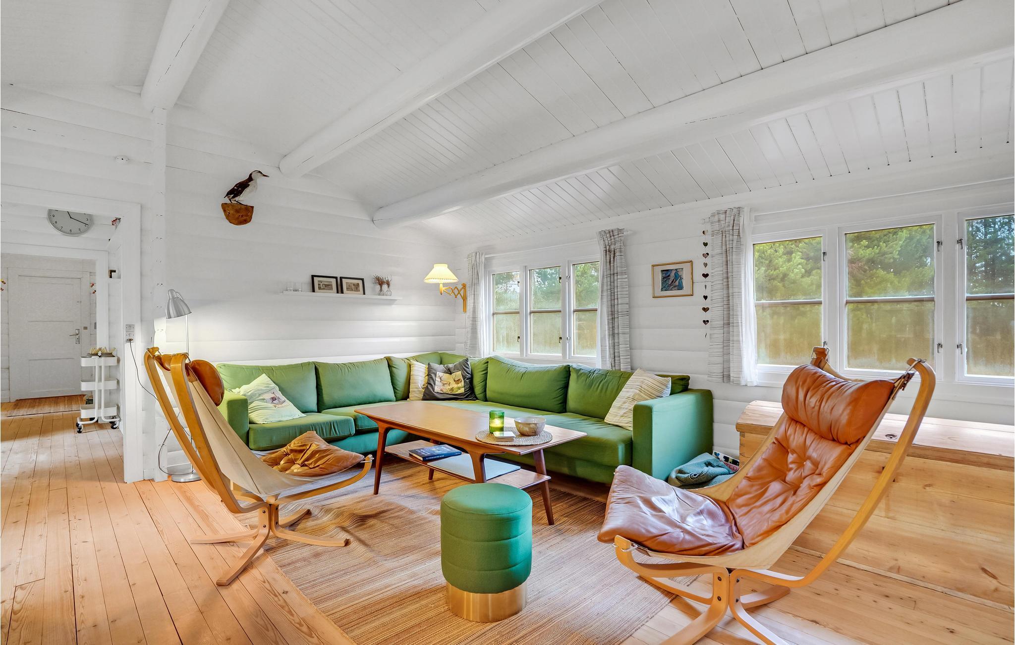 Dette smagfulde feriehus ligger på en fredet naturgrund og ligger med en varm og hyggelig atmosfære. Tilbered lækre retter i det lyse køkken og tag plads i den indbydende spiseplads. Hyg jer i det fristende sofalandskab til en harmonisk spilleaften eller fordyb jer i en spændende bog i de behagelige læsestole, mens brændeovnen knitrer stille og roligt.