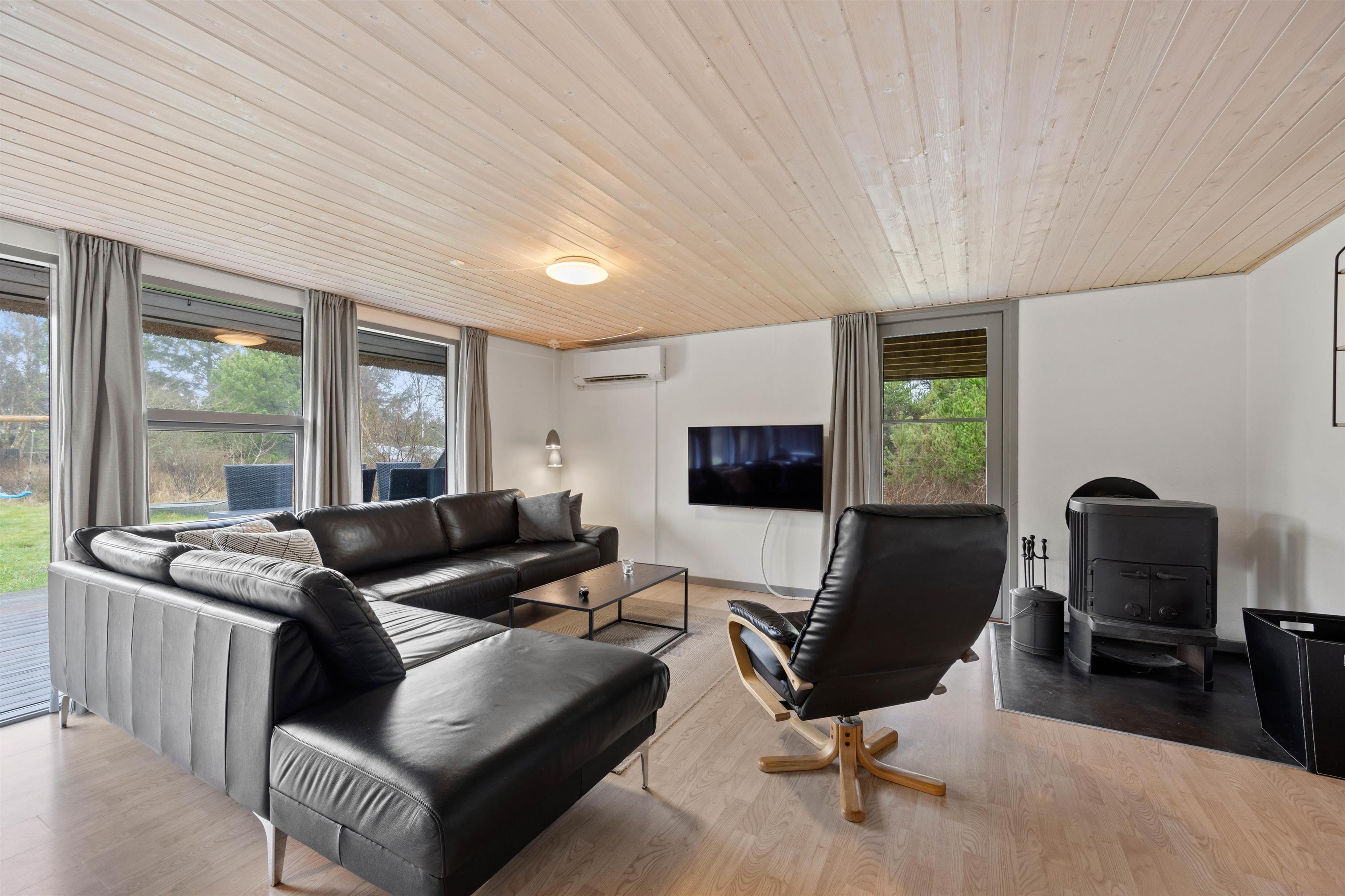 I stuen er der brændeovn, som ikke blot spreder varme, men også en ekstra hyggelig feriestemning. Her er desuden en energibesparende varmepumpe, som I med fordel kan benytte jer af.